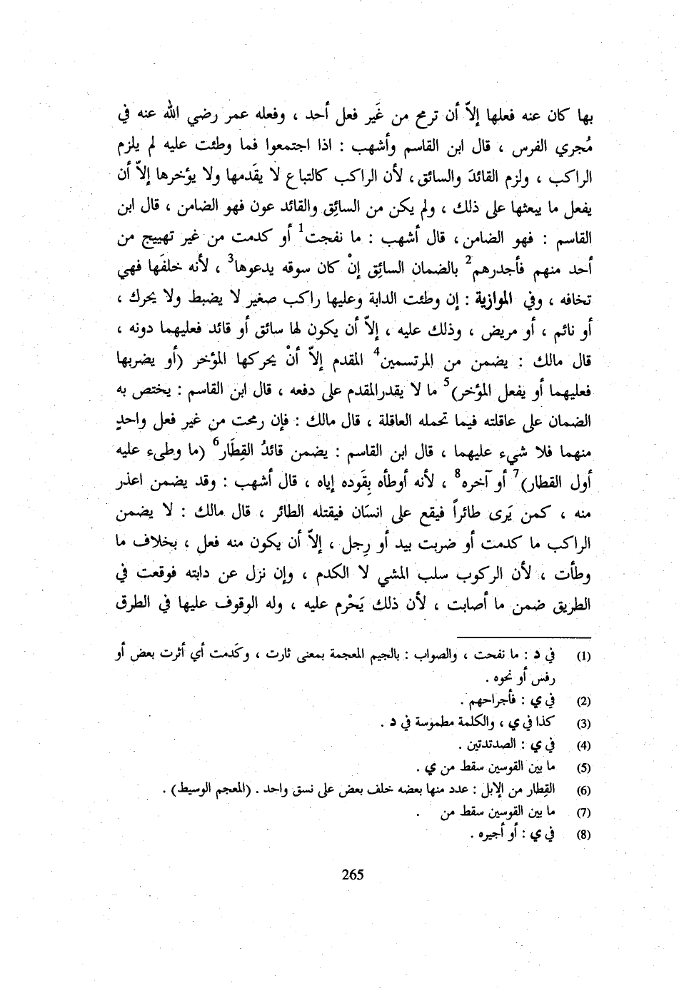 بِهَا كَانَ عَنْهُ فِعْلُهَا إِلَّا أَنْ تَرْمَحَ مِنْ غَيْرِ فِعْلِ أَحَدٍ وَفَعَلَهُ عُمَرُ رَضِيَ اللَّهُ عَنْهُ فِي مُجْرِي الْفَرَسِ قَالَ ابْنُ الْقَاسِمِ وَأَشْهَبُ إِذَا اجْتَمَعُوا فَمَا وَطِئَتْ عَلَيْهِ لَمْ يَلْزَمِ الرَّاكِبَ وَلَزِمَ الْقَائِدَ وَالسَّائِقَ لِأَنَّ الرَّاكِب كالتباع لَا يُقَدِّمُهَا وَلَا يُؤَخِّرُهَا إِلَّا أَنْ يَفْعَلَ مَا يبعها عَلَى ذَلِكَ وَلَمْ يَكُنْ مِنَ السَّائِقِ وَالْقَائِدِ عون فَهُوَ الضَّامِن قَالَ ابْنُ الْقَاسِمِ فَهُوَ الضَّامِنُ قَالَ أَشْهَبُ مَا نَفَجَتْ أَوْ كَدَمَتْ مِنْ غَيْرِ تَهْيِيجٍ من أحد مِنْهُم فأجدرهم بِالضَّمَانِ السَّائِق إِن كَانَ سوقه يدعوها لِأَنَّهُ خَلْفَهَا فَهِيَ تَخَافُهُ وَفِي الْمَوَّازِيَّةِ إِنْ وَطِئَتِ الدَّابَّةُ وَعَلَيْهَا رَاكِبٌ صَغِيرٌ لَا يَضْبُطُ وَلَا يُحَرك أَو نَائِم أَو مَرِيض وَذَلِكَ عَلَيْهِ إِلَّا أَنْ يَكُونَ لَهَا سَائِقٌ أَوْ قَائِدٌ فَعَلَيْهِمَا دُونَهُ قَالَ مَالِكٌ يَضْمَنُ مِنَ المرتسمين الْمُقَدَّمُ إِلَّا أَنْ يُحَرِّكَهَا الْمُؤَخِّرُ (أَوْ يَضْرِبَهَا فَعَلَيْهِمَا أَوْ يَفْعَلَ الْمُؤَخِّرُ) مَا لَا يَقْدِرُ الْمُقَدِّمُ عَلَى دَفْعِهِ قَالَ ابْنُ الْقَاسِمِ يَخْتَصُّ بِهِ الضَّمَانُ عَلَى عَاقِلَتِهِ فِيمَا تَحْمِلُهُ الْعَاقِلَةُ قَالَ مَالِكٌ فَإِنْ رَمَحَتْ مِنْ غَيْرِ فِعْلِ وَاحِدٍ مِنْهُمَا فَلَا شَيْءَ عَلَيْهِمَا قَالَ ابْنُ الْقَاسِم يضمن قَائِد القطار (مَا وطىء عَلَيْهِ أَو الْقِطَارُ) أَوْ آخِرِهُ لِأَنَّهُ أَوْطَأَهُ بِقَوْدِهِ إِيَّاهُ قَالَ أَشْهَبُ وَقَدْ يَضْمَنُ أَعْذَرَ مِنْهُ كَمَنْ يَرَى طَائِرًا فَيَقَعُ عَلَى إِنْسَانٍ فَيُقْتُلُهُ الطَّائِرُ قَالَ مَالِكٌ لَا يَضْمَنُ الرَّاكِبُ مَا كَدَمَتْ أَوْ ضَرَبَتْ بِيَدٍ أَوْ رِجْلٍ إِلَّا أَنْ يَكُونَ مِنْهُ فِعْلٌ بِخِلَافِ مَا وَطِأَتْ لِأَنَّ الرّكُوب سلب الْمَشْيِ لَا الْكَدْمَ وَإِنْ نَزَلَ عَنْ دَابَّتِهِ فَوَقَعت فِي الطَّرِيقِ ضَمِنَ مَا أَصَابَتْ لِأَنَّ ذَلِكَ يَحْرُمُ عَلَيْهِ وَلَهُ الْوُقُوفُ عَلَيْهَا فِي الطُّرُقِ