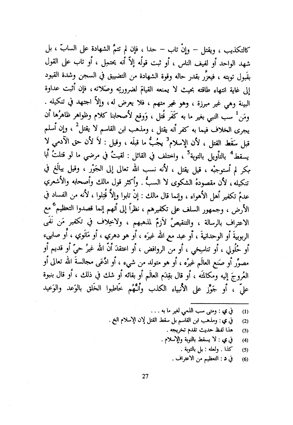 كَالتَّكْذِيبِ وَيُقْتَلُ وَإِنْ تَابَ حَدًّا فَإِنْ لَمْ تَتِمَّ الشَّهَادَةُ عَلَى السَّابِّ بَلْ شَهِدَ الْوَاحِدُ أَوْ لَفِيفُ النَّاسِ أَوْ ثَبَتَ قَوْلُهُ إِلَّا أَنَّهُ يَحْتَمِلُ أَوْ تَابَ عَلَى الْقَوْلِ بِقَبُولِ تَوْبَته فيعزر بِقَدْرِ حَالِهِ وَقُوَّةِ الشَّهَادَةِ مِنَ التَّضْيِيقِ فِي السحن وَشِدَّةِ الْقُيُودِ إِلَى غَايَةِ انْتِهَاءِ طَاقَتِهِ بِحَيْثُ لَا يَمْنَعُهُ الْقِيَامَ لِضَرُورَتِهِ وَصَلَاتِهِ فَإِنْ أَثْبَتَ عَدَاوَةَ الْبَيِّنَةِ وَهِيَ غَيْرُ مُبْرَزَةٍ وَهُوَ غَيْرُ مُتَّهَمٍ فَلَا يُعْرَضُ لَهُ وَإِلَّا اجْتُهِدَ فِي تَنْكِيلِهِ وَمَنْ سَبَّ النَّبِيَّ بِغَيْرِ مَا بِهِ كَفَرَ قُتِلَ وَوَقَعَ لِأَصْحَابِنَا كَلَامٌ وَظَوَاهِرُ ظَاهِرِهَا أَنْ يَجْرِيَ الْخِلَافُ فِيمَا بِهِ كَفَرَ أَنَّهُ يُقْتَلُ وَمَذْهَبُ ابْنِ الْقَاسِمِ لَا يُقْتَلُ وَإِنْ أَسْلَمَ قَبْلُ سَقَطَ الْقَتْلُ لِأَنَّ الْإِسْلَامَ يَجُبُّ مَا قَبْلَهُ وَقِيلَ لَا لِأَنَّ حَقَّ الْآدَمِيِّ لَا يَسْقُطُ بِالتَّأْوِيلِ بِالتَّوْبَةِ وَاخْتُلِفَ فِي الْقَائِلِ لَقِيتُ فِي مَرَضِي مَا لَوْ قَتَلْتُ أَبَا بَكْرٍ لَمْ أَسْتَوْجِبْهُ قِيلَ يُقْتَلُ لِأَنَّهُ نَسَبَ اللَّهَ تَعَالَى إِلَى الْجَوْرِ وَقِيلَ يُبَالَغُ فِي تَنْكِيلِهِ لِأَنَّ مَقْصُودَهُ الشَّكْوَى لَا السَّبُّ وَأَكْثَرُ قَوْلِ مَالِكٍ وَأَصْحَابِهِ وَالْأَشْعَرِيِّ عَدَمُ تَكْفِيرِ أَهْلِ الْأَهْوَاءِ وَإِنَّمَا قَالَ مَالِكٌ إِنْ تَابُوا وَإِلَّا قُتِلُوا لِأَنَّهُ مِنَ الْفَسَادِ فِي الْأَرْضِ وَجُمْهُورُ السَّلَفِ عَلَى تَكْفِيرِهِمْ نَظَرًا إِلَى أَنَّهُمْ إِنَّمَا قَصَدُوا التَّعْظِيمَ مَعَ الِاعْتِرَافِ بِالرِّسَالَةِ وَالتَّنْقِيصُ لَازِمٌ لمذهبهم وَلَا خِلَافَ فِي تَكْفِيرِ مَنْ نَفَى الرُّبُوبِيَّةَ أَوِ الْوَحْدَانِيَّةَ أَوْ عَبَدَ مَعَ اللَّهِ غَيْرَهُ أَوْ هُوَ دَهْرِيٌّ أَوْ مَانَوِيٌّ أَوْ صَابِئٌ أَوْ حُلُولِيٌّ أَوْ تَنَاسُخِيٌّ أَوْ مِنَ الرَّوَافِضِ أَوِ اعْتَقَدَ أَنَّ اللَّهَ غَيْرُ حَيٍّ أَوْ قَدِيمٍ أَوْ مُصَوَّرٍ أَوْ صَنَعَ الْعَالَمَ غَيْرُهُ أَوْ هُوَ مُتَوَلِّدٌ مِنْ شَيْءٍ أَوِ ادَّعَى مُجَالَسَةَ اللَّهِ تَعَالَى أَوِ الْعُرُوجَ إِلَيْهِ وَمُكَالَمَتَهُ أَوْ قَالَ بِقِدَمِ الْعَالَمِ أَوْ بَقَائِهِ أَوْ شَكَّ فِي ذَلِكَ أَوْ قَالَ بِنُبُوَّةِ عَلِيٍّ أَوْ جَوَّزَ عَلَى الْأَنْبِيَاءِ الْكَذِبَ وَأَنَّهُمْ خَاطَبُوا الْخَلْقَ بِالْوَعْدِ وَالْوَعِيدِ