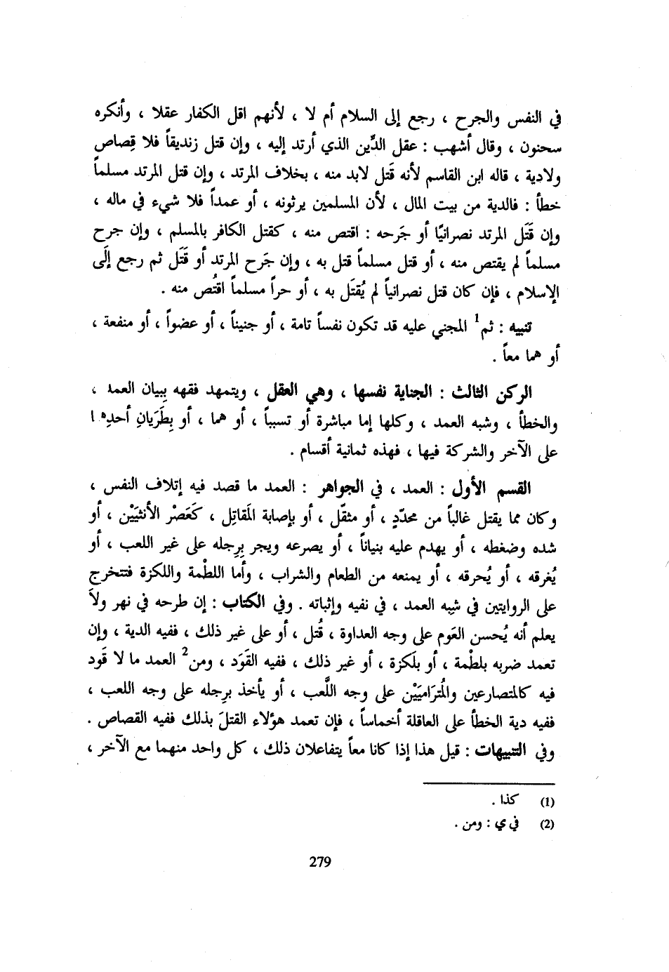 فِي النَّفس وَالْجرْح رَجَعَ إِلَى السَّلَام أَمْ لَا لِأَنَّهُمْ أَقَلُّ الْكُفَّارِ عَقْلًا وَأَنْكَرَهُ سَحْنُونٌ وَقَالَ أَشْهَبُ عَقْلُ الدِّينِ الَّذِي ارْتَدَّ إِلَيْهِ وَإِن قتل زنديقا فر قِصَاصَ وَلَا دِيَةَ قَالَه ابْنُ الْقَاسِمِ لِأَنَّهُ قتل لابد مِنْهُ بِخِلَافِ الْمُرْتَدِّ وَإِنْ قَتَلَ الْمُرْتَدُّ مُسْلِمًا خَطَأً فَالدِّيَةُ مِنْ بَيْتِ الْمَالِ لِأَنَّ الْمُسْلِمِينَ يَرِثُونَهُ أَوْ عَمْدًا فَلَا شَيْءَ فِي مَالِهِ وَإِنْ قَتَلَ الْمُرْتَدُّ نَصْرَانِيًّا أَوْ جَرَحَهُ اقْتُصَّ مِنْهُ كَقَتْلِ الْكَافِرِ بِالْمُسْلِمِ وَإِنْ جَرَحَ مُسْلِمًا لَمْ يُقْتَصَّ مِنْهُ أَوْ قَتَلَ مُسْلِمًا قُتِلَ بِهِ وَإِنْ جَرَحَ الْمُرْتَدُّ أَوْ قَتَلَ ثُمَّ رَجَعَ إِلَى الْإِسْلَامِ فَإِنْ كَانَ قَتَلَ نَصْرَانِيًّا لَمْ يُقْتَلْ بِهِ أَوْ حُرًّا مُسْلِمًا اقْتُصَّ مِنْهُ تَنْبِيهٌ ثُمَّ الْمَجْنِيُّ عَلَيْهِ قَدْ تَكُونُ نَفْسًا تَامَّةً أَوْ جَنِينًا أَوْ عُضْوًا أَوْ مَنْفَعَةً أَوْ هُمَا مَعًا