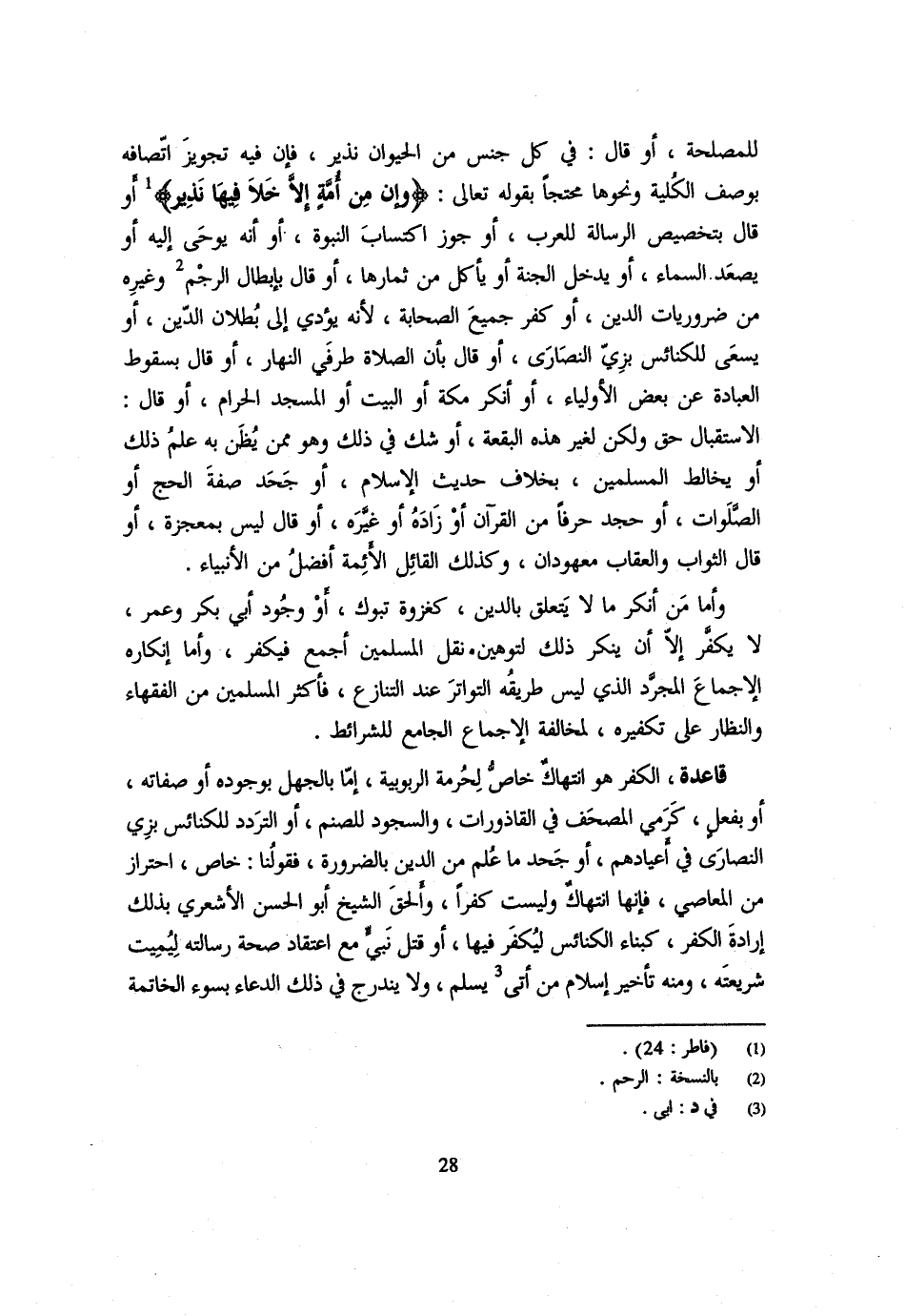 لِلْمَصْلَحَةِ أَوْ قَالَ فِي كُلِّ جِنْسٍ مِنَ الْحَيَوَانِ نَذِيرٌ فَإِنَّ فِيهِ تَجْوِيزُ اتِّصَافِهِ بِوَصْفِ الْكُلِّيَّةِ وَنَحْوِهَا مُحْتَجًّا بِقَوْلِهِ تَعَالَى {وَإِنْ مِنْ أمة إِلَّا خلا فِيهَا نَذِير} أَوْ قَالَ بِتَخْصِيصِ الرِّسَالَةِ لِلْعَرَبِ أَوْ جَوَّزَ اكْتِسَابَ النُّبُوَّةِ أَوْ أَنَّهُ يُوحَى إِلَيْهِ أَوْ يَصْعَدُ السَّمَاءَ أَوْ يَدْخُلُ الْجَنَّةَ أَوْ يَأْكُلُ مِنْ ثِمَارِهَا أَوْ قَالَ بِإِبْطَالِ الرَّجْمِ وَغَيْرِهِ مِنْ ضَرُورِيَّاتِ الدِّينِ أَوْ كَفَّرَ جَمِيعَ الصَّحَابَةِ لِأَنَّهُ يُؤَدِّي إِلَى بُطْلَانِ الدِّينِ أَوْ يَسْعَى لِلْكَنَائِسِ بِزِيِّ النَّصَارَى أَوْ قَالَ بِأَنَّ الصَّلَاةَ طرقي النَّهَارِ أَوْ قَالَ بِسُقُوطِ الْعِبَادَةِ عَنْ بَعْضِ الْأَوْلِيَاءِ أَوْ أَنْكَرَ مَكَّةَ أَوِ الْبَيْتَ أَوِ الْمَسْجِدَ الْحَرَامَ أَوْ قَالَ الِاسْتِقْبَالُ حَقٌّ وَلَكِنْ لِغَيْرِ هَذِهِ الْبُقْعَةِ أَوْ شَكَّ فِي ذَلِكَ وَهُوَ مِمَّنْ يُظَنُّ بِهِ عِلْمُ ذَلِكَ أَوْ يُخَالِطُ الْمُسْلِمِينَ بِخِلَافِ حَدِيثِ الْإِسْلَامِ أَوْ جَحَدَ صِفَةَ الْحَجِّ أَوِ الصَّلَوَاتِ أَوْ جَحَدَ حَرْفًا مِنَ الْقُرْآنِ أَوْ زَادَهُ أَوْ غَيَّرَهُ أَوْ قَالَ لَيْسَ بِمُعْجِزَةٍ أَوْ قَالَ الثَّوَابُ وَالْعِقَابُ مَعْهُودَانِ وَكَذَلِكَ الْقَائِلُ الْأَئِمَّةُ أَفْضَلُ مِنَ الْأَنْبِيَاءِ وَأَمَّا مَنْ أَنْكَرَ مَا لَا يَتَعَلَّقُ بِالدِّينِ كَغَزْوَةِ تَبُوكَ أَوْ وُجُودِ أَبِي بَكْرٍ وَعُمَرَ لَا يُكَفَّرُ إِلَّا أَنْ يُنْكِرَ ذَلِكَ لِتَوْهِينِ نَقْلِ الْمُسْلِمِينَ أَجْمَعَ فَيُكَفَّرُ وَأَمَّا إِنْكَارُهُ الْإِجْمَاعَ الْمُجَرَّدَ الَّذِي لَيْسَ طَرِيقُهُ التَّوَاتُرَ عِنْدَ التَّنَازُعِ فَأَكْثَرُ الْمُسْلِمِينَ مِنَ الْفُقَهَاءِ وَالنُّظَّارِ عَلَى تَكْفِيرِهِ لِمُخَالَفَةِ الْإِجْمَاعِ الْجَامِعِ لِلشَّرَائِطِ