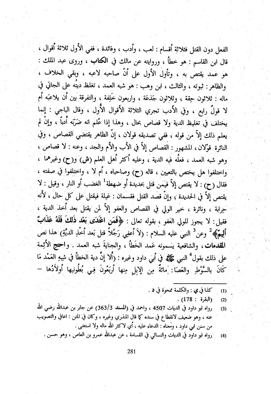 الْفِعْلَ دُونَ الْقَتْلِ فَثَلَاثَةُ أَقْسَامٍ لَعِبٌ وَأَدَبٌ وَفَائِدَة فَفِي الول ثَلَاثَة أَقْوَال قَالَ ابْن الفقاسم هُوَ خَطَأٌ وَرِوَايَتُهُ عَنْ مَالِكٍ فِي الْكِتَابِ وَرُوِيَ عبد الْملك عوم عِنْد يُقْتَصُّ بِهِ وَتَأَوَّلَ الْأَوَّلُ عَلَى أَنَّ صَاحِبَهُ لَاعَبَهُ وَبَقِيَ الْخِلَافُ وَالظَّاهِرُ ثُبُوتُهُ وَالثَّالِثُ ابْنُ وهب هُوَ شبه الْعمد تفلظ دِيَتُهُ عَلَى الْجَانِي فِي مَالِهِ ثَلَاثُونَ حِقَّةً وَثَلَاثُونَ جَذَعَةً وَأَرْبَعُونَ خَلِفَةً وَالتَّفْرِقَةُ بَيْنَ أَنْ يلاعبه أم لَا قَول رَابِع وَفِي الدب تَجْرِي الثَّلَاثَةُ الْأَقْوَالِ الْأُوَلِ وَقَالَ الْبَاجِيُّ إِنَّمَا يُخْتَلَفُ فِي تَغْلِيظِ الدِّيَةِ وَلَا قِصَاصَ بِحَالٍ وَهَذَا إِذَا عُلِمَ أَنَّهُ ضَرَبَهُ أَدَبًا وَإِنْ لَمْ يُعْلَمْ ذَلِكَ إِلَّا مِنْ قَوْلِهِ فَفِي تَصْدِيقِهِ قَوْلَانِ إِنَّ الظَّاهِرَ يَقْتَضِي الْقِصَاصَ وَفِي النَّائِرَةِ قَوْلَانِ الْمَشْهُورُ الْقِصَاصُ إِلَّا فِي الْأَبِ وَالْأُمِّ وَالْجَدِّ وَعَنْهُ لَا قِصَاصَ وَهُوَ شِبْهُ الْعمد فعله فِيهِ الدِّيَةُ وَعَلَيْهِ أَكْثَرُ أَهْلِ الْعِلْمِ (ش) وَ (ح) وَغَيْرُهُمَا وَاخْتَلَفُوا هَلْ يَخْتَصُّ بِالتَّعْيِينِ قَالَهُ (ح) وَصَاحِبَاهُ أَمْ لَا وَاخْتَلَفُوا فِي صِفَتِهِ فَقَالَ (ح) لَا يُقْتَصُّ إِلَّا فِيمَنْ قتل بحديدة أَو ضهطة الْغَضَب أَوِ النَّارِ وَقِيلَ لَا يُقْتَصُّ إِلَّا فِي الْحَدِيدَةِ وَإِنْ قَصَدَ الْقَتْلَ فَقِسْمَانِ غِيلَةً فَيُقْتَلُ عَلَى كُلِّ حَالٍ لِأَنَّهُ حِرَابَةٌ وَنَائِرَةٌ خُيِّرَ الْوَلِيُّ فِي الْقِصَاصِ وَالْعَفْوِ إِلَّا لِمَنْ يُقْتَلُ بَعْدَ أَخْذِ الدِّيَةِ فَقِيلَ لَا يَجُوزُ لِلْوَلِيِّ الْعَفو بقوله {فَمَنِ اعْتَدَى بَعْدَ ذَلِكَ فَلَهُ عَذَابٌ أَلِيمٌ} وَعَنِ النَّبِيِّ عَلَيْهِ السَّلَامُ (لَا أُعْفِي رَجُلًا قَتَلَ بَعْدَ أَخْذِ الدِّيَةِ) هَذَا نَصُّ الْمُقَدِّمَاتِ وَالشَّافِعِيَّة يسمونه عمد الْخَطَأ وَالْجِنَايَة شبه الْعمد \ وَاحْتج الْأَئِمَّةُ عَلَى ذَلِكَ بِقَوْلِ النَّبِيِّ - صَلَّى اللَّهُ عَلَيْهِ وَسَلَّم َ - فِي أَبِي دَاوُدَ وَغَيْرِهِ (أَلَا إِنَّ دِيَةَ الْخَطَأ فِي شبه الْعمد كَانَ بِالسَّوْطِ وَالْعَصَا مِائَةٌ مِنَ الْإِبِلِ مِنْهَا أَرْبَعُونَ فِي بطونها أَوْلَادهَا