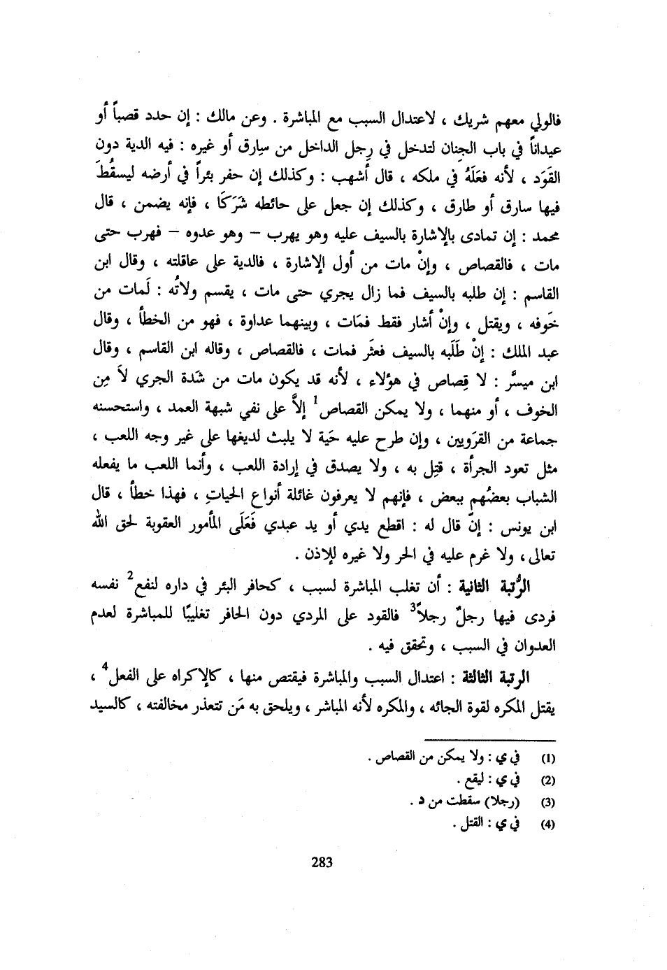 فالولي مَعَهم شريك لاعتدال السَّبَب الْمُبَاشرَة إِنْ حَدَّدَ قَصَبًا أَوْ عِيدَانًا فِي بَابِ الْجنان لتدخل فِي رجل الدَّاخِلِ مِنْ سَارِقٍ أَوْ غَيْرِهِ فِيهِ الدِّيَةُ دُونَ الْقَوَدِ لِأَنَّهُ فَعَلَهُ فِي مِلْكِهِ قَالَ أَشْهَبُ وَكَذَلِكَ إِنْ حَفَرَ بِئْرًا فِي أَرْضِهِ لِيَسْقُطَ فِيهَا سَارِقٌ أَوْ طَارِقٌ وَكَذَلِكَ إِنْ جَعَلَ عَلَى حَائِطِهِ شَرَكًا فَإِنَّهُ يَضْمَنُ قَالَ مُحَمَّدٌ إِنْ تَمَادَى بِالْإِشَارَةِ بِالسَّيْفِ عَلَيْهِ وَهُوَ يَهْرُبُ وَهُوَ عَدُوُّهُ فَهَرَبَ حَتَّى مَاتَ فَالْقِصَاصُ وَإِنْ مَاتَ مِنْ أَوَّلِ الْإِشَارَةِ فَالدِّيَةُ عَلَى عَاقِلَتِهِ وَقَالَ ابْنُ الْقَاسِمِ إِنْ طَلَبَهُ بِالسَّيْفِ فَمَا زَالَ يَجْرِي حَتَّى مَاتَ يُقْسِمُ وُلَاتُهُ لَمَاتَ مِنْ خَوْفِهِ وَيُقْتَلُ وَإِنْ أَشَارَ فَقَطْ فَمَاتَ وَبَيْنَهُمَا عَدَاوَةٌ فَهُوَ مِنَ الْخَطَأِ وَقَالَ عَبْدُ الْمَلِكِ إِنْ طَلَبَهُ بِالسَّيْفِ فَعَثَرَ فَمَاتَ فَالْقِصَاصُ وَقَالَهُ ابْنُ الْقَاسِمِ وَقَالَ ابْنُ مُيَسَّرٍ لَا قِصَاصَ فِي هَؤُلَاءِ لِأَنَّهُ قَدْ يَكُونُ مَاتَ مِنْ شِدَّةِ الْجَرْيِ لَا مِنَ الْخَوْفِ أَوْ مِنْهُمَا وَلَا يُمْكِنُ الْقِصَاصُ إِلَّا عَلَى نَفْيِ شُبْهَةِ الْعَمْدِ وَاسْتَحْسَنَهُ جَمَاعَةٌ مِنَ الْقَرَوِيِّينَ وَإِنْ طَرَحَ عَلَيْهِ حَيَّةً لَا يَلْبَثُ لَدِيغُهَا عَلَى غَيْرِ وَجْهِ اللَّعِبِ مِثْلَ تَعَوُّدِ الْجُرْأَةِ قُتِلَ بِهِ وَلَا يُصَدَّقُ فِي إِرَادَةِ اللَّعِبِ وَإِنَّمَا اللَّعِبُ مَا يَفْعَلُهُ الشَّبَابُ بَعْضُهُمْ بِبَعْضٍ فَإِنَّهُمْ لَا يَعْرِفُونَ غَائِلَةَ أَنْوَاعِ الْحَيَّاتِ فَهَذَا خَطَأٌ قَالَ ابْنُ يُونُسَ إِنْ قَالَ لَهُ اقْطَعْ يَدِي أَوْ يَدَ عَبْدِي فَعَلَى الْمَأْمُورِ الْعُقُوبَةُ لِحَقِّ اللَّهِ تَعَالَى وَلَا غُرْمَ عَلَيْهِ فِي الْحُرِّ وَلَا غَيْرِهِ لِلْإِذْنِ الرُّتْبَةُ الثَّانِيَةُ أَنْ تَغْلِبَ الْمُبَاشَرَةُ لِسَبَبٍ كَحَافِرِ الْبِئْرِ فِي دَاره لنفع نَفسه فردى فِيهَا رَجُلًا فَالْقَوَدُ عَلَى الْمَرَدِّي دُونَ الْحَافِرِ تَغْلِيبًا لِلْمُبَاشَرَةِ لِعَدَمِ الْعُدْوَانِ فِي السَّبَبِ وَتَحَقَّقْ فِيهِ الرُّتْبَةُ الثَّالِثَةُ اعْتِدَالُ السَّبَبِ وَالْمُبَاشَرَةِ فَيُقْتَصُّ مِنْهَا كَالْإِكْرَاهِ عَلَى الْفِعْلِ يُقْتَلُ الْمُكْرِهُ لِقُوَّةِ إِلْجَائِهِ وَالْمُكْرَهُ لِأَنَّهُ الْمُبَاشِرُ وَيَلْحَقُ بِهِ مَنْ تَتَعَذَّرُ مُخَالفَته كالسيد