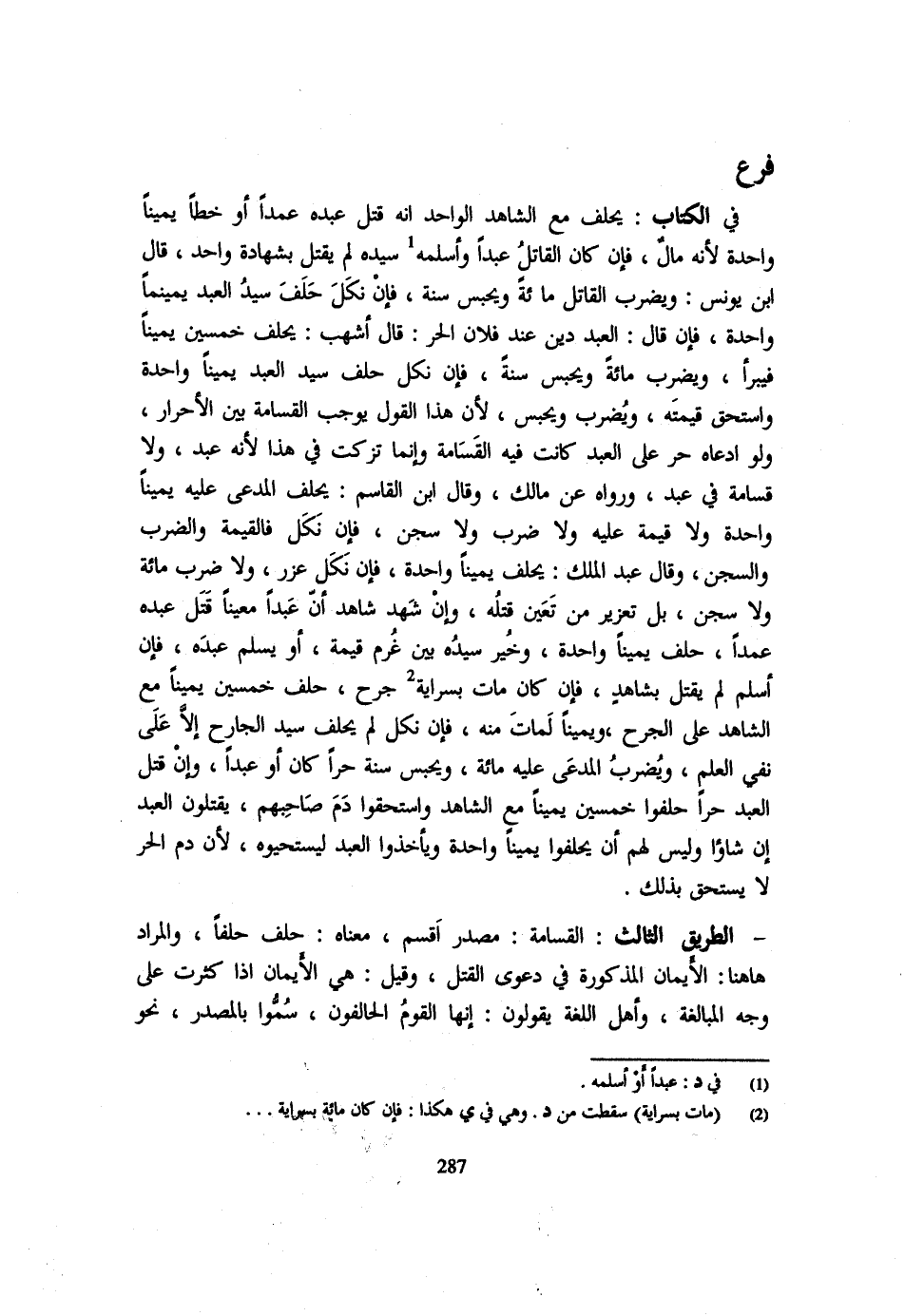 فَرْعٌ فِي الْكِتَابِ يَحْلِفُ مَعَ الشَّاهِدِ الْوَاحِدِ أَنَّهُ قَتَلَ عَبْدَهُ عَمْدًا أَوْ خَطَأً يَمِينًا وَاحِدَةً لِأَنَّهُ مَالٌ فَإِنْ كَانَ الْقَاتِلُ عَبْدًا وَأَسْلَمَهُ سَيِّدُهُ لَمْ يُقْتَلْ بِشَهَادَةِ وَاحِدٍ قَالَ ابْنُ يُونُسَ وَيُضْرَبُ الْقَاتِلُ مِائَةً وَيُحْبَسُ سَنَةً فَإِنْ نَكَلَ حَلَفَ سَيِّدُ الْعَبْدِ يَمِينًا وَاحِدَةً فَإِنْ قَالَ الْعَبْدُ دَيْنٌ عِنْدَ فُلَانٍ الْحُرِّ قَالَ أَشْهَبُ يَحْلِفُ خَمْسِينَ يَمِينًا فَيَبْرَأُ وَيُضْرَبُ مِائَةً وَيُحْبَسُ سَنَةً فَإِنْ نَكَلَ حَلَفَ سَيِّدُ الْعَبْدِ يَمِينًا وَاحِدَةً وَاسْتَحَقَّ قِيمَتَهُ وَيُضْرَبُ وَيُحْبَسُ لِأَنَّ هَذَا الْقَوْلَ يُوجِبُ الْقَسَامَةَ بَيْنَ الْأَحْرَارِ وَلَوِ ادَّعَاهُ حُرٌّ عَلَى الْعَبْدِ كَانَتْ فِيهِ الْقَسَامَةُ وَإِنَّمَا تَزَكَّتْ فِي هَذَا لِأَنَّهُ عَبْدٌ وَلَا قَسَامَةَ فِي عَبْدٍ وَرَوَاهُ عَنْ مَالِكٍ وَقَالَ ابْنُ الْقَاسِمِ يَحْلِفُ الْمُدَّعَى عَلَيْهِ يَمِينًا وَاحِدَةً وَلَا قِيمَةَ عَلَيْهِ وَلَا ضَرْبَ وَلَا سَجْنَ فَإِنْ نَكَلَ فَالْقِيمَةُ وَالضَّرْبُ وَالسَّجْنُ وَقَالَ عَبْدُ الْمَلِكِ يَحْلِفُ يَمِينًا وَاحِدَةً فَإِنْ نَكَلَ عُزِّرَ وَلَا ضَرْبُ مِائَةٍ وَلَا سَجْنٌ بَلْ تَعْزِيرُ مَنْ تَعَيَّنَ قَتْلُهُ وَإِنْ شَهِدَ شَاهِدٌ أَنَّ عَبْدًا مُعَيَّنًا قَتَلَ عَبْدَهُ عَمْدًا حَلَفَ يَمِينًا وَاحِدَةً وَخُيِّرَ سَيِّدُهُ بَيْنَ غُرْمِ قِيمَةِ أَوْ يُسْلِمُ عَبْدَهُ فَإِنْ أَسْلَمَ لَمْ يُقْتَلْ بِشَاهِدٍ فَإِنْ كَانَ مَاتَ بِسِرَايَةِ جُرْحٍ حَلَفَ خَمْسِينَ يَمِينًا مَعَ الشَّاهِدِ عَلَى الْجُرْحِ وَيَمِينًا لَمَاتَ مِنْهُ فَإِنْ نَكَلَ لَمْ يَحْلِفْ سَيِّدُ الْجَارِحِ إِلَّا عَلَى نَفْيِ الْعِلْمِ وَيُضْرَبُ الْمُدَّعَى عَلَيْهِ مِائَةً وَيُحْبَسُ سَنَةً حُرًّا كَانَ أَوْ عَبْدًا وَإِنْ قَتَلَ الْعَبْدُ حُرًّا حَلَفُوا خَمْسِينَ يَمِينًا مَعَ الشَّاهِدِ وَاسْتَحَقُّوا دَمَ صَاحِبِهِمْ يَقْتُلُونَ الْعَبْدَ إِنْ شَاءُوا وَلَيْسَ لَهُمْ أَنْ يَحْلِفُوا يَمِينًا وَاحِدَةً وَيَأْخُذُوا الْعَبْدَ لِيَسْتَحْيُوهُ لِأَنَّ دَمَ الْحُرِّ لَا يُسْتَحَقُّ بِذَلِكَ الطَّرِيقُ الثَّالِثُ الْقَسَامَةُ مصدر اقْسمْ مَعْنَاهُ حلم حَلِفًا وَالْمُرَادُ هَاهُنَا الْأَيْمَانُ الْمَذْكُورَةُ فِي دَعْوَى الْقَتْلِ وَقِيلَ هِيَ الْأَيْمَانُ إِذَا كَثُرَتْ عَلَى وَجْهِ الْمُبَالَغَةِ وَأَهْلُ اللُّغَةِ يَقُولُونَ إِنَّهَا الْقَوْمُ الْحَالِفُونَ سُمُّوا بِالْمَصْدَرِ نَحْوَ