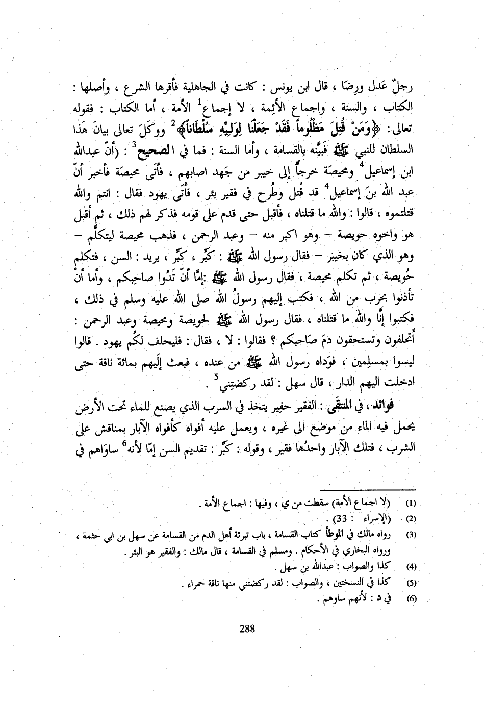 رَجُلٍ عَدْلٍ وَرِضًا قَالَ ابْنُ يُونُسَ كَانَتْ فِي الْجَاهِلِيَّةِ فَأَقَرَّهَا الشَّرْعُ وَأَصْلُهَا الْكِتَابُ وَالسُّنَّةُ وَإِجْمَاعُ الْأَئِمَّةِ لَا إِجْمَاعُ الْأَمَّةِ أَمَّا الْكِتَابُ فَقَوْلُهُ تَعَالَى {وَمَنْ قُتِلَ مَظْلُومًا فَقَدْ جَعَلْنَا لوَلِيِّه سُلْطَانا} وَوَكَّلَ تَعَالَى بَيَانَ هَذَا السُّلْطَانِ لِلنَّبِيِّ - صَلَّى اللَّهُ عَلَيْهِ وَسَلَّم َ - فَبَيَّنَهُ بِالْقَسَامَةِ وَأَمَّا السُّنَّةُ فَمَا فِي الصَّحِيحِ (أَن عبد الله ابْن إِسْمَاعِيل وَمُحَيِّصَةَ خَرَجَا إِلَى خَيْبَرَ مِنْ جُهْدٍ أَصَابَهُمْ فَأَتَى مُحَيِّصَةُ فَأَخْبَرَ أَنَّ عَبْدَ اللَّهِ بْنَ إِسْمَاعِيل قَدْ قُتِلَ وَطُرِحَ فِي فَقِيرِ بِئْرٍ فَأَتَى يَهُودٌ فَقَالَ أَنْتُمْ وَاللَّهِ قَتَلْتُمُوهُ قَالُوا وَاللَّهِ مَا قَتَلْنَاهُ فَأَقْبَلَ حَتَّى قَدِمَ عَلَى قَوْمِهِ فَذكر لَهُم بذلك ثُمَّ أَقْبَلَ هُوَ وَأَخُوهُ حُوَيِّصَةُ وَهُوَ أَكْبَرُ مِنْهُ وَعَبْدُ الرَّحْمَنِ فَذَهَبَ مُحَيِّصَةُ لِيَتَكَلَّمَ وَهُوَ الَّذِي كَانَ بِخَيْبَرَ فَقَالَ رَسُولُ اللَّهِ - صَلَّى اللَّهُ عَلَيْهِ وَسَلَّم َ - كبر كبر يُرِيد السِّين فَتَكَلَّمَ حُوَيِّصَةُ ثُمَّ تَكَلَّمَ مُحَيِّصَةُ فَقَالَ رَسُولُ اللَّهِ - صَلَّى اللَّهُ عَلَيْهِ وَسَلَّم َ - إِمَّا أَنْ تَدُوا صَاحِبَكُمْ وَإِمَّا أَنْ تَأْذَنُوا بِحَرْبٍ مِنَ اللَّهِ فَكَتَبَ إِلَيْهِمْ رَسُولُ اللَّهِ صَلَّى اللَّهُ عَلَيْهِ وَسَلَّمَ فِي ذَلِكَ فَكَتَبُوا إِنَّا وَاللَّهِ مَا قَتَلْنَاهُ فَقَالَ رَسُولُ اللَّهِ - صَلَّى اللَّهُ عَلَيْهِ وَسَلَّم َ - لتحويصة وَمُحَيِّصَةَ وَعَبْدِ الرَّحْمَنِ أَتَحْلِفُونَ وَتَسْتَحِقُّونَ دَمَ صَاحِبِكُمْ فَقَالُوا لَا فَقَالَ فليحلف لكم يهود فَقَالُوا لَيْسُوا بِمُسْلِمِينَ فَوَدَاهُ رَسُولُ اللَّهِ - صَلَّى اللَّهُ عَلَيْهِ وَسَلَّم َ - مِنْ عِنْدِهِ فَبَعَثَ إِلَيْهِمْ بِمِائَةِ نَاقَةٍ حَتَّى أُدْخِلَتْ إِلَيْهِمُ الدَّارَ قَالَ سَهْلٌ لَقَدْ رَكَضَتْنِي فَوَائِدُ فِي الْمُنْتَقَى الْفَقِيرُ حَفِيرٌ يُتَّخَذُ فِي السَّرَبِ الَّذِي يُصْنَعُ لِلْمَاءِ تَحْتَ الْأَرْضِ يُحْمَلُ فِيهِ الْمَاءُ مِنْ مَوْضِعٍ إِلَى غَيْرِهِ وَيُعْمَلُ عَلَيْهِ أَفْوَاهٌ كَأَفْوَاهِ الْآبَارِ بِمَنَاقِشَ عَلَى الشُّرْبِ فَتِلْكَ الْآبَارُ وَاحِدُهَا فَقِيرٌ وَقَوْلُهُ كَبِّرْ تَقْدِيمُ السِّنِّ إِمَّا لِأَنَّهُ سَاوَاهُمْ فِي