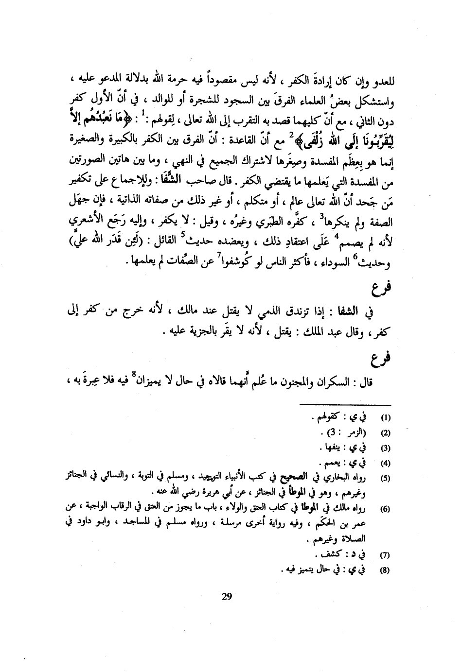 لِلْعَدُوِّ وَإِنْ كَانَ إِرَادَةَ الْكُفْرِ لِأَنَّهُ لَيْسَ مَقْصُودًا فِيهِ حُرْمَةُ اللَّهِ بِدَلَالَةِ الْمَدْعُوِّ عَلَيْهِ وَاسْتَشْكَلَ بَعْضُ الْعُلَمَاءِ الْفَرْقَ بَيْنَ السُّجُودِ لِلشَّجَرَةِ أَو للْوَلَد فِي أَن الأول كُفْرٌ دُونَ الثَّانِي مَعَ أَنَّ كِلَيْهِمَا قُصِدَ بِهِ التَّقَرُّبُ إِلَى اللَّهِ تَعَالَى لِقَوْلِهِمْ {مَا نعبدهم إِلَّا ليقربونا إِلَى الله زلفى} مَعَ أَنَّ الْقَاعِدَةَ أَنَّ الْفَرْقَ بَيْنَ الْكُفْرِ بِالْكَبِيرَةِ وَالصَّغِيرَةِ إِنَّمَا هُوَ بِعِظَمِ الْمَفْسَدَةِ وَصِغَرِهَا لِاشْتِرَاكِ الْجَمِيعِ فِي النَّهْيِ وَمَا بَيْنَ هَاتَيْنِ الصُّورَتَيْنِ مِنَ الْمَفْسَدَةِ الَّتِي يَعْلَمُهَا مَا يَقْتَضِي الْكُفْرَ قَالَ صَاحِبُ الشِّفَا وَلِلْإِجْمَاعِ عَلَى تَكْفِيرِ مَنْ جَحَدَ أَنَّ اللَّهَ تَعَالَى عَالِمٌ أَوْ مُتَكَلِّمٌ أَوْ غَيْرُ ذَلِكَ مِنْ صِفَاتِهِ الذَّاتِيَّةِ فَإِنْ جَهِلَ الصِّفَةَ وَلَمْ يُنْكِرْهَا كَفَّرَهُ الطَّبَرِيُّ وَغَيْرُهُ وَقِيلَ لَا يُكَفَّرُ وَإِلَيْهِ رَجَعَ الْأَشْعَرِيُّ لِأَنَّهُ لَمْ يُصَمِّمْ عَلَى اعْتِقَادِ ذَلِكَ وَيُعَضِّدُهُ حَدِيثُ الْقَائِلِ (لَئِنْ قَدَرَ اللَّهُ عَلِيَّ) وَحَدِيثُ السَّوْدَاءِ فَأَكْثَرُ النَّاسِ لَوْ كُوشِفُوا عَنِ الصِّفَاتِ لَمْ يَعْلَمْهَا