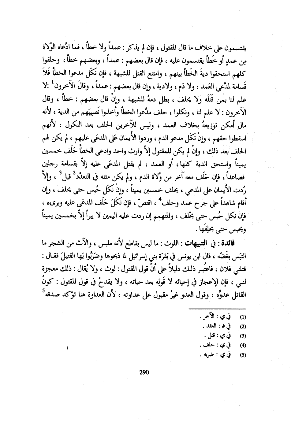 يقتسمون عَلَى خِلَافِ مَا قَالَ الْمَقْتُولُ فَإِنْ لَمْ يَذْكُرْ عَمْدًا وَلَا خَطَأً فَمَا ادَّعَاهُ الْوُلَاةُ من عمد أَو خطأ يقتسمون عَلَيْهِ فَإِنْ قَالَ بَعْضُهُمْ عَمْدًا وَبَعْضُهُمْ خَطَأً وَحَلَفُوا كُلُّهُمُ اسْتَحَقُّوا دِيَةَ الْخَطَأِ بَيْنَهُمْ وَامْتَنَعَ الْقَتْل للشُّبْهَة فَإِن نكل مدعوا الْخَطَأ فَلَا قسَامَة لمُدعِي الْعمد لَا دم وَلَا دِيَةَ وَإِنْ قَالَ بَعْضُهُمْ عَمْدًا وَقَالَ الْآخَرُونَ لَا عِلْمَ لَنَا بِمَنْ قَتَلَهُ وَلَا يحلف بَطل دَمه للشهة وَإِنْ قَالَ بَعْضُهُمْ خَطَأً وَقَالَ الْآخَرُونَ لَا علم لنا ونكلوا حلف مدعوا الْخَطَأِ وَأَخَذُوا نَصِيبَهُمْ مِنَ الدِّيَةِ لِأَنَّهُ مَالٌ أُمْكِنَ تَوْزِيعُهُ بِخِلَافِ الْعَمْدِ وَلَيْسَ لِلْآخَرِينَ الْحَلِفُ بَعْدَ النُّكُولِ لِأَنَّهُمْ أَسْقَطُوا حَقَّهُمْ وَإِنْ نَكَلَ مُدَّعُو الدَّمِ وَرَدُّوا الْأَيْمَانَ عَلَى الْمُدَّعَى عَلَيْهِمْ لَمْ يَكُنْ لَهُمُ الْحَلِفُ بَعْدَ ذَلِكَ وَإِنْ لَمْ يَكُنْ لِلْمَقْتُولِ إِلَّا وَارِثٌ وَاحِدٌ وَادَّعَى الْخَطَأَ حَلَفَ خَمْسِينَ يَمِينًا وَاسْتَحَقَّ الدِّيَةَ كُلَّهَا أَوِ الْعَمْدَ لَمْ يُقْتَلِ الْمُدَّعَى عَلَيْهِ إِلَّا بِقَسَامَةِ رَجُلَيْنِ فَصَاعِدًا فَإِنْ حَلَفَ مَعَهُ آخَرُ مِنْ وُلَاةِ الدَّمِ وَلَمْ يَكُنْ مِثْلُهُ فِي التَّعَدُّدِ قُبِلَ وَإِلَّا رُدَّتِ الْأَيْمَانُ عَلَى الْمُدَّعِي يحلف خمسين يَمِينا وَإِنْ نَكَلَ حُبِسَ حَتَّى يَحْلِفَ وَإِنْ أَقَامَ شَاهدا على جرح عمد وَحلف اقْتصّ فغن نكل حلف الْمُدَّعِي عَلَيْهِ وبريء فَإِنْ نَكَلَ حُبِسَ حَتَّى يَحْلِفَ وَالْمُتَّهَمُ إِنْ رُدَّتْ عَلَيْهِ الْيَمِينُ لَا يَبْرَأُ إِلَّا بِخَمْسِينَ يَمِينًا وَيُحْبَسُ حَتَّى يَحْلِفَهَا فَائِدَةٌ فِي التَّنْبِيهَاتِ اللوث مَا لَيْسَ بقاطع لِأَنَّهُ ملبس والآُث من الشّجر مَا الْتبس بغضه قَالَ ابْن يُونُس فِي بقة بَنِي إِسْرَائِيلَ لَمَّا ذَبَحُوهَا وَضَرَبُوا بِهَا الْقَتِيلَ فَقَالَ قَتَلَنِي فُلَانٌ فَاعْتُبِرَ ذَلِكَ دَلَيْلًا عَلَى أَنَّ قَوْلَ الْمَقْتُولِ لَوْثٌ وَلَا يُقَالُ ذَلِكَ مُعْجِزَةٌ لِنَبِيٍّ فَإِنَّ الْإِعْجَازَ فِي إِحْيَائِهِ لَا قَوْلِهِ بَعْدَ حَيَاتِهِ وَلَا يَقْدَحُ فِي قَوْلِ الْمَقْتُولِ كَوْنُ الْقَاتِلِ عَدُوَّهُ وَقَوْلُ الْعَدُوِّ غَيْرُ مَقْبُول على عداوته لِأَن الْعَدَاوَة هُنَا تؤكد صدقه