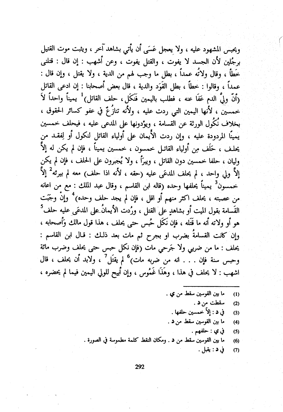 وَيُحْبَسُ الْمَشْهُودُ عَلَيْهِ وَلَا يُعَجَّلُ عَسَى أَنْ يَأْتِيَ بِشَاهِدٍ آخَرَ وَيَثْبُتُ مَوْتُ الْقَتِيلِ بِرَجُلَيْنِ لِأَنَّ الْجَسَدَ لَا يَفُوتُ وَالْقَتْلُ يَفُوتُ وَعَنْ أَشْهَبَ إِنْ قَالَ قَتَلَنِي خَطَأً وَقَالَ وُلَاتُهُ عَمْدًا بَطَلَ مَا وَجَبَ لَهُمْ مِنَ الدِّيَةِ وَلَا يُقْتَلُ وَإِنْ قَالَ عَمْدًا وَقَالُوا خَطَأً بَطَلَ الْقَوَدُ وَالدِّيَةُ قَالَ بَعْضُ أَصْحَابِنَا إِنِ ادَّعَى الْقَاتِلُ (أَنَّ وَلِيَّ الدَّمِ عَفَا عَنْهُ فَطُلِبَ بِالْيَمِينِ فَنَكَلَ حَلَفَ الْقَاتِلُ) يَمِينًا وَاحِدًا لَا خَمْسِينَ لِأَنَّهَا الْيَمِينُ الَّتِي رُدَّتْ عَلَيْهِ وَلِأَنَّهُ تَنَازَعَ فِي عَفْوٍ كَسَائِرِ الْحُقُوقِ بِخِلَافِ نُكُول الْوَرَثَة عَن الْقسَامَة ويؤدونها على الدعي عَلَيْهِ فَيَحْلِفُ خَمْسِينَ يَمِينًا الْمَرْدُودَةَ عَلَيْهِ وَإِنْ رُدَّتِ الْأَيْمَانُ عَلَى أَوْلِيَاءِ الْقَاتِلِ لِنُكُولٍ أَوْ لِفَقْدِ مَنْ يَحْلِفُ حَلَفَ مِنْ أَوْلِيَاءَ الْقَاتِلِ خَمْسُونَ خَمْسِينَ يَمِينًا فَإِنْ لَمْ يَكُنْ لَهُ إِلَّا وَلِيَّانِ حَلَفَا خَمْسِينَ دُونَ الْقَاتِلِ وَيَبْرَأُ وَلَا يجبرون على الْحلف فَإِن لَك يَكُنْ إِلَّا وَلِيٌّ وَاحِدٌ لَمْ يَحْلِفِ الْمُدَّعَى عَلَيْهِ (حَقه لِأَنَّهُ إِذَا حَلَفَ) مَعَهُ لَمْ يُبَرِّئْهُ إِلَّا خَمْسُونَ يَمِينا يحلفهُ وَحْدَهُ (قَالَهُ ابْنُ الْقَاسِمِ وَقَالَ عَبْدُ الْمَلِكِ مَعَ مَنْ أَعَانَهُ مِنْ عَصَبَتِهِ يَحْلِفُ أَكْثَرَ مِنْهُمْ أَوْ أَقَلَّ فَإِنْ لَمْ يَجِدْ حَلَفَ وحد 9) وَإِنْ وَجَبَتِ الْقَسَامَةُ بِقَوْلِ الْمَيِّتِ أَوْ بِشَاهِدٍ على الْقَتْل وَدرت الْأَيْمَانُ عَلَى الْمُدَّعَى عَلَيْهِ حَلَفَ هُوَ أَوْ وُلَاتُهُ أَنَّهُ مَا قَتَلَهُ فَإِنْ نَكَلَ حُبِسَ حَتَّى يَحْلِفَ هَذَا قَوْلُ مَالِكٍ وَأَصْحَابِهِ وَإِنْ كَانَتِ الْقَسَامَةُ بِضَرْبٍ أَوْ بِجُرْحٍ ثُمَّ مَاتَ بعد ذَلِك قَالَ ابْن الْقَاسِم يحلف مامن ضَرْبِي وَلَا جَرْحِي مَاتَ (فَإِنْ نَكَلَ حُبِسَ حَتَّى يَحْلِفَ وَضُرِبَ مِائَةً وَحُبِسَ سَنَةً فَإِنْ انه من ضربه مَاتَ) لم يقتل ولابد أَنْ يَحْلِفَ قَالَ أَشْهَبُ لَا يَحْلِفُ فِي هَذَا وَهَذَا غَمُوسٌ وَإِنْ أُبِيحَ لِلْوَلِيِّ الْيَمِينُ فِيمَا لَمْ يَحْضُرْهُ