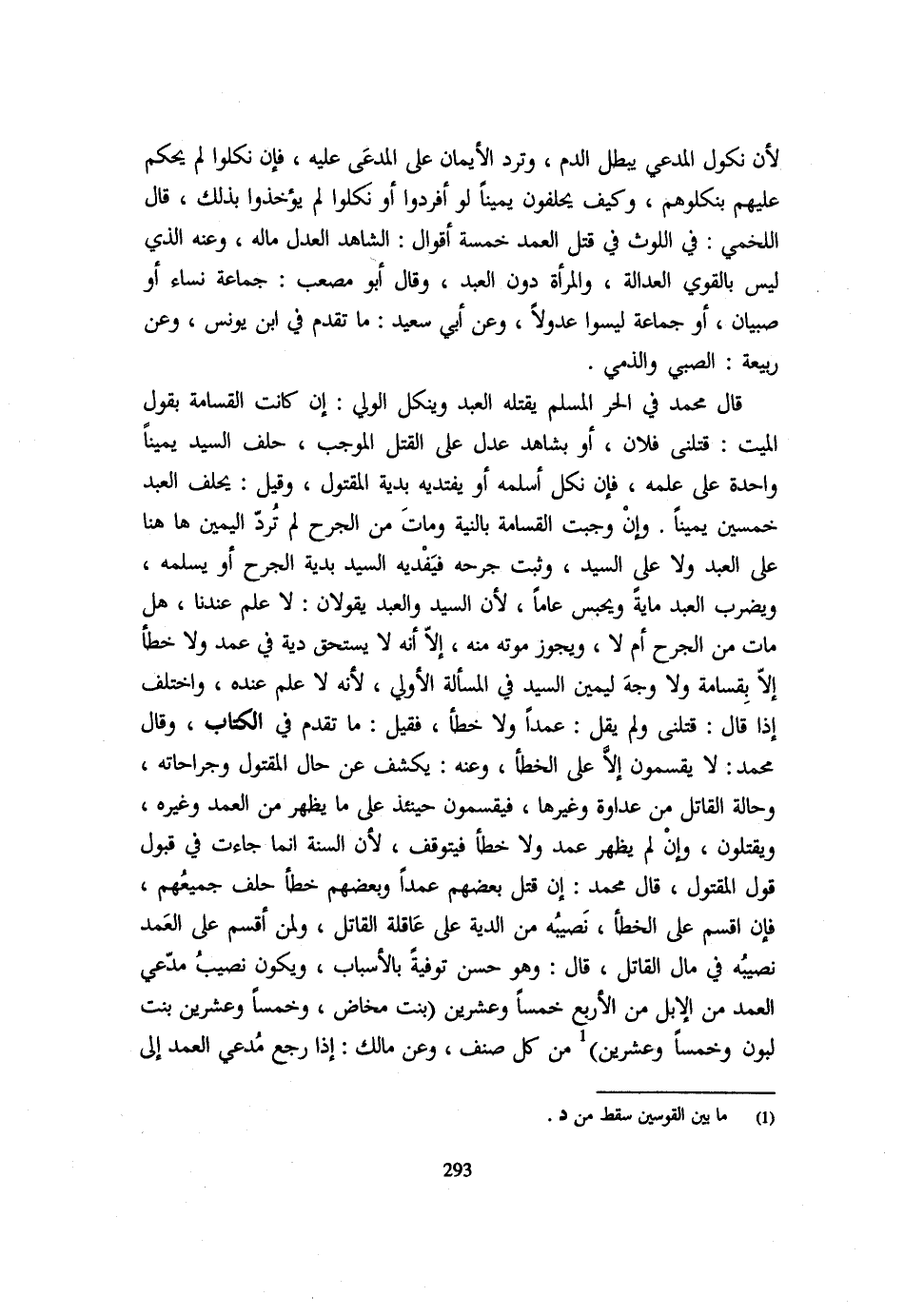 لِأَنَّ نُكُولَ الْمُدَّعِي يُبْطِلُ الدَّمَ وَتُرَدُّ الْأَيْمَانُ عَلَى الْمُدَّعَى عَلَيْهِ فَإِنْ نَكَلُوا لَمْ يَحْكُمْ عَلَيْهِم بنكلوهم وَكَيف يحلفُونَ يَمِينا لَو أَفْرَدُوا أَوْ نَكَلُوا لَمْ يُؤْخَذُوا بِذَلِكَ قَالَ اللَّخْمِيُّ فِي اللَّوْثِ فِي قَتْلِ الْعَمْدِ خَمْسَةُ أَقْوَال الشَّاهِد الْعدْل مَاله وَعنهُ الَّذِي لَيْسَ بِالْقَوِيّ الْعَدَالَة وَالْمَرْأَة دونالعبد وَقَالَ أَبُو مُصْعَبٍ جَمَاعَةُ نِسَاءٍ أَوْ صِبْيَانٍ أَوْ جَمَاعَةٌ لَيْسُوا عُدُولًا وَعَنْ أَبِي سَعِيدٍ مَا تَقَدَّمَ فِي ابْنِ يُونُسَ وَعَنْ رَبِيعَةَ الصَّبِيُّ وَالذِّمِّيُّ قَالَ مُحَمَّدٌ فِي الْحُرِّ الْمُسْلِمِ يَقْتُلُهُ الْعَبْدُ وَيَنْكُلُ الْوَلِيُّ إِنْ كَانَتِ الْقَسَامَةُ يَقُول الْمَيِّتِ قَتَلَنِي فُلَانٌ أَوْ بِشَاهِدِ عَدْلٍ عَلَى الْقَتْلِ الْمُوجِبِ حَلَفَ السَّيِّدُ يَمِينًا وَاحِدَةً عَلَى عِلْمِهِ فَإِنْ نَكَلَ أَسْلَمَهُ أَوْ يَفْتَدِيهِ بِدِيَةِ الْمَقْتُولِ وَقِيلَ يَحْلِفُ الْعَبْدُ خَمْسِينَ يَمِينًا وَإِنْ وَجَبت الْقسَامَة بِالنِّيَّةِ وَمَات من الْجرْح لم ترد الْيَمين هَا هُنَا عَلَى الْعَبْدِ وَلَا عَلَى السَّيِّدِ وَثَبَتَ جُرْحُهُ فَيَفْدِيهِ السَّيِّدُ بِدِيَةِ الْجُرْحِ أَوْ يُسَلِّمُهُ وَيُضْرَبُ الْعَبْدُ مِائَةً وَيُحْبَسُ عَامًا لِأَنَّ السَّيِّدَ وَالْعَبْدَ يَقُولَانِ لَا عِلْمَ عِنْدَنَا هَلْ مَاتَ مِنَ الْجُرْحِ أَمْ لَا وَيَجُوزُ مَوْتُهُ مِنْهُ إِلَّا أَنَّهُ لَا يَسْتَحِقُّ دِيَةً فِي عَمْدٍ وَلَا خَطَأٍ إِلَّا بِقَسَامَةٍ وَلَا وَجْهَ لِيَمِينِ السَّيِّدِ فِي الْمَسْأَلَةِ الْأُولَى لِأَنَّهُ لَا عِلْمَ عِنْدَهُ وَاخْتُلِفَ إِذَا قَالَ قَتَلَنِي وَلَمْ يَقُلْ عَمْدًا وَلَا خَطَأً فَقِيلَ مَا تَقَدَّمَ فِي الْكِتَابِ وَقَالَ مُحَمَّدٌ لَا يُقْسِمُونَ إِلَّا عَلَى الْخَطَأِ وَعَنْهُ يَكْشِفُ عَنْ حَالِ الْمَقْتُولِ وَجِرَاحَاتِهِ وَحَالَةِ الْقَاتِلِ مِنْ عَدَاوَةٍ وَغَيْرِهَا فَيُقْسِمُونَ حِينَئِذٍ عَلَى مَا يَظْهَرُ مِنَ الْعَمْدِ وَغَيْرِهِ وَيَقْتُلُونَ وَإِنْ لَمْ يَظْهَرْ عَمْدٌ وَلَا خَطَأٌ فَيُتَوَقَّفُ لِأَنَّ السُّنَّةَ إِنَّمَا جَاءَتْ فِي قَبُولِ قَوْلِ الْمَقْتُولِ قَالَ مُحَمَّدٌ إِنْ قَتَلَ بَعْضُهُمْ عَمْدًا وَبَعْضُهُمْ خَطَأً حَلَفَ جَمِيعُهُمْ فَإِنْ أَقْسَمَ عَلَى الْخَطَأِ نَصِيبُهُ مِنَ الدِّيَةِ عَلَى عَاقِلَةِ الْقَاتِلِ وَلِمَنْ أَقْسَمَ عَلَى الْعَمْدِ نَصِيبُهُ فِي مَالِ الْقَاتِلِ قَالَ وَهُوَ حسن تَوْفِيَةً بِالْأَسْبَابِ وَيَكُونُ نَصِيبُ مُدَّعِي الْعَمْدِ مِنَ الْإِبِلِ مِنَ الْأَرْبَعِ خَمْسًا وَعِشْرِينَ (بِنْتُ مَخَاضٍ وَخَمْسًا وَعِشْرِينَ بِنْتُ لَبُونٍ وَخَمْسًا وَعِشْرِينَ) مِنْ كُلِّ صِنْفٍ وَعَنْ مَالِكٍ إِذَا رَجَعَ مُدَّعِي الْعمد إِلَى