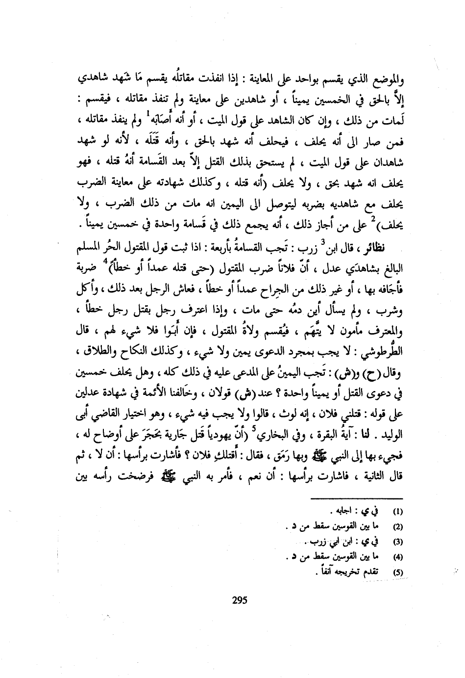 والموضع الَّذِي يقسم بِوَاحِد على المعانية إِذَا أُنْفِذَتْ مَقَاتِلُهُ يُقْسِمُ مَا شَهِدَ شَاهِدِي إِلَّا بِالْحَقِّ فِي الْخمسين يَمِينا أَو شَاهِدين عَلَى مُعَايَنَةٍ وَلَمْ تُنْفَذْ مَقَاتِلُهُ فَيُقْسِمُ لَمَاتَ مِنْ ذَلِكَ وَإِنْ كَانَ الشَّاهِدُ عَلَى قَوْلِ الْمَيِّت أَو أَنه أَصَابَهُ وَلم ينقذ مَقَاتِلَهُ فَمَنْ صَارَ إِلَى أَنَّهُ يَحْلِفُ فَيَحْلِفُ أَنَّهُ شَهِدَ بِالْحَقِّ وَأَنَّهُ قَتَلَهُ لِأَنَّهُ لَوْ شهد شاهدات عَلَى قَوْلِ الْمَيِّتِ لَمْ يَسْتَحِقَّ بِذَلِكَ الْقَتْلَ غلا بَعْدَ الْقَسَامَةِ أَنَّهُ قَتَلَهُ فَهُوَ يَحْلِفُ أَنَّهُ شَهِدَ بِحَقٍّ وَلَا يَحْلِفُ (أَنَّهُ قَتَلَهُ وَكَذَلِكَ شَهَادَتُهُ عَلَى مُعَايَنَةِ الضَّرْبِ يَحْلِفُ مَعَ شَاهِدَيْهِ بِضَرْبِهِ لِيَتَوَصَّلَ إِلَى الْيَمِينِ أَنَّهُ مَاتَ مِنْ ذَلِكَ الضَّرْبِ وَلَا يَحْلِفُ) عَلَى مَنْ أَجَازَ ذَلِكَ أَنَّهُ يَجْمَعُ ذَلِكَ فِي قَسَامَةٍ وَاحِدَةٍ فِي خمسين يَمِينا نَظَائِر قَالَ ابْن زَرِبٍ تَجِبُ الْقَسَامَةُ بِأَرْبَعَةٍ إِذَا ثَبَتَ قَوْلُ الْمَقْتُولِ الْحُرِّ الْمُسْلِمِ الْبَالِغِ بِشَاهِدَيْ عَدَلٍ أَنَّ فُلَانًا ضَرَبَ الْمَقْتُولَ (حَتَّى قَتَلَهُ عَمْدًا أَوْ خَطَأً) ضَرْبَةً فَأَجَافَهُ بِهَا أَوْ غَيْرَ ذَلِكَ مِنَ الْجِرَاحِ عَمْدًا أَوْ خَطَأً فَعَاشَ الرَّجُلُ بَعْدَ ذَلِكَ وَأَكَلَ وَشَرِبَ وَلَمْ يَسْأَلْ أَيْنَ دَمُهُ حَتَّى مَاتَ وَإِذَا اعْتَرَفَ رَجُلٌ بِقَتْلِ رَجُلٍ خَطَأً وَالْمُعْتَرِفُ مَأْمُونٌ لَا يُتَّهَمُ فَيُقْسِمُ وُلَاةُ الْمَقْتُولِ فَإِنْ أَبَوْا فَلَا شَيْءَ لَهُمْ قَالَ الطَّرْطُوشِيُّ لَا يَجِبُ بِمُجَرَّدِ الدَّعْوَى يَمِينٌ وَلَا شَيْءٌ وَكَذَلِكَ النِّكَاحُ وَالطَّلَاقُ وَقَالَ (ح) وَ (ش) تَجِبُ الْيَمِينُ عَلَى الْمُدَّعَى عَلَيْهِ فِي ذَلِكَ كُلِّهِ وَهَلْ يَحْلِفُ خَمْسِينَ فِي دَعْوَى الْقَتْلِ أَوْ يَمِينًا وَاحِدَةً عِنْدَ (ش) قَوْلَانِ وَخَالَفْنَا الْأَئِمَّةَ فِي شَهَادَةِ عَدْلَيْنِ عَلَى قَوْلِهِ قَتَلَنِي فُلَانٌ إِنَّهُ لَوْثٌ قَالُوا وَلَا يَجِبُ فِيهِ شَيْءٌ وَهُوَ اخْتِيَارُ الْقَاضِي أَبِي الْوَلِيدِ لَنَا آيَةُ الْبَقَرَةِ وَفِي الْبُخَارِيِّ (أَنَّ يَهُودِيًّا قَتَلَ جَارِيَةً بِحَجَرٍ عَلَى أَوَضَاحٍ لَهُ فَجِيءَ بِهَا إِلَى النَّبِيِّ - صَلَّى اللَّهُ عَلَيْهِ وَسَلَّم َ - وَبِهَا رَمَقٌ فَقَالَ أَقَتَلَكَ فُلَانٌ فَأَشَارَتْ بِرَأْسِهَا أَنْ لَا ثُمَّ قَالَ الثَّانِيَةَ فَأَشَارَتْ بِرَأْسِهَا أَنْ نَعَمْ فَأَمَرَ بِهِ النَّبِيُّ - صَلَّى اللَّهُ عَلَيْهِ وَسَلَّم َ - فَرُضِخَتْ رَأْسُهُ بَيْنَ