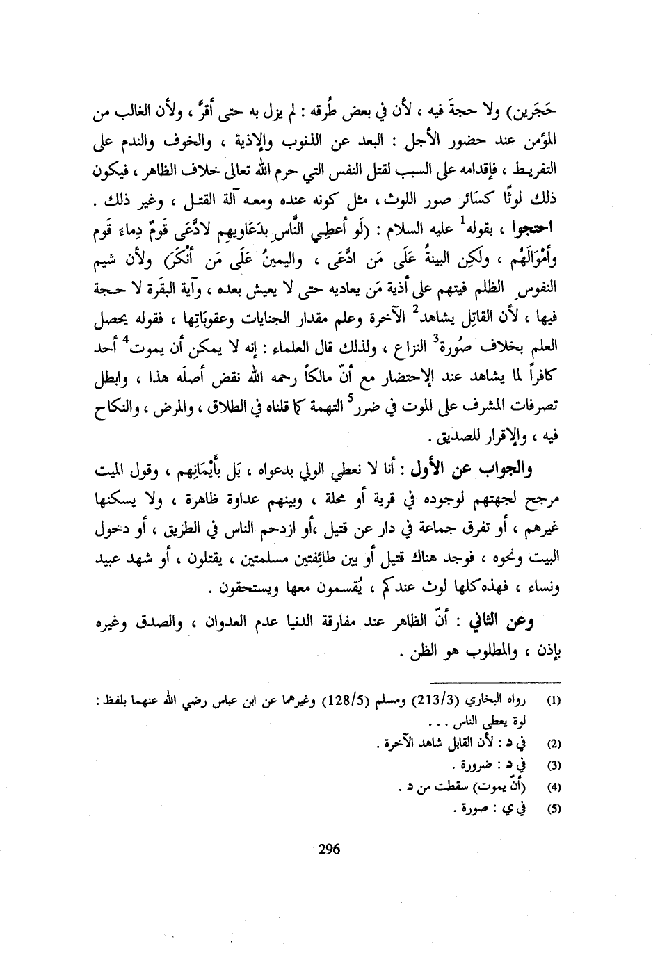 حَجَرَيْنِ) وَلَا حُجَّةَ فِيهِ لِأَنَّ فِي بَعْضِ طُرُقِهِ لَمْ يَزَلْ بِهِ حَتَّى أَقَرَّ وَلِأَنَّ الْغَالِبَ مِنَ الْمُؤْمِنِ عِنْدَ حُضُورِ الْأَجَلِ الْبُعْدُ عَنِ الذُّنُوبِ وَالْأَذِيَّةِ وَالْخَوْفُ وَالنَّدَمُ عَلَى التَّفْرِيطِ فَإِقْدَامُهُ عَلَى السَّبَبِ لِقَتْلِ النَّفْسِ الَّتِي حَرَّمَ اللَّهُ تَعَالَى خِلَافُ الظَّاهِرِ فَيَكُونُ ذَلِكَ لَوْثًا كَسَائِرِ صُوَرِ اللَّوْثِ مِثْلَ كَوْنِهِ عِنْدَهُ وَمَعَهُ آلَةُ الْقَتْلِ وَغَيْرُ ذَلِكَ احْتَجُّوا بِقَوْلِهِ عَلَيْهِ السَّلَامُ (لَوْ أُعْطِيَ النَّاسُ بِدَعَاوِيهِمْ لَادَّعَى قَوْمٌ دِمَاءَ قَوْمٍ وَأَمْوَالَهُمْ وَلَكِنَّ الْبَيِّنَةَ عَلَى مَنِ ادَّعَى وَالْيَمِينَ عَلَى مَنْ أَنْكَرَ) وَلِأَنَّ شِيَمَ النُّفُوسِ الظُّلْمُ فَيُتَّهَمُ عَلَى أَذِيَّةِ مَنْ يُعَادِيهِ حَتَّى لَا يَعِيشَ بَعْدَهُ وَآيَةُ الْبَقَرَةِ لَا حُجَّةَ فِيهَا لِأَنَّ الْقَاتِلَ يُشَاهِدُ الْآخِرَةَ وَعَلِمَ مِقْدَارَ الْجِنَايَاتِ وَعُقُوبَاتِهَا فَقَوْلُهُ يُحَصِّلُ الْعِلْمَ بِخِلَافِ صُورَةِ النِّزَاعِ وَلِذَلِكَ قَالَ الْعُلَمَاءُ إِنَّهُ لَا يُمْكِنُ أَنْ يَمُوتَ أَحَدٌ كَافِرًا لِمَا يُشَاهِدُ عِنْدَ الِاحْتِضَارِ مَعَ أَنَّ مَالِكًا رَحِمَهُ اللَّهُ نَقَضَ أَصْلَهُ هَذَا وَأَبْطَلَ تَصَرُّفَاتِ الْمُشْرِفِ عَلَى الْمَوْتِ فِي ضَرَرِ التُّهْمَةِ كَمَا قُلْنَاهُ فِي الطَّلَاقِ وَالْمَرَضِ وَالنِّكَاحِ فِيهِ وَالْإِقْرَارِ لِلصَّدِيقِ وَالْجَوَابُ علن الْأَوَّلِ أَنَّا لَا نُعْطِي الْوَلِيَّ بِدَعْوَاهُ بَلْ بِأَيْمَانِهِمْ وَقَوْلُ الْمَيِّتِ مُرَجِّحٌ لِجِهَتِهِمْ لِوُجُودِهِ فِي قَرْيَةٍ أَوْ مَحَلَّةٍ وَبَيْنَهُمْ عَدَاوَةٌ ظَاهِرَةٌ وَلَا يَسْكُنُهَا غَيْرُهُمْ أَوْ تَفَرَّقَ جَمَاعَةٌ فِي دَارٍ عَنْ قَتِيلٍ أَوِ ازْدَحَمَ النَّاسُ فِي الطَّرِيقِ أَوْ دُخُولِ الْبَيْتِ وَنَحْوِهِ فَوُجِدَ هُنَاكَ قَتِيلٌ أَو بَين طائفتين مسلمتين يقتلُون أَوْ شَهِدَ عَبِيدٌ وَنِسَاءٌ فَهَذِهِ كُلُّهَا لَوْثٌ عِنْدَكُمْ يُقْسِمُونَ مَعَهَا وَيَسْتَحِقُّونَ وَعَنِ الثَّانِي أَنَّ الظَّاهِرَ عِنْدَ مُفَارَقَةِ الدُّنْيَا عَدَمُ الْعُدْوَانِ وَالصِّدْقُ وَغَيره بِإِذن وَالْمَطْلُوبُ هُوَ الظَّنُّ
