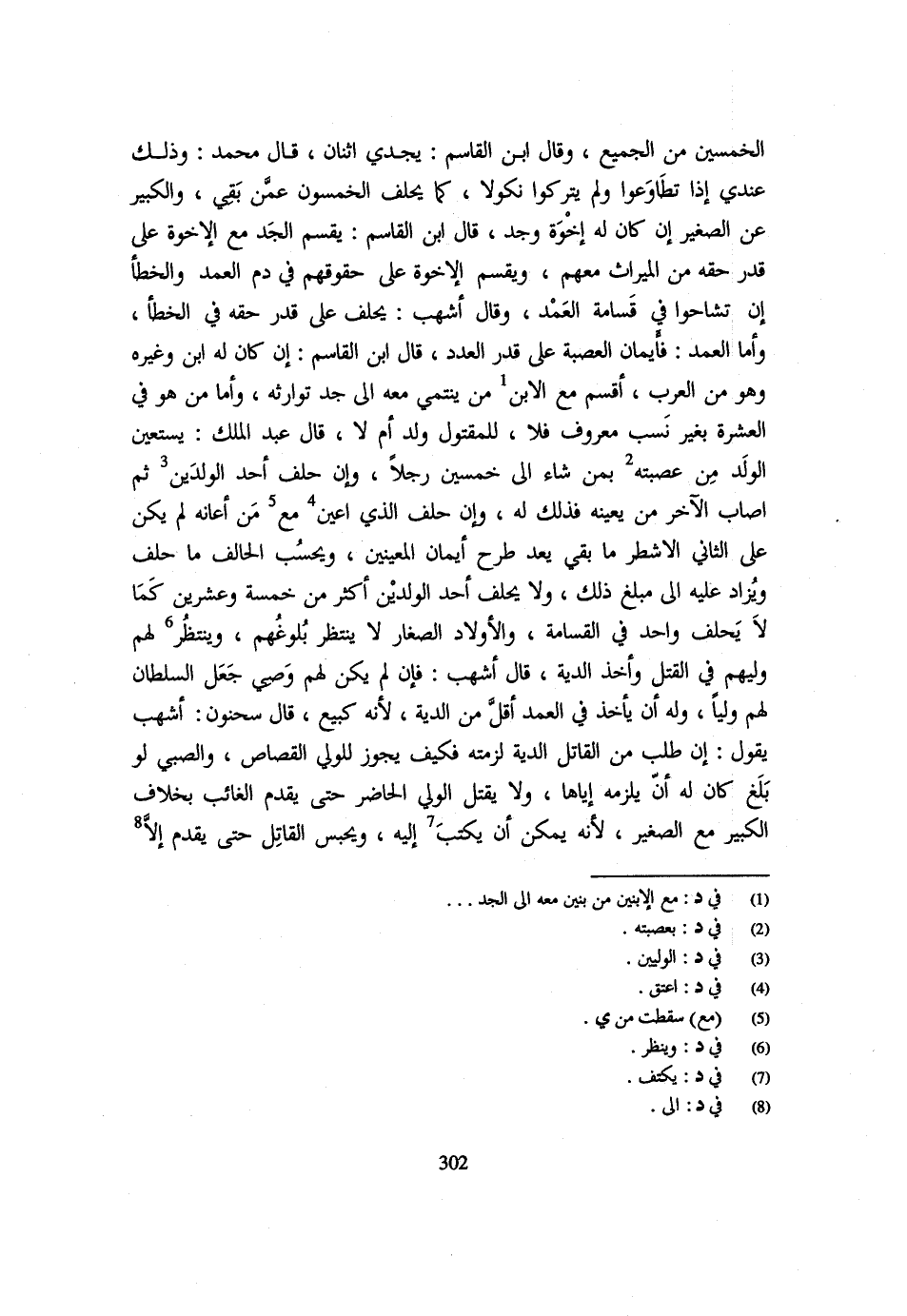 الْخَمْسِينَ مِنَ الْجَمِيعِ وَقَالَ ابْنُ الْقَاسِمِ يُجْدِي اثْنَانِ قَالَ مُحَمَّدٌ وَذَلِكَ عِنْدِي إِذَا تَطَاوَعُوا وَلَمْ يَتْرُكُوا نُكُولًا كَمَا يَحْلِفُ الْخَمْسُونَ عَمَّنْ بَقِيَ وَالْكَبِيرُ عَنِ الصَّغِيرِ إِنْ كَانَ لَهُ إخْوَة وجد قَالَ ابْن الْقَاسِم يقم الْجَدُّ مَعَ الْإِخْوَةِ عَلَى قَدْرِ حَقِّهِ مِنَ الْمِيرَاثِ مَعَهُمْ وَيُقْسِمُ الْإِخْوَةُ عَلَى حُقُوقِهِمْ فِي دَمِ الْعَمْدِ وَالْخَطَأِ إِنْ تَشَاحُّوا فِي قَسَامَةِ الْعَمْدِ وَقَالَ أَشْهَبُ يَحْلِفُ عَلَى قَدْرِ حَقِّهِ فِي الْخَطَأِ وَأَمَّا الْعَمْدُ فَأَيْمَانُ الْعَصَبَةِ عَلَى قَدْرِ الْعَدَدِ قَالَ ابْنُ الْقَاسِمِ إِنْ كَانَ لَهُ ابْنٌ وَغَيْرُهُ وَهُوَ مِنَ الْعَرَبِ أَقْسَمَ مَعَ الِابْنِ مَنْ يَنْتَمِي مَعَهُ إِلَى جَدٍّ تَوَارَثَهُ وَأَمَّا مَنْ هُوَ فِي الْعَشَرَةِ بِغَيْرِ نَسَبٍ مَعْرُوفٍ فَلَا لِلْمَقْتُولِ وَلَدٌ أَمْ لَا قَالَ عَبْدُ الْمَلِكِ يَسْتَعِينُ الْوَلَدُ مِنْ عَصَبَتِهِ بِمَنْ شَاءَ إِلَى خَمْسِينَ رَجُلًا وَإِنْ حَلَفَ أَحَدُ الْوَلَدَيْنِ ثُمَّ أَصَابَ الْآخَرُ مَنْ يُعِينُهُ فَذَلِكَ لَهُ وَإِنْ حَلَفَ الَّذِي أُعِينَ مَعَ من أَعَانَهُ لم يكن على الثَّانِي الاشطر مَا بَقِي يعد طَرْحِ أَيْمَانِ الْمُعَيَّنِينَ وَيَحْسِبُ الْحَالِفُ مَا حَلَفَ وَيُزَادُ عَلَيْهِ إِلَى مَبْلَغِ ذَلِكَ وَلَا يَحْلِفُ أحد الْوَالِدين أَكْثَرَ مِنْ خَمْسَةٍ وَعِشْرِينَ كَمَا لَا يَحْلِفُ وَاحِد فِي الْقسَامَة وَالْأَوْلَاد الصغر لَا يُنْتَظَرُ بُلُوغُهُمْ وَيَنْتَظِرُ لَهُمْ وَلِيُّهُمْ فِي الْقَتْلِ وَأَخْذِ الدِّيَةِ قَالَ أَشْهَبُ فَإِنْ لَمْ يَكُنْ لَهُمْ وَصِيٌّ جَعَلَ السُّلْطَانُ لَهُمْ وَلِيًّا وَلَهُ أَنْ يَأْخُذَ فِي الْعَمْدِ أَقَلَّ مِنَ الدِّيَة لِأَنَّهُ كَبيع قَالَ سَحْنُون أَشهب يَقُولُ إِنْ طَلَبَ مِنَ الْقَاتِلِ الدِّيَةَ لَزِمَتْهُ فَكَيْفَ يَجُوزُ لِلْوَلِيِّ الْقِصَاصُ وَالصَّبِيُّ لَوْ بَلَغَ كَانَ لَهُ أَنْ يُلْزِمَهُ إِيَّاهَا وَلَا يَقْتُلُ الْوَلِيُّ الْحَاضِرُ حَتَّى يَقْدُمَ الْغَائِبُ بِخِلَافِ الْكَبِيرِ مَعَ الصَّغِيرِ لِأَنَّهُ يُمْكِنُ أَنْ يَكْتُبَ إِلَيْهِ وَيُحْبَسُ الْقَاتِلُ حَتَّى يَقْدِمَ إِلَّا