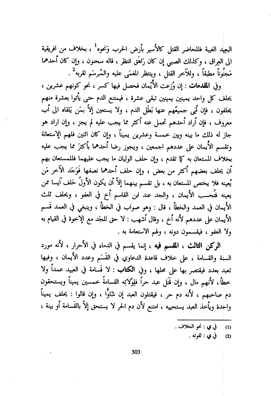 الْبَعِيدَ الْغَيْبَةِ فَلِلْحَاضِرِ الْقَتْلُ كَالْأَسِيرِ بِأَرْضِ الْحَرْبِ وَنَحْوِهِ بِخِلَافِ مِنْ إِفْرِيقِيَّةَ إِلَى الْعِرَاقِ وَكَذَلِكَ الصَّبِيُّ إِنْ كَانَ رَاهَقَ انْتُظِرَ قَالَهُ سَحْنُونٌ وَإِن كَانَ أَحدهمَا مَجْنُونا مطبقا وَللْآخر الْقَتْلُ وَيُنْتَظَرُ الْمُغْمَى عَلَيْهِ وَالْمُبَرْسَمُ لِقُرْبِهِ وَفِي الْمُقدمَات إِن ووزعت الْأَيْمَانُ فَحَصَلَ فِيهَا كَسْرٌ نَحْوَ كَوْنِهِمْ عِشْرِينَ يَحْلِفُ كُلُّ وَاحِدٍ يَمِينَيْنِ يَمِينَيْنِ تَبْقَى عَشَرَةٌ فَيَمْتَنِعُ الدَّمُ حَتَّى يَأْتُوا بِعَشَرَةٍ مِنْهُمْ يَحْلِفُونَ فَإِنْ أَبَى جَمِيعُهُمْ عَنْهَا بَطَلَ الدَّمُ وَلَا يَسْتَعِينُ إِلَّا بِمَنْ يَلْقَاهُ إِلَى أَبٍ مَعْرُوفٍ فَإِنْ أَرَادَ أَحَدُهُمْ تَحَمُّلَ عَنْهُ أَكْثَرَ مِمَّا يَجِبُ عَلَيْهِ لَمْ يَجُزْ وَإِنْ أَرَادَ هُوَ جَازَ لَهُ ذَلِكَ مَا بَيْنَهُ وَبَيْنَ خَمْسَةٍ وَعشْرين يَمِينا وَإِن كَانَ اثْنَيْنِ فَلَهُمْ الِاسْتِعَانَةُ وَتُقَسَّمُ الْأَيْمَانُ عَلَى عَدَدِهِمْ أَجْمَعِينَ وَيَجُوزُ رِضَا أَحَدِهِمَا بِأَكْثَرَ مِمَّا يَجِبُ عَلَيْهِ بِخِلَافِ الْمُسْتَعَانِ بِهِ كَمَا تَقَدَّمَ وَإِنْ حَلَفَ الْوَلِيَّانِ مَا يَجِبُ عَلَيْهِمَا فَلِلْمُسْتَعَانِ بِهِمْ أَنْ يَحْلِفَ بَعْضُهُمْ أَكْثَرَ مِنْ بَعْضٍ وَإِنْ حَلَفَ أَحَدُهُمَا نِصْفَهَا فَوَجَدَ الْآخَرُ مَنْ يُعِينُهُ فَلَا يَخْتَصُّ الْمُسْتَعَانُ بِهِ بَلْ تُقَسَّمُ بَيْنَهُمَا إِلَّا أَنْ يَكُونَ الْأَوَّلُ حَلَفَ آيِسًا مِمَّنْ يُعِينُهُ فَتُحْسَبُ الْأَيْمَانُ وَالْجَدُّ عِنْدَ ابْنِ الْقَاسِمِ أَخٌ فِي الْعَفْوِ وَيَحْلِفُ ثُلُثَ الْأَيْمَانِ فِي الْعَمْدِ وَالْخَطَأِ قَالَ وَهُوَ صَوَابٌ فِي الْخَطَأِ ويتبغي فِي الْعَمْدِ قَسْمُ الْأَيْمَانِ عَلَى عَدَدِهِمْ لِأَنَّهُ أَخٌ وَقَالَ أَشْهَبُ لَا حَقَّ لِلْجَدِّ مَعَ الْإِخْوَةِ فِي الْقِيَامِ بِهِ وَلَا الْعَفْوِ فَيُقْسِمُونَ دونه وَلَهُم الاستعامة بِهِ الرُّكْنُ الثَّالِثُ الْمُقْسَمُ فِيهِ إِنَّمَا يُقْسَمُ فِي الدِّمَاءِ فِي الْأَحْرَارِ لِأَنَّهُ مَوْرِدُ السُّنَّةِ وَالْقَسَامَةُ عَلَى خِلَافِ قَاعِدَةِ الدَّعَاوِي فِي الْقَسَمِ وَعَدَدِ الْأَيْمَانِ وَفِيهَا تَعَبُدٌ بِعَدَدٍ فَيُقْتَصَرُ بِهَا عَلَى مَحَلِّهَا وَفِي الْكِتَابِ لَا قَسَامَةَ فِي الْعَبِيدِ عَمْدًا وَلَا خَطَأً لِأَنَّهُمْ مَالٌ وَإِنْ قَتَلَ عَبْدٌ حُرًّا فَلِوُلَاتِهِ الْقَسَامَةُ خَمْسِينَ يَمِينًا وَيَسْتَحِقُّونَ دَمَ صَاحِبِهِمْ لِأَنَّهُ دَمُ حُرٍّ فَيَقْتُلُونَ الْعَبْدَ إِنْ شَاءُوا وَإِنْ قَالُوا يَحْلِفُ يَمِينًا وَاحِدَةً وَيَأْخُذُ الْعَبْدَ يَسْتَحْيِيهِ امْتُنِعَ لِأَنَّ دَمَ الْحر لَا يسْتَحق إِلَّا الْقسَامَة أَو بَيِّنَة