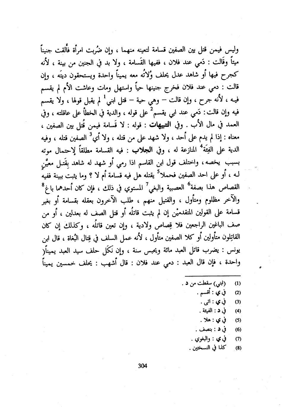 وَلَيْسَ فِيمَنْ قُتِلَ بَيْنَ الصَّفَّيْنِ قَسَامَةٌ لِتَعَيُّنِهِ مِنْهُمَا وَإِنْ ضُرِبَتِ امْرَأَةٌ فَأَلْقَتْ جَنِينًا مَيْتًا وَقَالَتْ دَمِي عِنْدَ فُلَانٍ فَفِيهَا الْقَسَامَةُ وَلَا بُدَّ فِي الْجَنِينِ مِنْ بَيِّنَةٍ لِأَنَّهُ كَجُرْحِ فِيهَا أَوْ شَاهِدِ عَدْلٍ يَحْلِفُ وُلَاتُهُ مَعَهُ يَمِينًا وَاحِدَةً وَيَسْتَحِقُّونَ دِيَتَهُ وَإِنْ قَالَتْ دَمِي عِنْدَ فُلَانٍ فَخَرَجَ جَنِينُهَا حَيًّا وَاسْتَهَلَّ وَمَاتَ وَعَاشَتِ الْأُمُّ لَمْ يُقْسَمْ فِيهِ لِأَنَّهُ جُرْحٌ وَإِنْ قَالَتْ وَهِيَ حَيَّةٌ قُتِلَ ابْنِي لَمْ يُقْبَلْ قَوْلُهَا وَلَا يُقْسَمُ فِيهِ وَإِنْ قَالَتْ دَمِي عِنْدَ أَبِي يُقْسِمُ عَلَى قَوْلِهِ وَالدِّيَةُ فِي الْخَطَأِ عَلَى عَاقِلَتِهِ وَفِي الْعَمْدِ فِي مَالِ الْأَبِ وَفِي التَّنْبِيهَاتِ قَوْلُهُ لَا قَسَامَةَ فِيمَنْ قُتِلَ بَيْنَ الصَّفَّيْنِ مَعْنَاهُ إِذَا لَمْ يدم عَلَى أَحَدٍ وَلَا شَهِدَ عَلَى مَنْ قَتَلَهُ وَلَا أَيِّ الصَّفَّيْنِ قَتَلَهُ وَفِيهِ الدِّيَةُ عَلَى الْفِئَةِ الْمُنَازِعَةِ لَهُ وَفِي الْجَلَّابِ فِيهِ الْقَسَامَةُ مُطْلَقًا لِاحْتِمَالِ مَوْتِهِ بِسَبَبٍ يَخُصُّهُ وَاخْتَلَفَ قَوْلُ ابْنِ الْقَاسِمِ إِذَا رُمِيَ أَوْ شَهِدَ لَهُ شَاهِدٌ بِقَتْلٍ مُعَيَّنٍ لَهُ أَوْ عَلَى أَحَدِ الصَّفَّيْنِ فَحَمَلَا يَقْتُلُهُ هَلْ فِيهِ قَسَامَةٌ أَمْ لَا وَمَا يثبت بِبَيِّنَةٍ فَفِيهِ الْقِصَاصُ هَذَا بِصِفَةِ الْعَصَبِيَّةِ وَالْبَغْيِ المستوي فِي ذَلِك فَإِن كَانَ أَحدهمَا بَاغ وَالْآخر مظلوم ومتأول والقتيل مِنْهُمْ طَلَبَ الْآخَرُونَ بِعَقْلِهِ بِقَسَامَةٍ أَوْ بِغَيْرِ قَسَامَةٍ عَلَى الْقَوْلَيْنِ الْمُتَقَدِّمَيْنِ إِنْ لَمْ يَثْبُتْ قَاتِلُهُ أَوْ قَتْلُ الصَّفِّ لَهُ بِعَدْلَيْنِ أَوْ مِنْ صَفِّ الْبَاغِينَ الرَّاجِعِينَ فَلَا قِصَاصَ وَلَا دِيَةَ وَإِنْ تَعَيَّنَ قَاتِلُهُ وَكَذَلِكَ إِنْ كَانَ الْقَاتِلُونَ مُتَأَوِّلِينَ أَوْ كِلَا الصَّفَّيْنِ مُتَأَوِّلٌ لِأَنَّهُ عَمَلُ السَّلَفِ فِي قِتَالِ الْبُغَاةِ قَالَ ابْنُ يُونُسَ يُضْرَبُ قَاتِلُ الْعَبْدِ مِائَةً وَيُحْبَسُ سَنَةً وَإِنْ نَكَلَ حَلَفَ سَيِّدُ الْعَبْدِ يَمِينًا (وَاحِدَةً فَإِنْ قَالَ الْعَبْدُ دَمِي عِنْدَ فُلَانٍ قَالَ أَشْهَبُ يَحْلِفُ خَمْسِينَ يَمِينًا
