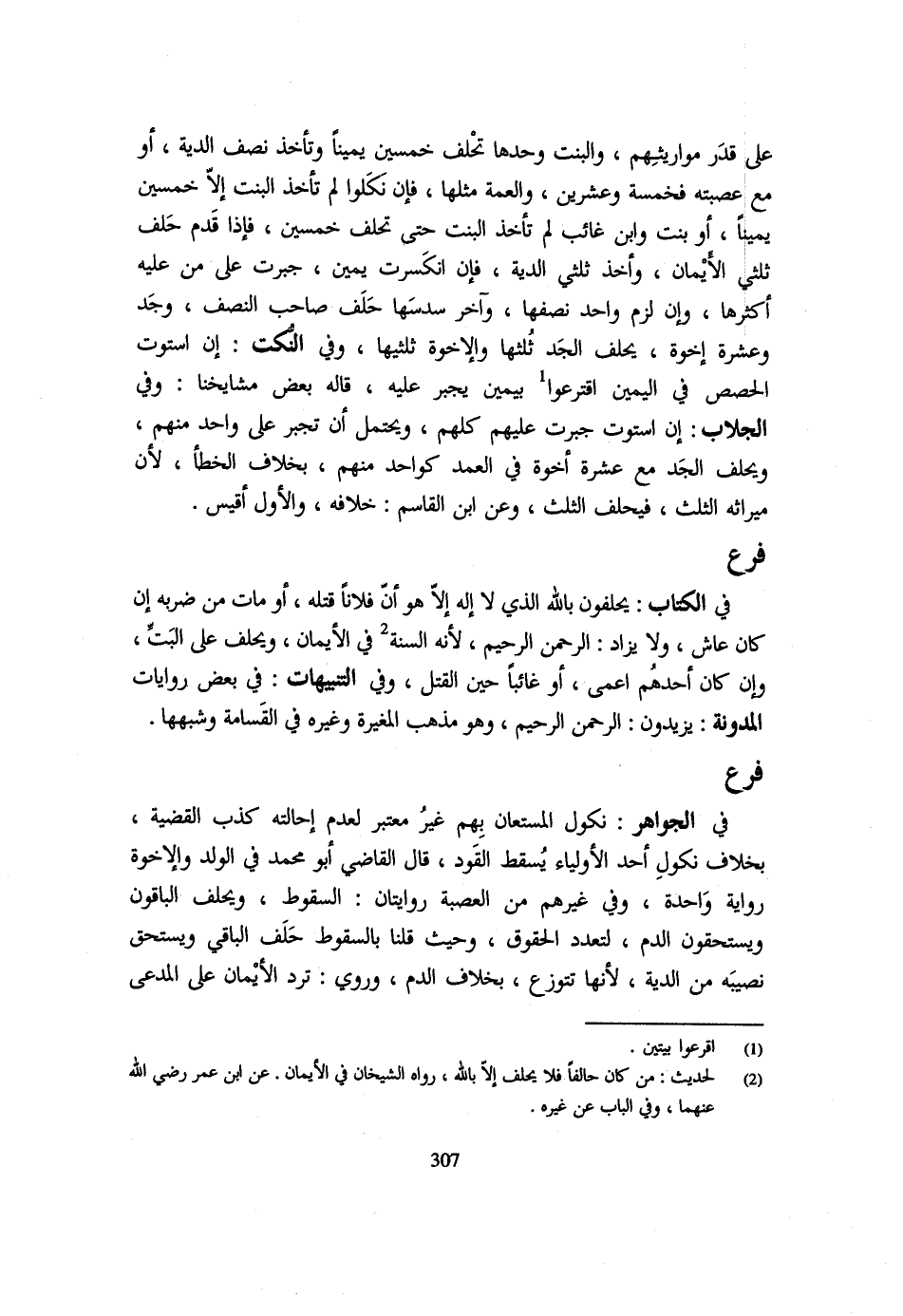 عَلَى قَدْرِ مَوَارِيثِهِمْ وَالْبِنْتُ وَحْدَهَا تَحْلِفُ خَمْسِينَ يَمِينًا وَتَأْخُذُ نِصْفَ الدِّيَةِ أَوْ مَعَ عَصَبَتِهِ فخمسة وَعشْرين والعمة مِثْلُهَا فَإِنْ نَكَلُوا لَمْ تَأْخُذِ الْبِنْتُ إِلَّا خمسين يَمِينًا أَوْ بِنْتٌ وَابْنٌ غَائِبٌ لَمْ تَأْخُذِ الْبِنْتُ حَتَّى تَحْلِفَ خَمْسِينَ فَإِذَا قَدِمَ حَلَفَ ثُلُثَيِ الْأَيْمَانِ وَأَخَذَ ثُلُثَيِ الدِّيَةِ فَإِنِ انْكَسَرَتْ يَمِينٌ جُبِرَتْ عَلَى مَنْ عَلَيْهِ أَكْثَرُهَا وَإِنْ لزم وَاحِد نصفهَا وَآخَرُ سُدُسَهُا حَلَفَ صَاحِبُ النِّصْفِ وَجَدٌّ وَعَشَرَةُ إِخْوَةٍ يَحْلِفُ الْجَدُّ ثُلُثَهَا وَالْإِخْوَةُ ثُلُثَيْهَا وَفِي النُّكَتِ إِنِ اسْتَوَتِ الْحِصَصُ فِي الْيَمِينِ اقْتَرَعُوا بِيَمِين يجْبر عَلَيْهِ قَالَه بعض مَشَايِخنَا فِي الْجَلَّابِ إِنِ اسْتَوَتْ جُبِرَتْ عَلَيْهِمْ كُلِّهِمْ وَيُحْتَمَلُ أَنْ تُجْبَرَ عَلَى وَاحِدٍ مِنْهُمْ وَيَحْلِفُ الْجَدُّ مَعَ عَشَرَةِ إِخْوَةٍ فِي الْعَمْدِ كَوَاحِدٍ مِنْهُمْ بِخِلَافِ الْخَطَأِ لِأَنَّ مِيرَاثَهُ الثُّلُثُ فَيَحْلِفُ الثُّلُثَ وَعَنِ ابْنِ الْقَاسِمِ خِلَافُهُ وَالْأَوَّلُ أَقْيَسُ