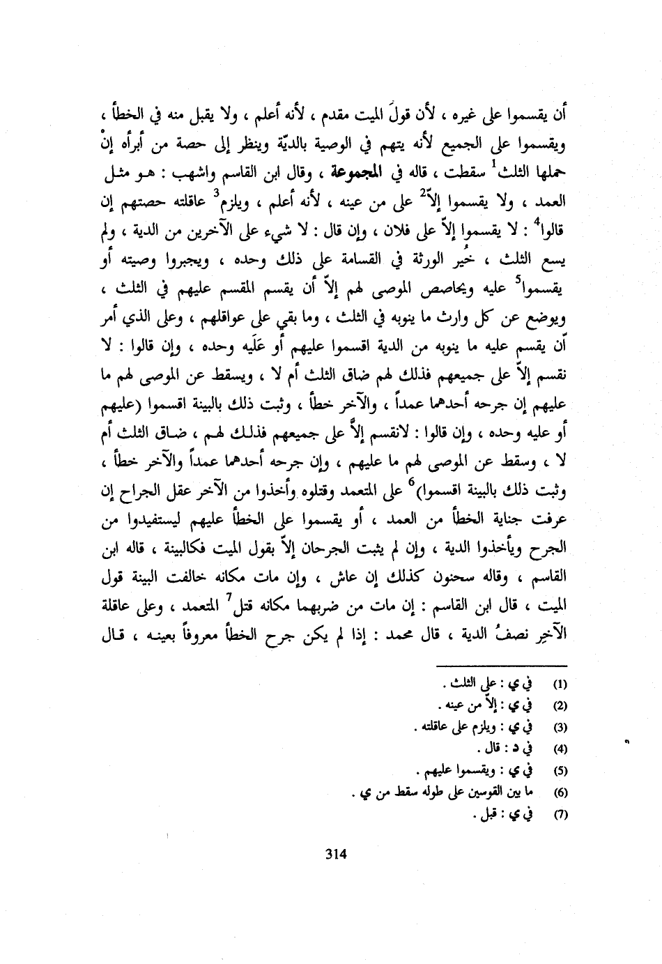 أَنْ يُقْسِمُوا عَلَى غَيْرِهِ لِأَنَّ قَوْلَ الْمَيِّتِ مُقَدَّمٌ لِأَنَّهُ أَعْلَمُ وَلَا يَقْبَلُ مِنْهُ فِي الْخَطَأ ويقسموا عَلَى الْجَمِيعِ لِأَنَّهُ يُتَّهَمُ فِي الْوَصِيَّةِ بِالدِّيَةِ وَيُنْظَرُ إِلَى حِصَّةِ مَنْ أَبْرَأَهُ إِنْ حَمَلَهَا الثُّلُثُ سَقَطَتْ قَالَهُ فِي الْمَجْمُوعَةِ وَقَالَ ابْنُ الْقَاسِم وَأَشْهَب هُوَ مثل الْعمد وَلَا يقسموا إِلَّا عَلَى مَنْ عَيَّنَهُ لِأَنَّهُ أَعْلَمُ وَيَلْزَمُ عَاقِلَته حصتهم إِن قَالُوا لَا يقسموا إِلَّا على فلَان وَإِن قَالَ لَا شَيْءَ عَلَى الْآخَرِينَ مِنَ الدِّيَةِ وَلَمْ يَسَعِ الثُّلُثُ خُيِّرَ الْوَرَثَةُ فِي الْقَسَامَةِ عَلَى ذَلِكَ وَحده ويجبروا وَصيته أَو يقسموا عَلَيْهِ وَيُحَاصِصِ الْمُوصَى لَهُمْ إِلَّا أَنْ يُقَسْمَ الْمُقْسِمُ عَلَيْهِمْ فِي الثُّلُثِ وَيُوضَعَ عَنْ كُلِّ وَارِثٍ مَا يَنُوبُهُ فِي الثُّلُثِ وَمَا بَقِيَ عَلَى عَوَاقِلِهِمْ وَعَلَى الَّذِي أَمَرَ أَنْ يُقْسِمَ عَلَيْهِ مَا يَنُوبُهُ مِنَ الدِّيَةِ أَقْسَمُوا عَلَيْهِمْ أَوْ عَلَيْهِ وَحْدَهُ وَإِنْ قَالُوا لَا نُقْسِمُ إِلَّا عَلَى جَمِيعِهِمْ فَذَلِكَ لَهُمْ ضَاقَ الثُّلُثُ أملا وَيسْقط عَن الْمُوصى لَهُم مَا عَلَيْهِم إِن جَرَحَهُ أَحَدُهُمَا عَمْدًا وَالْآخَرُ خَطَأً وَثَبَتَ ذَلِكَ بِالْبَيِّنَةِ أَقْسَمُوا (عَلَيْهِمْ أَوْ عَلَيْهِ وَحْدَهُ وَإِنْ قَالُوا لَا نُقْسِمُ إِلَّا عَلَى جَمِيعِهِمْ فَذَلِكَ لَهُمْ ضَاقَ الثُّلُث أم لَا وَسقط عَنِ الْمُوصَى لَهُمْ مَا عَلَيْهِمْ وَإِنْ جَرَحَهُ أَحَدُهُمَا عَمْدًا وَالْآخَرُ خَطَأً وَثَبَتَ ذَلِكَ بِالْبَيِّنَةِ أَقْسَمُوا) عَلَى الْمُتَعَمِّدِ وَقَتَلُوهُ وَأَخَذُوا مِنَ الْآخَرِ عقل الجراج إِنْ عُرِفَتْ جِنَايَةُ الْخَطَأِ مِنَ الْعَمْدِ أَوْ يقسموا على الْخَطَأ عَلَيْهِم ليستفيدوا مِنَ الجُرِحِ وَيَأْخُذُوا الدِّيَةَ وَإِنْ لَمْ يَثْبُتِ الْجُرْحَانِ إِلَّا بِقَوْلِ الْمَيِّتِ فَكَالْبَيِّنَةِ قَالَهُ ابْنُ الْقَاسِمِ وَقَالَهُ سَحْنُونٌ كَذَلِكَ إِنْ عَاشَ وَإِنْ مَاتَ مَكَانَهُ خَالَفَتِ الْبَيِّنَةُ قَوْلَ الْمَيِّتِ قَالَ ابْنُ الْقَاسِمِ إِنْ مَاتَ مِنْ ضَرْبِهِمَا مَكَانَهُ قُتِلَ الْمُتَعَمِّدُ وَعَلَى عَاقِلَةِ الْآخَرِ نِصْفُ الدِّيَةِ قَالَ مُحَمَّدٌ إِذَا لَمْ يَكُنْ جُرْحُ الْخَطَأِ مَعْرُوفًا بِعَيْنِهِ قَالَ