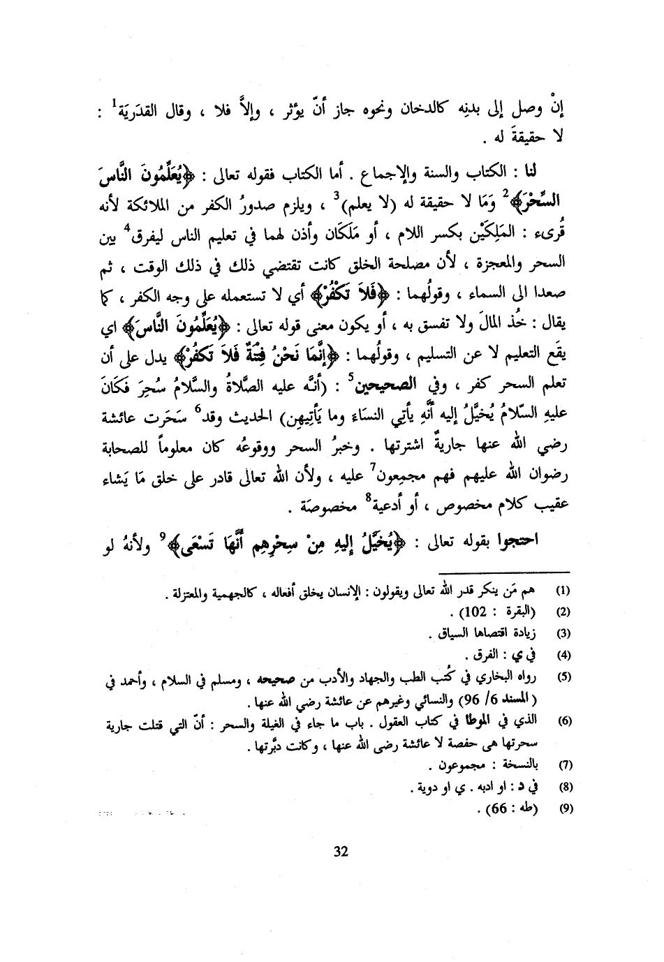 إِنْ وَصَلَ إِلَى بَدَنِهِ كَالدُّخَانِ وَنَحْوِهِ جَازَ أَنْ يُؤَثِّرَ وَإِلَّا فَلَا وَقَالَ الْقَدَرِيَّةُ لَا حَقِيقَةَ لَهُ لَنَا الْكِتَابُ وَالسُّنَّةُ وَالْإِجْمَاعُ أَمَّا الْكِتَابُ فَقَوْلُهُ تَعَالَى {يعلمُونَ النَّاس السحر} وَمَا لَا حَقِيقَة لَهُ (لَا يعلم) وَيلْزم صُدُور الْكفْر من الْمَلَائِكَة لِأَنَّهُ قرىء الْملكَيْنِ بِكَسْر اللَّام أَو مَلِكَانِ وَأُذِنَ لَهُمَا فِي تَعْلِيمِ النَّاسِ لِيُفَرَّقَ بَيْنَ السَّحَرِ وَالْمُعْجِزَةِ لِأَنَّ مَصْلَحَةَ الْخَلْقِ كَانَتْ تَقْتَضِي ذَلِكَ فِي ذَلِكَ الْوَقْتِ ثُمَّ صَعَدَا إِلَى السَّمَاء وقولهما {فَلَا تكفر} أَيْ لَا تَسْتَعْمِلْهُ عَلَى وَجْهِ الْكُفْرِ كَمَا يُقَالُ خُذِ الْمَالَ وَلَا تَفْسُقْ بِهِ أَوْ يكون معنى قَوْله تَعَالَى {يعلمُونَ النَّاس} أَيْ يَقَعُ التَّعْلِيمُ لَا عَنِ التَّسْلِيمِ وَقَوْلُهُمَا {إِنَّمَا نَحن فتْنَة فَلَا تكفر} يَدُلُّ عَلَى أَنَّ تَعَلُّمَ السِّحْرِ كُفْرٌ وَفِي الصَّحِيحَيْنِ (أَنَّهُ عَلَيْهِ الصَّلَاةُ وَالسَّلَامُ سُحِرَ فَكَانَ عَلَيْهِ السَّلَام يخيل إِلَيْهِ أَنَّهُ يَأْتِي النِّسَاءَ وَمَا يَأْتِيهِنَّ) الْحَدِيثَ وَقَدْ سَحَرَتْ عَائِشَةَ رَضِيَ اللَّهُ عَنْهَا جَارِيَةٌ اشْتَرَتْهَا وَخَبَرُ السِّحْرِ وَوُقُوعُهُ كَانَ مَعْلُومًا لِلصَّحَابَةِ رِضْوَانُ اللَّهِ عَلَيْهِمْ فَهُمْ مُجْمِعُونَ عَلَيْهِ وَلِأَنَّ اللَّهَ تَعَالَى قَادِرٌ عَلَى خَلْقِ مَا يَشَاءُ عَقِيبَ كَلَامٍ مَخْصُوصٍ أَوْ أَدْعِيَةٍ مَخْصُوصَةٍ احْتَجُّوا بِقَوْلِهِ تَعَالَى {يُخَيَّلُ إِلَيْهِ مِنْ سِحْرِهِمْ أَنَّهَا تَسْعَى} وَلِأَنَّهُ لَو