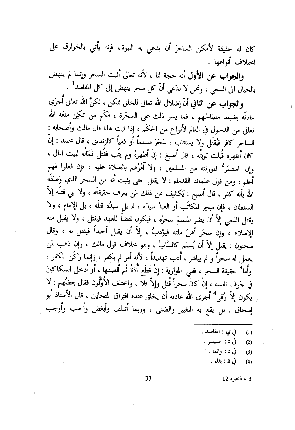 وَالْجَوَاب عَن الثَّانِي أَن أَنَّ إِضْلَالَ اللَّهِ تَعَالَى لِلْخَلْقِ مُمْكِنٌ لَكِنَّ اللَّهَ تَعَالَى أَجْرَى عَادَتَهُ بِضَبْطِ مَصَالِحِهِمْ فَمَا يَسَّرَ ذَلِكَ عَلَى السَّحَرَةِ فَكَمْ مِنْ مُمْكِنٍ مَنَعَهُ اللَّهُ تَعَالَى مِنَ الدُّخُولِ فِي الْعَالَمِ لِأَنْوَاعٍ مِنَ الْحِكَمِ إِذَا ثَبَتَ هَذَا قَالَ مَالِكٌ وَأَصْحَابُهُ السَّاحِرُ كَافِرٌ فَيُقْتَلُ وَلَا يُسْتَتَابُ سَحَرَ مُسْلِمًا أَوْ ذِمِّيًّا كَالزِّنْدِيقِ قَالَ مُحَمَّدٌ إِنْ كَانَ أَظْهَرَهُ قُبِلَتْ تَوْبَتُهُ قَالَ أَصْبَغُ إِنْ أَظْهَرَهُ وَلَمْ يَتُبْ فَقُتِلَ فَمَالُهُ لِبَيْتِ الْمَالِ وَإِنِ اسْتَسَرَّ فَلِوَرَثَتِهِ مِنَ الْمُسْلِمِينَ وَلَا آمُرُهُمْ بِالصَّلَاةِ عَلَيْهِ فَإِنْ فَعَلُوا فَهُمْ أَعْلَمُ وَمِنْ قَوْلِ عُلَمَائِنَا الْقُدَمَاءِ لَا يُقْتَلُ حَتَّى يَثْبُتَ أَنَّهُ مِنَ السِّحْرِ الَّذِي وَصَفَهُ اللَّهُ بِأَنَّهُ كُفْرٌ قَالَ أَصْبَغُ يَكْشِفُ عَنْ ذَلِكَ مَنْ يَعْرِفُ حَقِيقَتَهُ وَلَا يَلِي قَتْلَهُ إِلَّا السُّلْطَانُ فَإِنْ سَحَرَ الْمُكَاتَبُ أَوِ الْعَبْدُ سَيِّدَهُ لَمْ يَلِ سَيِّدُهُ قَتْلَهُ بَلِ الْإِمَامُ وَلَا يُقْتَلُ الذِّمِّيُّ إِلَّا أَنْ يَضُرَّ الْمُسْلِمَ سِحْرُهُ فَيَكُونُ نَقْضًا لِلْعَهْدِ فَيُقْتَلُ وَلَا يُقْبَلُ مِنْهُ الْإِسْلَامُ وَإِنْ سَحَرَ أَهْلَ مِلَّتِهِ فَيُؤَدَّبُ إِلَّا أَنْ يَقْتُلَ أَحَدًا فَيُقْتَلَ بِهِ وَقَالَ سَحْنُونٌ يُقْتَلُ إِلَّا أَنْ يُسْلِمَ كَالسَّابِّ وَهُوَ خِلَافُ قَوْلِ مَالِكٍ وَإِنْ ذَهَبَ لِمَنْ يَعْمَلُ لَهُ سِحْرًا وَلَمْ يُبَاشِرْ أُدِّبَ تَهْدِيدًا لِأَنَّهُ أَمْرٌ لَمْ يُكَفَّرْ وَإِنَّمَا رَكَنَ لِلْكُفْرِ وَأَمَّا حَقِيقَةُ السِّحْرِ فَفِي الْمَوَّازِيَّةِ إِنْ قَطَعَ أُذُنًا ثُمَّ الصقها أَوْ أَدْخَلَ السَّكَاكِينَ فِي جَوْفِ نَفْسِهِ إِنْ كَانَ سحرًا قتل وَإِلَّا فَلَا وَاخْتلف الْأَولونَ فَقَالَ بَعْضُهُمْ لَا يَكُونُ إِلَّا رُقًى أَجْرَى اللَّهُ عَادَتَهُ أَنْ يَخْلُقَ عِنْدَهُ افْتِرَاقَ الْمُتَحَابِّينَ قَالَ الْأُسْتَاذُ أَبُو إِسْحَاقَ بَلْ يَقَعُ بِهِ التَّغْيِيرُ وَالضَّنَى وَرُبَّمَا أَتْلَفَ وَأَبْغَضَ وَأَحَبَّ وَأَوْجَبَ