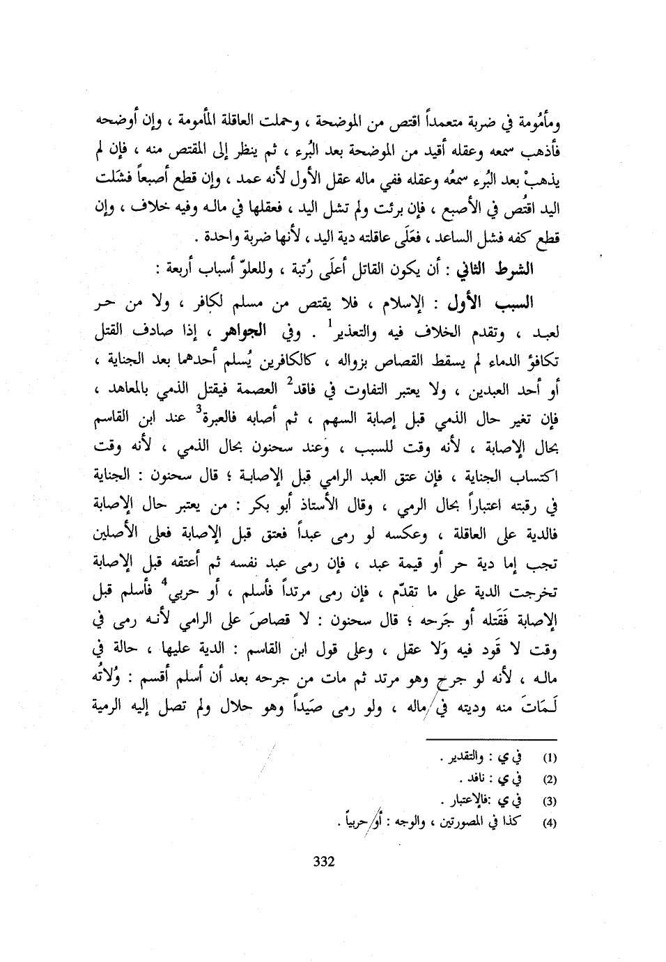 وَمَأْمُومَةً فِي ضَرْبَةٍ مُتَعَمِّدًا اقْتُصَّ مِنَ الْمُوَضِّحَةِ وَحَمَلَتِ الْعَاقِلَةُ الْمَأْمُومَةَ وَإِنْ أَوْضَحَهُ فَأَذْهَبَ سَمْعَهُ وَعَقْلَهُ أُقِيدَ مِنَ الْمُوَضِّحَةِ بَعْدَ الْبُرْءِ ثُمَّ يُنْظَرُ إِلَى الْمُقْتَصِّ مِنْهُ فَإِنْ لَمْ يَذْهَبْ بَعْدَ الْبُرْءِ سَمْعُهُ وَعَقْلُهُ فَفِي مَالِهِ عَقْلُ الْأَوَّلِ لِأَنَّهُ عَمْدٌ وَإِنْ قَطَعَ أُصْبُعًا فَشُلَّتِ الْيَدُ اقْتُصَّ فِي الْأُصْبُعِ فَإِنْ بَرِئَتْ وَلَمْ تُشَلَّ الْيَدُ فَعَقْلُهَا فِي مَالِهِ وَفِيهِ خِلَافٌ وَإِنْ قَطَعَ كَفَّهُ فَشُلَّ السَّاعِدُ فَعَلَى عَاقِلَتِهِ دِيَةُ الْيَدِ لِأَنَّهَا ضَرْبَةٌ وَاحِدَةٌ الشَّرْطُ الثَّانِي أَن يكون الْقَاتِل أَعلَى رُتْبَة وللعلو أساب أَرْبَعَةٌ السَّبَبُ الْأَوَّلُ الْإِسْلَامُ فَلَا يُقْتَصُّ مِنْ مُسْلِمٍ لِكَافِرٍ وَلَا مِنْ حُرٍّ لِعَبْدٍ وَتَقَدَّمَ الْخلاف فِيهِ والتعذير وَفِي الْجَوَاهِرِ إِذَا صَادَفَ الْقَتْلُ تَكَافُؤَ الدِّمَاءِ لَمْ يَسْقُطِ الْقِصَاصُ بِزَوَالِهِ كَالْكَافِرَيْنِ يُسْلِمُ أَحَدُهُمَا بَعْدَ الْجِنَايَةِ أَوْ أَحَدُ الْعَبْدَيْنِ وَلَا يُعْتَبَرُ التَّفَاوُتُ فِي فَاقِدِ الْعِصْمَةِ فَيُقْتَلُ الذِّمِّيُّ بِالْمُعَاهِدِ فَإِنْ تَغَيَّرَ حَالُ الذِّمِّيِّ قَبْلَ إِصَابَةِ السَّهْمِ ثمَّ إِصَابَةِ السَّهْمِ ثُمَّ أَصَابَهُ فَالْعِبْرَةُ عِنْدَ ابْنِ الْقَاسِمِ بِحَالِ الْإِصَابَةِ لِأَنَّهُ وَقْتٌ لِلسَّبْبِ وَعِنْدَ سَحْنُون حبال الذِّمِّيِّ لِأَنَّهُ وَقْتُ اكْتِسَابِ الْجِنَايَةِ فَإِنْ عُتِقَ الْعَبْدُ الرَّامِي قَبْلَ الْإِصَابَةِ قَالَ سَحْنُونٌ الْجِنَايَةُ فِي رَقَبَتِهِ اعْتِبَارًا بِحَالِ الرَّمْيِ وَقَالَ الْأُسْتَاذُ أَبُو بَكْرٍ مَنْ يَعْتَبِرُ حَالَ الْإِصَابَةِ فَالدِّيَةُ عَلَى الْعَاقِلَةِ وَعَكْسُهُ لَوْ رَمَى عَبْدًا فَعُتِقَ قَبْلَ الْإِصَابَةِ فَعَلَى الْأَصْلَيْنِ تَجِبُ إِمَّا دِيَةُ حُرٍّ أَوْ قِيمَةُ عَبْدٍ فَإِنْ رَمَى عَبْدٌ نَفْسَهُ ثُمَّ أَعْتَقَهُ قَبْلَ الْإِصَابَةِ تَخَرَّجَتِ الدِّيَةُ عَلَى مَا تَقَدَّمَ فَإِنْ رَمَى مُرْتَدًّا فَأَسْلَمَ أَوْ حَرْبِيٌّ فَأَسْلَمَ قَبْلَ الْإِصَابَةِ فَقَتَلَهُ أَوْ جَرَحَهُ قَالَ سَحْنُونٌ لَا قِصَاصَ عَلَى الرَّامِي لِأَنَّهُ رَمَى فِي وَقْتٍ لَا قَوَدَ فِيهِ وَلَا عَقْلَ وَعَلَى قَوْلِ ابْنِ الْقَاسِمِ الدِّيَةُ عَلَيْهَا حَالَّةٌ فِي مَالِهِ لِأَنَّهُ لَوْ جُرِحَ وَهُوَ مُرْتَدٌّ ثُمَّ مَاتَ مِنْ جُرْحِهِ بَعْدَ أَنْ أَسْلَمَ أَقْسَمَ وُلَاتُهُ لَمَاتَ مِنْهُ وَدِيَتُهُ فِي مَالِهِ وَلَوْ رَمَى صَيْدًا وَهُوَ حَلَالٌ وَلَمْ تَصِلْ إِلَيْهِ الرَّمْيَةُ
