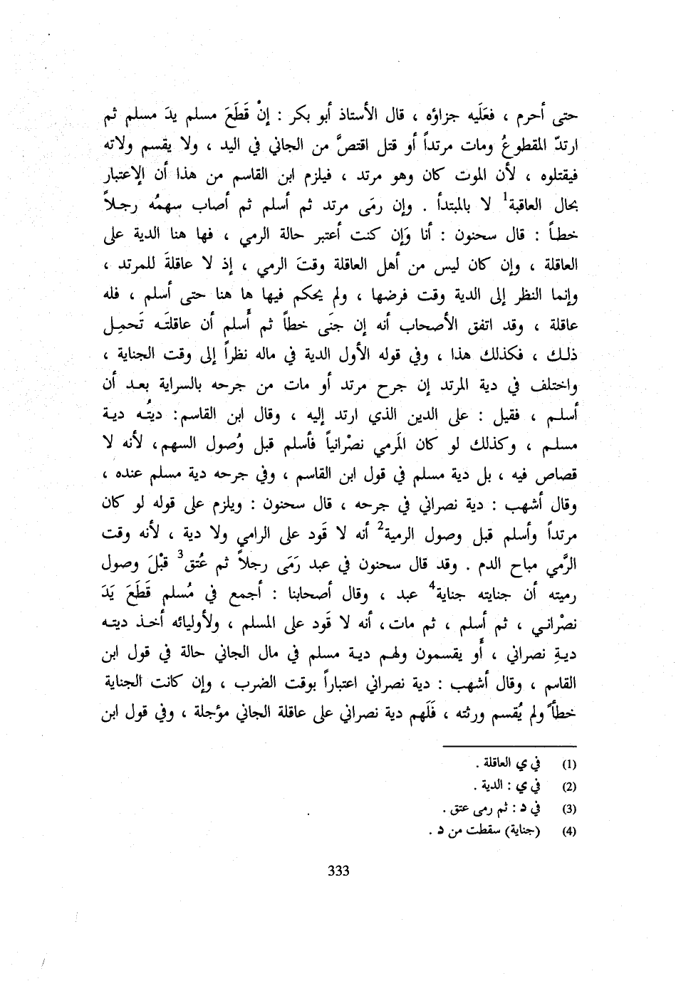 حَتَّى أَحْرَمَ فَعَلَيْهِ جَزَاؤُهُ قَالَ الْأُسْتَاذُ أَبُو بَكْرٍ إِنْ قَطَعَ مُسْلِمٌ يَدَ مُسْلِمٍ ثُمَّ ارْتَدَّ الْمَقْطُوع وماتمرتدا أَو قتل اقْتصّ منا لجاني فِي الْيَدِ وَلَا يُقْسِمُ وُلَاتُهُ فَيَقْتُلُوهُ لِأَنَّ الْمَوْتَ كَانَ وَهُوَ مُرْتَدٌّ فَيُلْزِمُ ابْنُ الْقَاسِمِ مِنْ هَذَا أَنَّ الِاعْتِبَارَ بِحَالِ الْعَاقِبَةِ لَا بِالْمُبْتَدَأِ وَإِنْ رَمَى مُرْتَدٌّ ثُمَّ أَسْلَمَ ثُمَّ أَصَابَ سَهْمُهُ رَجُلًا خَطَأً قَالَ سَحْنُونٌ أَنَا وَإِن كنت أعتبر حَالَة الرَّمْي فها هُنَا الدِّيَةُ عَلَى الْعَاقِلَةِ وَإِنْ كَانَ لَيْسَ مِنْ أَهْلِ الْعَاقِلَةِ وَقْتَ الرَّمْيِ إِذْ لَا عَاقِلَةَ لِلْمُرْتَدِّ وَإِنَّمَا النَّظَرُ إِلَى الدِّيَةِ وَقْتَ فَرْضِهَا وَلم يحكم فِيهَا هَا هُنَا حَتَّى أَسْلَمَ فَلَهُ عَاقِلَةٌ وَقَدِ اتَّفَقَ الْأَصْحَابُ أَنَّهُ إِنْ جَنَى خَطَأً ثُمَّ أَسْلَمَ أَنَّ عَاقِلَتَهُ تَحْمِلُ ذَلِكَ فَكَذَلِكَ هَذَا وَفِي قَوْلِهِ الْأَوَّلِ الدِّيَةُ فِي مَالِهِ نَظَرًا إِلَى وَقْتِ الْجِنَايَةِ وَاخْتُلِفَ فِي دِيَةِ الْمُرْتَدِّ إِنْ جُرِحَ مُرْتَدٌّ أَوْ مَاتَ مِنْ جُرْحِهِ بِالسِّرَايَةِ بَعْدَ أَن أسلم فقيلعلى الدَّيْنِ الَّذِي ارْتَدَّ إِلَيْهِ وَقَالَ ابْنُ الْقَاسِمِ دِيَتُهُ دِيَةُ مُسْلِمٍ وَكَذَلِكَ لَوْ كَانَ الْمَرْمِيُّ نَصْرَانِيًّا فَأَسْلَمَ قَبْلَ وُصُولِ السَّهْمِ لِأَنَّهُ لَا قِصَاصَ فِيهِ بَلْ دِيَةُ مُسْلِمٍ فِي قَوْلِ ابْنِ الْقَاسِمِ وَفِي جُرْحِهِ دِيَةُ مُسْلِمٍ عِنْدَهُ وَقَالَ أَشْهَبُ دِيَةُ نَصْرَانِيٍّ فِي جُرْحِهِ قَالَ سَحْنُونٌ وَيَلْزَمُ عَلَى قَوْلِهِ لَوْ كَانَ مُرْتَدًّا وَأَسْلَمَ قَبْلَ وُصُولِ الرَّمْيَةِ أَنَّهُ لَا قَوَدَ على الرَّامِي ولاد دِيَةَ لِأَنَّهُ وَقْتَ الرَّمْيِ مُبَاحُ الدَّمِ وَقَدْ قَالَ سَحْنُونٌ فِي عَبْدٍ رَمَى رَجُلًا ثُمَّ عُتِقَ قَبْلَ وُصُولِ رَمْيَتِهِ إِنَّ جِنَايَتَهُ جِنَايَةُ عَبْدٍ وَقَالَ أَصْحَابُنَا أَجْمَعُ فِي مُسْلِمٍ قَطَعَ يَدَ نَصْرَانِيٍّ ثُمَّ أَسْلَمَ ثُمَّ مَاتَ أَنَّهُ لَا قَوَدَ عَلَى الْمُسْلِمِ وَلِأَوْلِيَائِهِ أَخْذُ دِيَتِهِ دِيَةَ نَصْرَانِيٍّ أَوْ يُقْسِمُونَ وَلَهُمْ دِيَةُ مُسْلِمٍ فِي مَالِ الْجَانِي حَالَّةً فِي قَوْلِ ابْنِ الْقَاسِمِ وَقَالَ أَشْهَبُ دِيَةُ نَصْرَانِيٍّ اعْتِبَارًا بِوَقْتِ الضَّرْب وَإِن كَانَت الْجِنَايَة خطأ وليم يُقْسِمْ وَرَثَتُهُ فَلَهُمْ دِيَةُ نَصْرَانِيٍّ عَلَى عَاقِلَةِ الْجَانِي مُؤَجَّلَةٌ وَفِي قَوْلِ ابْنِ