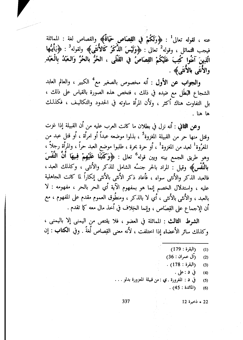 عَنْهُ لِقَوْلِهِ تَعَالَى {وَلَكُمْ فِي الْقِصَاصِ حَيَاةٌ} وَالْقِصَاصُ لُغَةً الْمُمَاثَلَةُ فَيَجِبُ التَّمَاثُلُ وقَوْله تَعَالَى {وَلَيْسَ الذّكر كالأنثى} وَلِقَوْلِهِ {يَا أَيُّهَا الَّذِينَ آمَنُوا كُتِبَ عَلَيْكُمُ الْقِصَاصُ فِي الْقَتْلَى الْحُرُّ بِالْحُرِّ وَالْعَبْدُ بِالْعَبْدِ وَالْأُنْثَى بِالْأُنْثَى} وَالْجَوَابُ عَنِ الْأَوَّلِ أَنَّهُ مَخْصُوصٌ بِالصَّغِيرِ مَعَ الْكَبِيرِ وَالْعَالِمِ الْعَابِدِ الشُّجَاعِ الْبَطَلِ مَعَ ضِدِّهِ فِي ذَلِكَ فَتُخَصُّ هَذِهِ الصُّورَةُ بِالْقِيَاسِ عَلَى ذَلِكَ بَلِ التَّفَاوُتُ هُنَاكَ أَكْثَرُ وَلِأَنَّ الْمَرْأَةَ ساوته فِي الْحُدُود والتكاليف فَكَذَلِك هَا هُنَا وَعَنِ الثَّانِي أَنَّهُ نَزَلَ فِي بُطْلَانِ مَا كَانَتِ الْعَرَبُ عَلَيْهِ مِنْ أَنَّ الْقَبِيلَةَ إِذَا غَزَتْ وَقُتِلَ مِنْهَا حُرٌّ مِنَ الْقَبِيلَةِ الْمَغْزُوَّةِ بَذَلُوا مَوْضِعَهُ عَبْدًا أَوِ امْرَأَةً أَوْ قُتِلَ عبد من المغروة لِعَبْدٍ مِنَ الْمَغْزُوَّةِ أَوْ حُرَّةٍ بِحُرَّةٍ طَلَبُوا مَوْضِعَ الْعَبْدِ حُرًّا وَالْمَرْأَةِ رَجُلًا وَهُوَ طَرِيقُ الْجَمْعِ بَيْنَهُ وَبَيْنَ قَوْله تَعَالَى {وَكَتَبْنَا عَلَيْهِمْ فِيهَا أَن النَّفس بِالنَّفسِ} وَقِيلَ الْمُرَادُ بِالْحُرِّ جِنْسُهُ الشَّامِلُ لِلذَّكَرِ وَالْأُنْثَى وَكَذَلِكَ العَبْد فَالْعَبْد وَالْأُنْثَى سَوَاءٌ فَأَعَادَ ذِكْرَ الْأُنْثَى بِالْأُنْثَى إِنْكَارًا لِمَا كَانَتِ الْجَاهِلِيَّةُ عَلَيْهِ وَاسْتِدْلَالُ الْخَصْمِ إِنَّمَا هُوَ بِمَفْهُومِ الْآيَةِ أَيِ الْحُرُّ بِالْحُرِّ مَفْهُومُهُ لَا أَنَّ الْإِجْمَاعَ عَلَى الْقِصَاصِ وَإِنَّمَا الْخِلَافُ فِي أَخْذِ مَالٍ مَعَهُ كَمَا تَقَدَّمَ الشَّرْطُ الثَّالِثُ الْمُمَاثلَة فِي الْعُضْو فَلَا يُقْتَصُّ مِنَ الْيُمْنَى إِلَّا بِالْيُمْنَى وَكَذَلِكَ سَائِر الْأَعْضَاء إِذا اخْتلفت لِأَنَّهُ مَعْنَى الْقِصَاصِ لُغَةً وَفِي الْكِتَابِ إِنْ