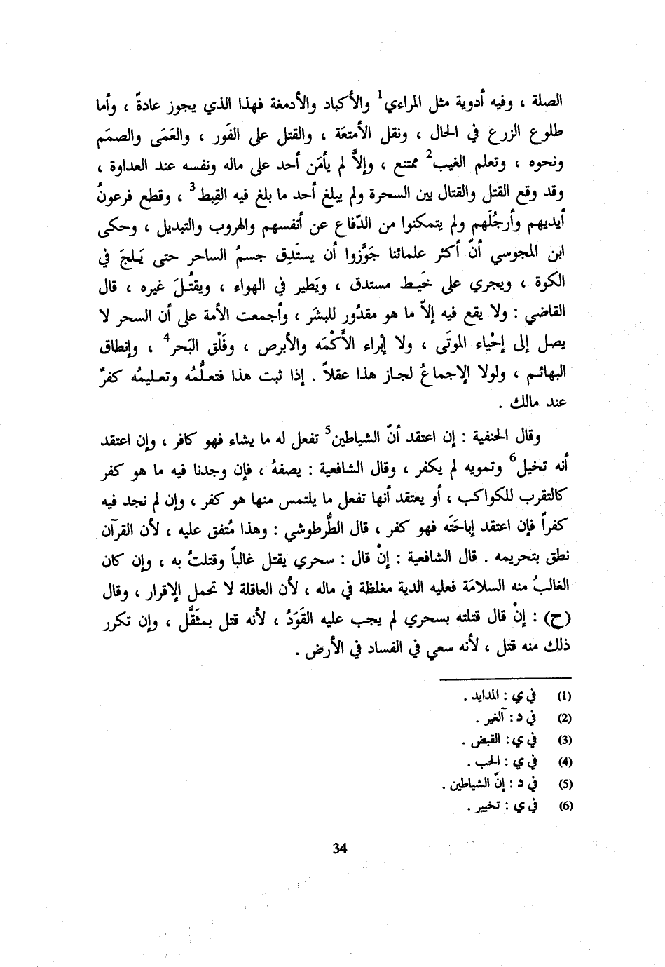 الصِّلَة وَفِيه أدوية مثل المراءي وَالْأَكْبَادِ وَالْأَدْمِغَةِ فَهَذَا الَّذِي يَجُوزُ عَادَةً وَأَمَّا طُلُوعُ الزَّرْعِ فِي الْحَالِ وَنَقْلُ الْأَمْتِعَةِ وَالْقَتْلُ على الْفَوْر والعمى والصم وَنَحْوُهُ وَتَعَلُّمُ الْغَيْبِ مُمْتَنِعٌ وَإِلَّا لَمْ يَأْمَنْ أَحَدٌ عَلَى مَالِهِ وَنَفْسِهِ عِنْدَ الْعَدَاوَةِ وَقَدْ وَقَعَ الْقَتْلُ وَالْقِتَالُ بَيْنَ السَّحَرَةِ وَلَمْ يَبْلُغْ أَحَدٌ مَا بَلَغَ فِيهِ الْقِبْطُ وَقَطَعَ فِرْعَوْنُ أَيْديهم وأرجلهم وَلم يتمكنوا من الدفاع عَن أنفسهم والهروب والتبديل وَحكى ابْن الْمَجُوسِيّ أَنَّ أَكْثَرَ عُلَمَائِنَا جَوَّزُوا أَنْ يَسْتَدِقَّ جِسْمُ السَّاحِرِ حَتَّى يَلِجَ فِي الْكُوَّةِ وَيَجْرِيَ عَلَى خَيْطٍ مُسْتَدَقٍّ وَيَطِيرَ فِي الْهَوَاءِ وَيَقْتُلَ غَيْرَهُ قَالَ القَاضِي وَلَا يعق فِيهِ إِلَّا مَا هُوَ مَقْدُورٌ لِلْبَشَرِ وَأَجْمَعْتِ الْأُمَّةُ عَلَى أَنَّ السِّحْرَ لَا يَصِلُ إِلَى إِحْيَاءِ الْمَوْتَى وَلَا إِبْرَاءِ الْأَكْمَهِ وَالْأَبْرَصِ وَفَلْقِ الْبَحْرِ وَإِنْطَاقِ الْبَهَائِمِ وَلَوْلَا الْإِجْمَاعُ لَجَازَ هَذَا عَقْلًا إِذَا ثَبَتَ هَذَا فَتَعَلُّمُهُ وَتَعْلِيمُهُ كُفْرٌ عِنْدَ مَالِكٍ وَقَالَ الْحَنَفِيَّةُ إِنِ اعْتَقَدَ أَنَّ الشَّيَاطِينَ تَفْعَلُ لَهُ مَا يَشَاءُ فَهُوَ كَافِرٌ وَإِن اعْتقد أَنه تخيل وَتَمْوِيهٌ لَمْ يَكْفُرْ وَقَالَ الشَّافِعِيَّةُ يَصِفُهُ فَإِنْ وَجَدْنَا فِيهِ مَا هُوَ كُفْرٌ كَالتَّقَرُّبِ لِلْكَوَاكِبِ أَو يعْتَقد أَنه تَفْعَلُ مَا يُلْتَمَسُ مِنْهَا هُوَ كُفْرٌ وَإِنْ لَمْ نَجِدْ فِيهِ كُفْرًا فَإِنِ اعْتَقَدَ إِبَاحَتَهُ فَهُوَ كُفْرٌ قَالَ الطَّرْطُوشِيُّ وَهَذَا مُتَّفَقٌ عَلَيْهِ لِأَنَّ الْقُرْآنَ نَطَقَ بِتَحْرِيمِهِ قَالَ الشَّافِعِيَّةُ إِنْ قَالَ سِحْرِي يَقْتُلُ غَالِبًا وَقَتَلْتُ بِهِ وَإِنْ كَانَ الْغَالِبُ مِنْهُ السَّلَامَةُ فَعَلَيْهِ الدِّيَةُ مُغَلَّظَةٌ فِي مَالِهِ لِأَنَّ الْعَاقِلَةَ لَا تَحْمِلُ الْإِقْرَارَ وَقَالَ (ح) إِنْ قَالَ قَتَلْتُهُ بِسِحْرِي لَمْ يَجِبْ عَلَيْهِ الْقَوَدُ لِأَنَّهُ قَتَلَ بِمُثَقَّلٍ وَإِنْ تَكَرَّرَ ذَلِكَ مِنْهُ قُتِلَ لِأَنَّهُ سَعْيٌ فِي الْفَسَادِ فِي الْأَرْضِ