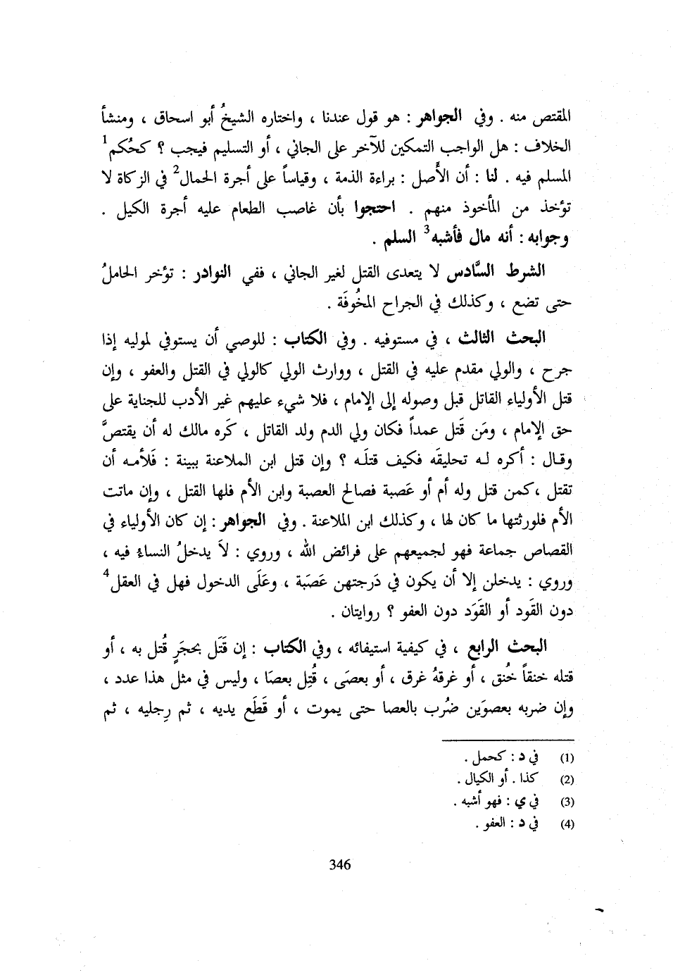 الْمُقْتَصِّ مِنْهُ وَفِي الْجَوَاهِرِ هُوَ قَوْلٌ عِنْدَنَا وَاخْتَارَهُ الشَّيْخُ أَبُو إِسْحَاقَ وَمَنْشَأُ الْخِلَافِ هَلِ الْوَاجِبُ التَّمْكِينُ لِلْآخَرِ عَلَى الْجَانِي أَوِ التَّسْلِيمُ فَيَجِبُ كَحُكْمِ الْمُسْلَمِ فِيهِ لَنَا أَنَّ الْأَصْلَ بَرَاءَة الذِّمَّة وَقِيَاسًا على أُجْرَة الْحمال فِي الزَّكَاةِ لَا تُؤْخَذُ مِنَ الْمَأْخُوذِ مِنْهُمْ احْتَجُّوا بِأَنَّ غَاصِبَ الطَّعَامِ عَلَيْهِ أُجْرَةُ الْكَيْلِ وَجَوَابُهُ أَنَّهُ مَالَ فَأَشْبَهَ السِّلْمَ الشَّرْطُ السَّادِسُ لَا يَتَعَدَّى الْقَتْلُ لِغَيْرِ الْجَانِي فَفِي النَّوَادِرِ تُؤَخَّرُ الْحَامِلُ حَتَّى تَضَعَ وَكَذَلِكَ فِي الْجِرَاحِ الْمَخُوفَةِ الْبَحْثُ الثَّالِثُ فِي مُسْتَوْفِيهِ وَفِي الْكِتَابِ لِلْوَصِيِّ أَنْ يَسْتَوْفِيَ لِمُوَلِّيهِ إِذَا جُرِحَ وَالْوَلِيُّ مُقَدَّمٌ عَلَيْهِ فِي الْقَتْلِ وَوَارِثُ الْوَلِيِّ كَالْوَلِيِّ فِي الْقَتْلِ وَالْعَفْوِ وَإِنْ قَتَلَ الْأَوْلِيَاءُ الْقَاتِلَ قَبْلَ وُصُولِهِ إِلَى الْإِمَامِ فَلَا شَيْءَ عَلَيْهِمْ غَيْرَ الْأَدَبِ لِلْجِنَايَةِ عَلَى حَقِّ الْإِمَامِ وَمَنْ قَتَلَ عَمْدًا فَكَانَ وَلِيُّ الدَّمِ وَلَدُ الْقَاتِلِ كَرِهَ مَالِكٌ لَهُ أَنْ يَقْتَصَّ وَقَالَ أَكْرَهُ لَهُ تَحْلِيقَهُ فَكَيْفَ قَتْلَهُ وَإِنْ قُتِلَ ابْنُ الْمُلَاعَنَةِ بِبَيِّنَةٍ فَلِأُمِّهِ أَنْ تَقْتُلَ كَمَنْ قُتِلَ وَلَهُ أُمٌّ أَوْ عَصَبَةٌ فَصَالَحَ الْعَصَبَةُ وَابْنُ الْأُمِّ فلهَا الْقَتْل وَإِن مَاتَت الم فَلِوَرَثَتِهَا مَا كَانَ لَهَا وَكَذَلِكَ ابْنُ الْمُلَاعَنَةِ وَفِي الْجَوَاهِرِ إِنْ كَانَ الْأَوْلِيَاءُ فِي الْقِصَاصِ جَمَاعَةٌ فَهُوَ لِجَمِيعِهِمْ عَلَى فَرَائِضِ اللَّهِ وَرُوِيَ لَا يَدْخُلُ النِّسَاءُ فِيهِ وَرُوِيَ يَدْخُلْنَ إِلَّا أَن يكون فِي درجتهن عصبَة وعَلى لدُخُول فَهَل فِي الْعقل دُونَ الْقَوَدِ أَوِ الْقَوَدِ دُونَ الْعَفْوِ رِوَايَتَانِ الْبَحْثُ الرَّابِعُ فِي كَيْفِيَّةِ اسْتِيفَائِهِ وَفِي الْكِتَابِ إِنْ قَتَلَ بِحَجَرٍ قُتِلَ بِهِ أَوْ قَتَلَهُ خنقا خنق أَو غرقه غرق أَو بعصى قُتِلَ بِعَصًا وَلَيْسَ فِي مِثْلِ هَذَا عَدَدٌ وَإِنْ ضَرَبَهُ بِعَصَوَيْنِ ضُرِبَ بِالْعَصَا حَتَّى يَمُوتَ أَوْ قَطَعَ يَدَيْهِ ثُمَّ رِجْلَيْهِ ثُمَّ