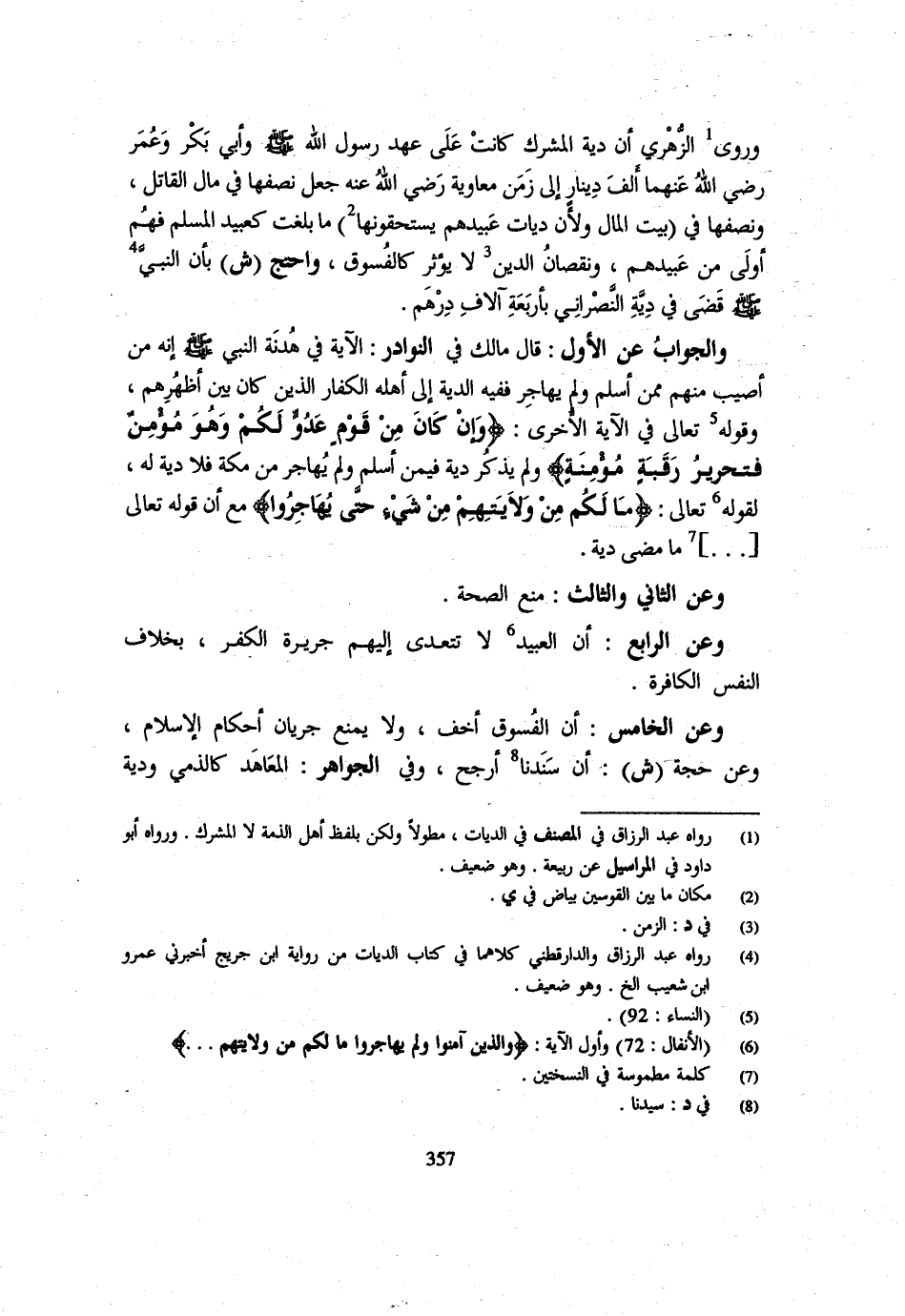 وَرَوَى الزُّهْرِيُّ أَنَّ دِيَةَ الْمُشْرِكِ كَانَتْ عَلَى عهد رَسُول الله وَأَبِي بَكْرٍ وَعُمَرَ رَضِيَ اللَّهُ عَنْهُمَا أَلْفَ دِينَارٍ إِلَى زَمَنِ مُعَاوِيَةَ رَضِيَ اللَّهُ عَنْهُ جَعَلَ نِصْفَهَا فِي مَالِ الْقَاتِلِ وَنِصْفَهَا فِي (بَيْتِ الْمَالِ وَلِأَنَّ دِيَاتِ عَبِيدِهِمْ يَسْتَحِقُّونَهَا) مَا بَلَغَتْ كَعَبِيدِ الْمُسْلِمِ فَهُمْ أَوْلَى مِنْ عَبِيدِهِمْ وَنُقْصَانُ الدَّيْنِ لَا يُؤَثِّرُ كَالْفُسُوقِ وَاحْتَجَّ (ش) بِأَن النَّبِي - صَلَّى اللَّهُ عَلَيْهِ وَسَلَّم َ - قضى فِي دِيَة النَّصْرَانِي بأرقة آلَافِ دِرْهَمٍ وَالْجَوَابُ عَنِ الْأَوَّلِ قَالَ مَالِكٌ فِي النَّوَادِرِ الْآيَةُ فِي هُدْنَةِ النَّبِيِّ - صَلَّى اللَّهُ عَلَيْهِ وَسَلَّم َ - إِنَّهُ مَنْ أُصِيبَ مِنْهُمْ مِمَّنْ أَسْلَمَ وَلَمْ يُهَاجر فَفِيهِ الدِّيَة إِلَى أَهله الْكُفَّارِ الَّذِينَ كَانَ بَيْنَ أَظْهُرِهِمْ وقَوْله تَعَالَى فِي الْآيَة الْأُخْرَى {وَإِن كَانَ مِنْ قَوْمٍ عَدُوٍّ لَكُمْ وَهُوَ مُؤْمِنٌ فَتَحْرِير رَقَبَة مُؤمنَة} وَلَمْ يَذْكُرْ دِيَةً فِيمَنْ أَسْلَمَ وَلَمْ يُهَاجِرْ مِنْ مَكَّةَ فَلَا دِيَةَ لَهُ لِقَوْلِهِ تَعَالَى {مَا لَكُمْ مِنْ وَلايَتِهِمْ مِنْ شَيْءٍ حَتَّى يهاجروا} مَعَ أَن قَوْله تَعَالَى مَا مضى دِيَةً وَعَنِ الثَّانِي وَالثَّالِثِ مَنَعَ الصِّحَّةَ وَعَنِ الرَّابِعِ أَنَّ الْعَبِيدَ لَا تَتَعَدَّى إِلَيْهِمْ جَرِيرَةُ الْكُفْرِ بِخِلَافِ النَّفْسِ الْكَافِرَةِ وَعَنِ الْخَامِسِ أَنَّ الْفُسُوقَ أَخَفُّ وَلَا يَمْنَعُ جَرَيَانَ أَحْكَامِ الْإِسْلَامِ وَعَنْ حُجَّةِ (ش) أَنَّ سَنَدَنَا أَرْجَحُ وَفِي الْجَوَاهِرِ الْمُعَاهِدُ كَالذِّمِّيِّ وَدِيَةُ