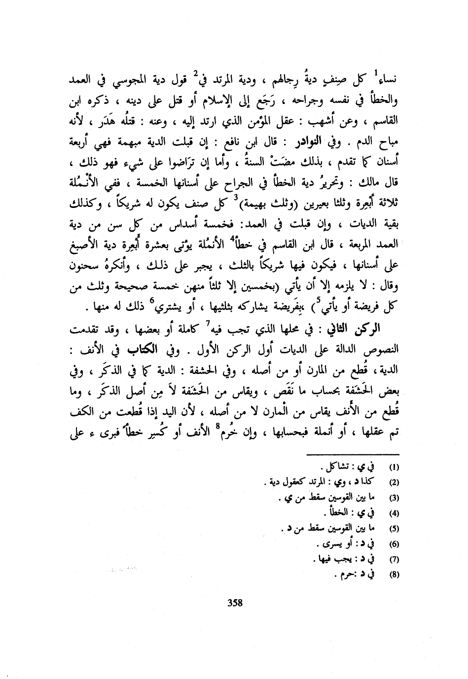 نِسَاءِ كُلِّ صِنْفٍ دِيَةُ رِجَالِهِمْ وَدِيَةُ الْمُرْتَدِّ فِي قَوْلٍ دِيَةُ الْمَجُوسِيِّ فِي الْعَمْدِ وَالْخَطَأِ فِي نَفسه وجرحه رَجَعَ إِلَى الْإِسْلَامِ أَوْ قُتِلَ عَلَى دَيْنِهِ ذَكَرَهُ ابْنُ الْقَاسِمِ وَعَنْ أَشْهَبَ عَقْلُ الْمُؤْمِنِ الَّذِي ارْتَدَّ إِلَيْهِ وَعَنْهُ قَتْلُهُ هَدَرٌ لِأَنَّهُ مُبَاحُ الدَّمِ وَفِي النَّوَادِرِ قَالَ ابْنُ نَافِعٍ إِنْ قُبِلَتِ الدِّيَةُ مُبْهَمَةً فَهِيَ أَرْبَعَةُ أَسْنَانٍ كَمَا تَقَدَّمَ بِذَلِكَ مَضَتِ السُّنَّةُ وَأَمَّا إِنْ تَرَاضَوْا عَلَى شَيْءٍ فَهُوَ ذَلِكَ قَالَ مَالِكٌ وَتَحْرِيرُ دِيَةِ الْخَطَأِ فِي الْجِرَاحِ عَلَى أَسْنَانِهَا الْخَمْسَة فَفِي الْأُنْمُلَة ثَلَاثَة أَبْعِرَة وَثُلُثَا بَعِيرَيْنِ (وَثُلُثُ بَهِيمَةٍ) كُلُّ صِنْفٍ يَكُونُ لَهُ شَرِيكًا وَكَذَلِكَ بَقِيَّةُ الدِّيَاتِ وَإِنْ قُبِلَتْ فِي الْعَمْدِ فَخَمْسَةُ أَسْدَاسٍ مِنْ كُلِّ سِنٍّ مِنْ دِيَةِ الْعَمْدِ الْمُرَبَّعَةِ قَالَ ابْنُ الْقَاسِمِ فِي خَطَأِ الْأُنْمُلَةِ يُؤْتَى بِعَشَرَةِ أَبْعِرَةِ دِيَةِ الْأَصْبَغ عَلَى أَسْنَانِهَا فَيَكُونُ فِيهَا شَرِيكًا بِالثُّلُثِ يُجْبَرُ عَلَى ذَلِكَ وَأَنْكَرَهُ سَحْنُونٌ وَقَالَ لَا يَلْزَمُهُ إِلَّا أَنْ يَأْتِيَ (بِخَمْسِينَ إِلَّا ثُلُثًا مِنْهُنَّ خَمْسَةٌ صَحِيحَةٌ وَثُلُثٌ مِنْ كُلِّ فَرِيضَةٍ أَوْ يَأْتِي) بِفَرِيضَةٍ يُشَارِكُهُ بِثُلُثَيْهَا أَوْ يَشْتَرِي ذَلِكَ لَهُ مِنْهَا الرُّكْنُ الثَّانِي فِي مَحَلِّهَا الَّذِي تَجِبُ فِيهِ كَامِلَةً أَوْ بَعْضَهَا وَقَدْ تَقَدَّمَتِ النُّصُوصُ الدَّالَّةُ عَلَى الدِّيَاتِ أَوَّلَ الرُّكْنِ الْأَوَّلِ وَفِي الْكِتَابِ فِي الْأَنْفِ الدِّيَةُ قَطَعَ مِنَ الْمَارِنِ أَوْ مِنْ أَصْلِهِ وَفِي الْحَشَفَةِ الدِّيَةُ كَمَا فِي الذَّكَرِ وَفِي بَعْضِ الْحَشَفَةِ بِحِسَابِ مَا نَقَصَ وَيُقَاسُ مِنَ الْحَشَفَةِ لَا مِنْ أَصْلِ الذَّكَرِ وَمَا قَطَعَ مِنَ الْأَنْفِ يُقَاسُ مِنَ الْمَارِنِ لَا مِنْ أَصْلِهِ لِأَنَّ الْيَدَ إِذَا قُطِعَتْ مِنَ الْكَفِّ تَمَّ عَقْلُهَا أَوْ أُنْمُلَةٌ فَبِحِسَابِهَا وَإِنْ خُرِمَ الْأَنْفُ أَوْ كُسِرَ خَطَأً فَبَرِئَ على