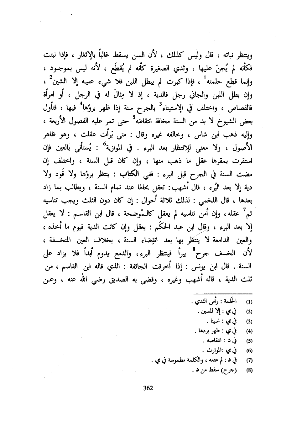 وَيُنْتَظَرُ نَبَاتُهُ قَالَ وَلَيْسَ كَذَلِكَ لِأَنَّ السِّنَّ يَسْقُطُ غَالِبًا بِالْإِثْغَارِ فَإِذَا نَبَتَتْ فَكَأَنَّهُ لَمْ يُجْنَ عَلَيْهَا وَثَدْيُ الصَّغِيرَةِ كَأَنَّهُ لَمْ يُقْطَعْ لِأَنَّهُ لَيْسَ بِمَوْجُودٍ وَإِنَّمَا قُطِعَ حَلَمَتُهُ فَإِذَا كَبرت لمي بَطل اللَّبَنُ فَلَا شَيْءَ عَلَيْهِ إِلَّا الشَّيْنُ وَإِنْ بَطل اللَّبن والجانب رَجُلٌ فَالدِّيَةُ إِذْ لَا مِثَالَ لَهُ فِي الرَّجُلِ أَوِ امْرَأَةٌ فَالْقِصَاصُ وَاخْتُلِفَ فِي الِاسْتِينَاءِ بِالْجُرْحِ سَنَةً إِذَا ظَهَرَ بُرْؤُهَا فِيهَا فَتَأَوَّلَ بَعْضُ الشُّيُوخِ لَا بُدَّ مِنَ السَّنَةِ مَخَافَةَ انْتِقَاضِهِ حَتَّى تَمُرَّ عَلَيْهِ الْفُصُولُ الْأَرْبَعَةُ وَإِلَيْهِ ذَهَبَ ابْنُ شَاسٍ وَخَالَفَهُ غَيْرُهُ وَقَالَ مَتَى بَرَأَتْ عُقِلَتْ وَهُوَ ظَاهِرُ الْأُصُولِ وَلَا مَعْنَى لِلِانْتِظَارِ بَعْدَ الْبُرْءِ فِي الْمَوَّازِيَّةِ يُسْتَأْنَى بِالْعَيْنِ فَإِنِ اسْتَقَرَّتْ بِمَقَرِّهَا عُقِلَ مَا ذَهَبَ مِنْهَا وَإِن كَانَ قبل السّنة وَاخْتلفت إِن مَضَت السّنة فِي الْجرْح قبل الْبُرْء فَفِي الْكِتَابِ يُنْتَظَرُ بُرْؤُهَا وَلَا قَوَدَ وَلَا دِيَةَ إِلَّا بَعْدَ الْبُرْءِ قَالَ أَشْهَبُ تُعْقَلُ بِحَالِهَا عِنْدَ تَمَامِ السَّنَةِ وَيُطَالَبُ بِمَا زَادَ بَعْدَهَا قَالَ اللَّخْمِيُّ لِذَلِكَ ثَلَاثَةُ أَحْوَالٍ إِنْ كَانَ دون الثُّلُث وَيجب تناسيه ثمَّ عقله وَإِن أَمن تناسيه لم يعقل كالموضحة قَالَ ابْن الْقَاسِم لَا يعق إِلَّا بَعْدَ الْبُرْءِ وَقَالَ ابْنُ عَبْدِ الْحَكَمِ يعقل وَإِن كَانَت الدِّيَة فَيوم مَا أَخَذَهُ وَالْعَيْنُ الدَّامِعَةُ لَا يُنْتَظَرُ بِهَا بَعْدَ انْقِضَاءِ السَّنَةِ بِخِلَافِ الْعَيْنِ الْمُنْخَسِفَةِ لِأَنَّ الْخَسْف جرح يبرأ فينتظر الْبُرْء والدمع لَا يَدُومُ أَبَدًا فَلَا يُزَادُ عَلَى السَّنَةِ قَالَ ابْنُ يُونُسَ إِذَا أُخْرِقَتِ الْجَائِفَةُ الَّذِي قَالَهُ ابْنُ الْقَاسِمِ مِنْ ثُلُثِ الدِّيَةِ قَالَهُ أَشْهَبُ وَغَيْرُهُ وَقَضَى بِهِ الصِّدِّيقُ رَضِيَ اللَّهُ عَنْهُ وَعَن