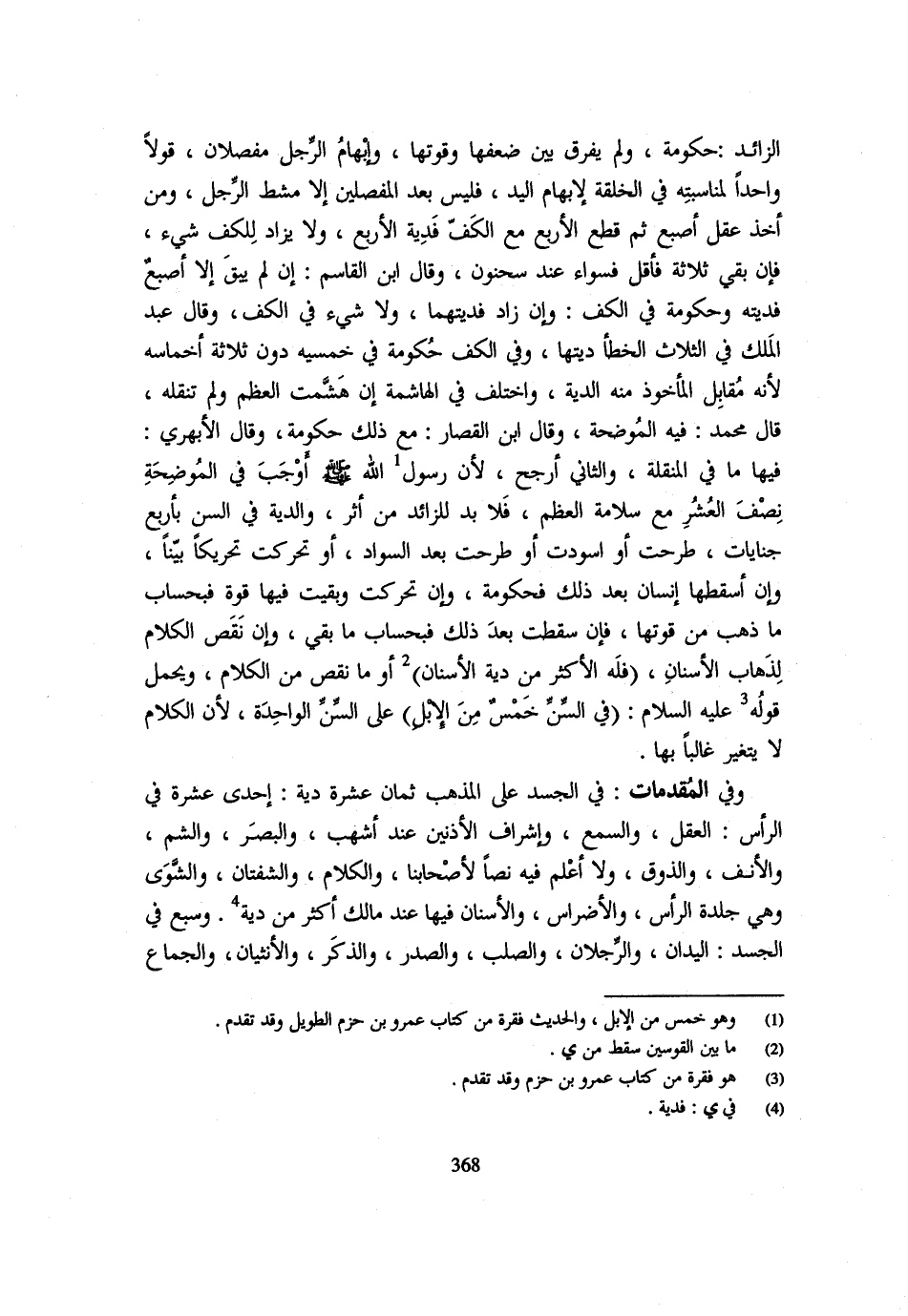 الزَّائِدِ حُكُومَةٌ وَلَمْ يُفَرِّقْ بَيْنَ ضَعْفِهَا وَقُوَّتِهَا وَإِبْهَامِ الرِّجْلِ مَفْصِلَانِ قَوْلًا وَاحِدًا لِمُنَاسَبَتِهِ فِي الْخلقَة لإبهام الْيَد فَلَيْسَ بعد المفصلين غلا مُشْطُ الرِّجْلِ وَمَنْ أَخَذَ عَقْلَ أُصْبُعٍ ثُمَّ قُطِعَ الْأَرْبَعُ مَعَ الْكَفِّ فِدْيَةُ الْأَرْبَعِ وَلَا يُزَادُ لِلْكَفِّ شَيْءٌ فَإِنْ بَقِيَ ثَلَاثَةٌ فَأَقَلُّ فَسَوَاءٌ عِنْدَ سَحْنُونٍ وَقَالَ ابْنُ الْقَاسِمِ إِنْ لَمْ يَبْقَ إِلَّا أُصْبُعٌ فَدِيَتُهُ وَحُكُومَةٌ فِي الْكَفِّ وَإِنْ زَادَ فَدِيَتُهُمَا وَلَا شَيْءَ فِي الْكَفِّ وَقَالَ عَبْدُ الْمَلِكِ فِي الثَّلَاثِ الْخَطَأِ دِيَتُهَا وَفِي الْكَفِّ حُكُومَةٌ فِي خُمْسَيْهِ دُونَ ثَلَاثَةِ أَخْمَاسِهِ لِأَنَّهُ مُقَابِلُ الْمَأْخُوذِ مِنْهُ الدِّيَةُ وَاخْتُلِفَ فِي الْهَاشِمَةِ إِنْ هَشَّمَتِ الْعَظْمَ وَلَمْ تُنَقِّلْهُ قَالَ مُحَمَّدٌ فِيهِ الْمُوَضِّحَةُ وَقَالَ ابْنُ الْقصار مَعَ ذَلِك حُكُومَة وَقَالَ الْأَبْهَرِيّ قيها مَا فِي المنقلة الثَّانِي أَرْجَحُ لِأَنَّ رَسُولَ اللَّهِ - صَلَّى اللَّهُ عَلَيْهِ وَسَلَّم َ - أَوْجَبَ فِي الْمُوَضِّحَةِ نِصْفُ الْعُشْرِ مَعَ سَلَامَةِ الْعظم فلابد لِلزَّائِدِ مِنْ أَثَرٍ وَالدِّيَةُ فِي السِّنِّ بِأَرْبَعِ جنانات طُرِحَتْ أَوِ اسْوَدَّتْ أَوْ طُرِحَتْ بَعْدَ السَّوَادِ أَوْ تَحَرَّكَتْ تَحْرِيكًا بَيِّنًا وَإِنْ أَسْقَطَهَا إِنْسَانٌ بَعْدَ ذَلِكَ فَحُكُومَةٌ وَإِنْ تَحَرَّكَتْ وَبَقِيَتْ فِيهَا قُوَّةٌ فَبِحِسَابِ مَا ذَهَبَ مِنْ قُوَّتِهَا فَإِنْ سَقَطَتْ بَعْدَ ذَلِكَ فَبِحِسَابِ مَا بَقِيَ وَإِنْ نَقُصَ الْكَلَامُ لِذَهَابِ الْأَسْنَانِ (فَلَهُ الْأَكْثَرُ مِنْ دِيَةِ الْأَسْنَانِ) أَوْ مَا نَقُصَ مِنَ الْكَلَامِ وَيُحْمَلُ قَوْلُهُ عَلَيْهِ السَّلَامُ (فِي السِّنِّ خَمْسٌ مِنَ الْإِبِلِ) عَلَى السِّنِّ الْوَاحِدَةِ لِأَنَّ الْكَلَامَ لَا يَتَغَيَّرُ غَالِبًا بِهَا وَفِي الْمُقَدِّمَاتِ فِي الْجَسَد على الْمَذْهَب ثَمَان عَشْرَةَ دِيَةً إِحْدَى عَشْرَةَ فِي الرَّأْسِ الْعَقْلُ وَالسَّمْعُ وَإِشْرَافُ الْأُذُنَيْنِ عِنْدَ أَشْهَبَ وَالْبَصَرُ وَالشَّمُّ وَالْأَنْفُ وَالذَّوْقُ وَلَا أَعْلَمُ فِيهِ نَصًّا لِأَصْحَابِنَا وَالْكَلَامُ وَالشَّفَتَانِ وَالشَّوَى وَهِيَ جِلْدَةُ الرَّأْسِ وَالْأَضْرَاسُ وَالْأَسْنَانُ فِيهَا عِنْدَ مَالِكٍ أَكْثَرُ مِنْ دِيَةٍ وَسَبْعٌ فِي الْجَسَدِ الْيَدَانِ وَالرِّجْلَانِ وَالصُّلْبُ وَالصَّدْرُ وَالذكر والأنثيان وَالْجِمَاع
