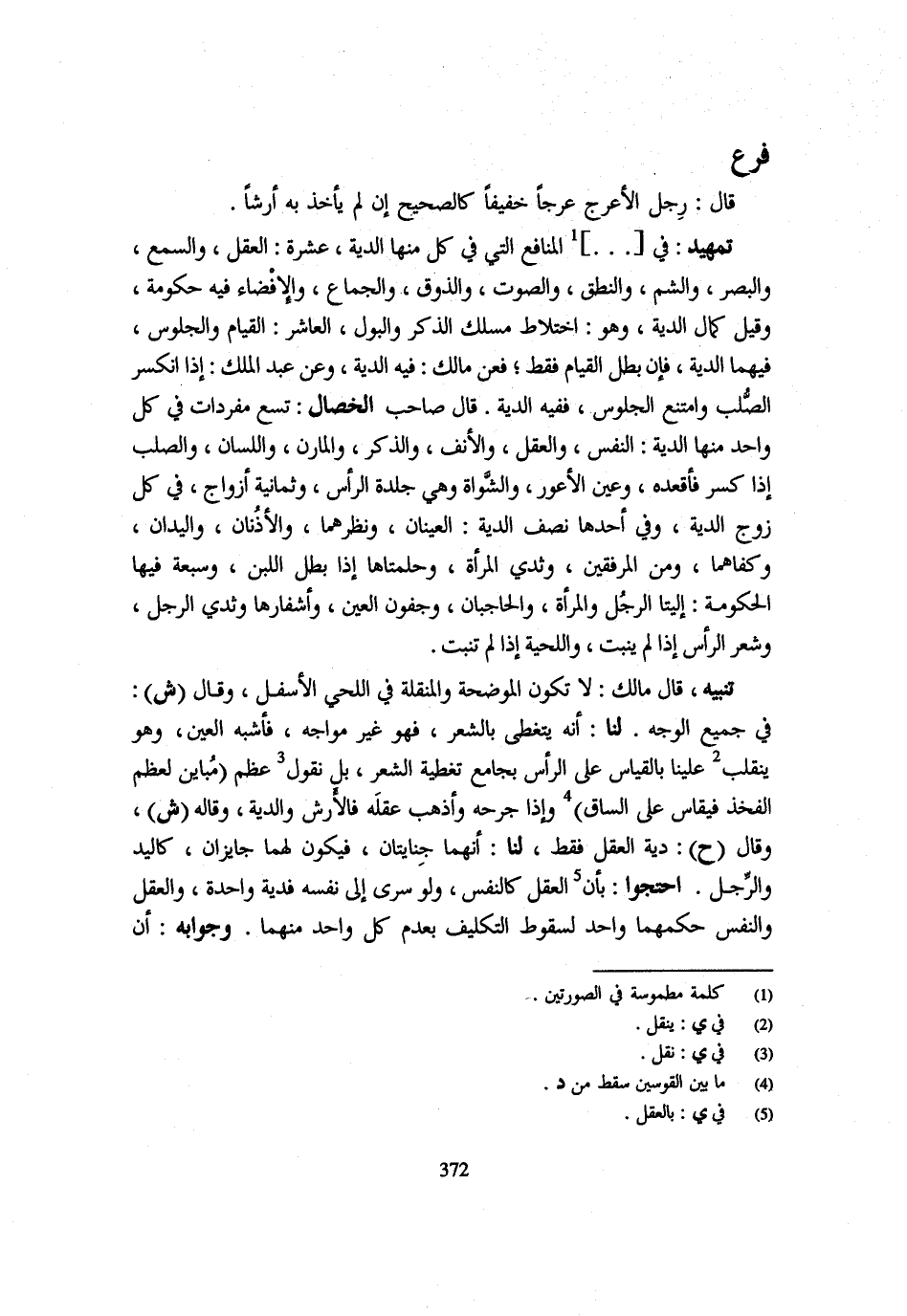 فَرْعٌ قَالَ رِجْلُ الْأَعْرَجِ عَرَجًا خَفِيفًا كَالصَّحِيحِ إِن لم يَأْخُذ بِهِ أرشا تمهيد فِي الْمَنَافِعِ الَّتِي فِي كُلٍّ مِنْهَا الدِّيَةُ عَشْرَةٌ الْعَقْلُ وَالسَّمْعُ وَالْبَصَرُ وَالشَّمُّ وَالنُّطْقُ وَالصَّوْتُ وَالذَّوْقُ وَالْجِمَاع والإقضاء فِيهِ حُكُومَةٌ وَقِيلَ كَمَالُ الدِّيَةِ وَهُوَ اخْتِلَاطُ مَسْلَكِ الذَّكَرِ وَالْبَوْلِ الْعَاشِرُ الْقِيَامُ وَالْجُلُوسُ فِيهِمَا الدِّيَةُ فَإِنْ بَطَلَ الْقِيَامُ فَقَطْ فَعَنْ مَالِكٍ فِيهِ الدِّيَةُ وَعَنْ عَبْدِ الْمَلِكِ إِذَا انْكَسَرَ الصُّلْبُ وَامْتَنَعَ الْجُلُوسُ فَفِيهِ الدِّيَةُ قَالَ صَاحِبُ الْخِصَالِ تِسْعٌ مُفْرَدَاتٌ فِي كُلِّ وَاحِدٍ مِنْهَا الدِّيَةُ النَّفْسُ وَالْعَقْلُ وَالْأَنْفُ وَالذَّكَرُ وَالْمَارِنُ وَاللِّسَانُ والصلب إِذا كسر فأقعده وَعين العور وَالشَّوَاةُ وَهِيَ جِلْدَةُ الرَّأْسِ وَثَمَانِيَةُ أَزْوَاجٍ فِي كُلِّ زَوْجٍ الدِّيَةُ وَفِي أَحَدِهَا نِصْفُ الدِّيَةِ الْعَيْنَانِ وَنَظَرُهُمَا وَالْأُذُنَانِ وَالْيَدَانِ وَكَفَّاهُمَا وَمِنَ الْمِرْفَقَيْنِ وَثَدْيُ الْمَرْأَةِ وَحَلَمَتَاهَا إِذَا بَطَلَ اللَّبَنُ وَسَبْعَةٌ فِيهَا الْحُكُومَةٌ إِلْيَتَا الرَّجُلِ وَالْمَرْأَةِ وَالْحَاجِبَانِ وَجُفُونُ الْعَيْنِ وَأَشْفَارُهَا وَثَدْيُ الرَّجُلِ وَشَعْرُ الرَّأْسِ إِذَا لَمْ يَنْبُتْ وَاللِّحْيَةُ إِذَا لَمْ تَنْبُتْ تَنْبِيهٌ قَالَ مَالِكٌ لَا تَكُونُ الْمُوَضِّحَةُ وَالْمُنَقِّلَةُ فِي اللَّحْيِ الْأَسْفَلِ وَقَالَ (ش) فِي جَمِيعِ الْوَجْهِ لَنَا أَنَّهُ يَتَغَطَّى بِالشَّعْرِ فَهُوَ غَيْرُ مُوَاجِهٍ فَأَشْبَهَ الْعَيْنَ وَهُوَ يَنْقَلِبُ عَلَيْنَا بِالْقِيَاسِ عَلَى الرَّأْسِ بِجَامِعِ تَغْطِيَةِ الشَّعْرِ بَلْ نَقُولُ عَظْمٌ (مُبَايِنٌ لِعَظْمِ الْفَخِذِ فَيُقَاسُ عَلَى السَّاقِ) وَإِذَا جَرَحَهُ وَأَذْهَبَ عَقْلَهُ فَالْأَرْشُ وَالدِّيَةُ وَقَالَهُ (ش) وَقَالَهُ (ح) دِيَةُ الْعَقْلِ فَقَطْ لَنَا أَنَّهُمَا جِنَايَتَانِ فَيكون لَهما جايزان كَالْيَدِ وَالرِّجْلِ احْتَجُّوا بِأَنَّ الْعَقْلَ كَالنَّفْسِ وَلَوْ سَرَى إِلَى نَفْسِهِ فَدِيَةٌ وَاحِدَةٌ وَالْعَقْلُ وَالنَّفْسُ حُكْمُهُمَا وَاحِدٌ لِسُقُوطِ التَّكْلِيفِ بِعَدَمِ كُلِّ وَاحِدٍ مِنْهُمَا وَجَوَابُهُ أَنَّ
