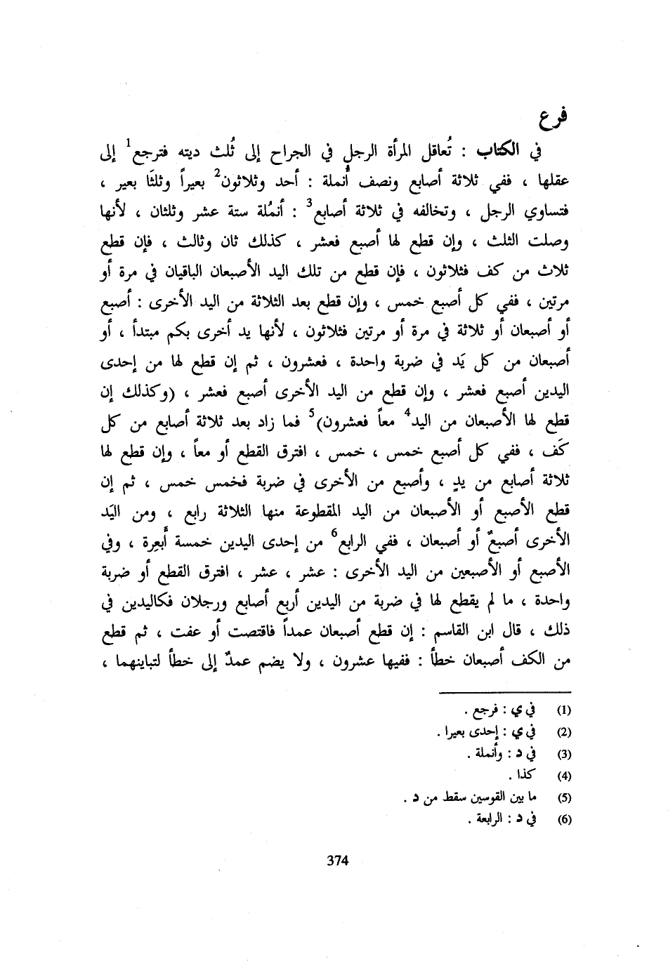 فَرْعٌ فِي الْكِتَابِ تُعَاقِلُ الْمَرْأَةُ الرَّجُلَ فِي الْجِرَاحِ إِلَى ثُلُثِ دِيَتِهِ فَتَرْجِعُ إِلَى عَقْلِهَا فَفِي ثَلَاثَة أَصَابِع وَنصف أُنْمُلَة أحد وَثَلَاثُونَ بَعِيرًا وَثُلُثَا بَعِيرٍ فَتُسَاوِي الرَّجُلَ وَتُخَالِفُهُ فِي ثَلَاثَة اصابع أُنْمُلَةٍ سِتَّةَ عَشَرَ وَثُلُثَانِ لِأَنَّهَا وَصَلَتِ الثُّلُثَ وَإِنْ قُطِعَ لَهَا أُصْبُعٌ فَعَشْرٌ كَذَلِكَ ثَانٍ وَثَالِثٌ فَإِنْ قُطِعَ ثَلَاثٌ مِنْ كَفٍّ فَثَلَاثُونَ فَإِنْ قُطِعَ مِنْ تِلْكَ الْيَدِ الْأُصْبُعَانِ الْبَاقِيَانِ فِي مَرَّةٍ أَوْ مَرَّتَيْنِ فَفِي كُلِّ أُصْبُعٍ خَمْسٌ وَإِنْ قُطِعَ بَعْدَ الثَّلَاثَةِ مِنَ الْيَدِ الْأُخْرَى أصبغ أَوْ أُصْبُعَانِ أَوْ ثَلَاثَةٌ فِي مَرَّةٍ أَوْ مرَّتَيْنِ فثلاثون لِأَنَّهَا يَد أُخْرَى بكم مُبْتَدَأٍ أَوْ أُصْبُعَانِ مِنْ كُلِّ يَدٍ فِي ضَرْبَةٍ وَاحِدَةٍ فَعِشْرُونَ ثُمَّ إِنْ قُطِعَ لَهَا مِنْ إِحْدَى الْيَدَيْنِ أُصْبُعٌ فَعَشْرٌ وَإِنْ قُطِعَ من الْيَد الْأُخْرَى فَعَشْرٌ (وَكَذَلِكَ إِنْ قُطِعَ لَهَا الْأُصْبُعَانِ مِنَ الْيَدِ مَعًا فَعِشْرُونَ) فَمَا زَادَ بَعْدَ ثَلَاثَةِ أَصَابِعَ مِنْ كُلِّ كَفٍّ فَفِي كُلِّ أُصْبُعٍ خَمْسٌ خَمْسٌ افْتَرَقَ الْقَطْعُ أَوْ مَعًا وَإِنْ قُطِعَ لَهَا ثَلَاثَةُ أَصَابِعَ مِنْ يَدٍ وَأُصْبُعٌ مِنَ الْأُخْرَى فِي ضَرْبَةٍ فَخَمْسٌ خَمْسٌ ثُمَّ إِنْ قُطِعَ الْأُصْبُعُ أَوِ الْأُصْبُعَانِ مِنَ الْيَدِ الْمَقْطُوعَةِ مِنْهَا الثَّلَاثَةُ رَابِعٌ وَمِنَ الْيَدِ الْأُخْرَى أُصْبُعٌ أَوْ أُصْبُعَانِ فَفِي الرَّابِعِ مِنْ إِحْدَى الْيَدَيْنِ خَمْسَةُ أَبْعِرَةٍ وَفِي الْأُصْبُعِ أَوِ الْأُصْبُعَيْنِ من الدي الْأُخْرَى عَشْرٌ عَشْرٌ افْتَرَقَ الْقَطْعُ أَوْ ضَرْبَةً وَاحِدَةً مَا لَمْ يُقْطَعْ لَهَا فِي ضَرْبَةٍ مِنَ الْيَدَيْنِ أَرْبَعُ أَصَابِعَ وَرِجْلَانِ فَكَالْيَدَيْنِ فِي ذَلِكَ قَالَ ابْنُ الْقَاسِمِ إِنْ قَطَعَ أُصْبُعَانِ عَمْدًا فَاقْتَصَّتْ أَوْ عَفَتْ ثُمَّ قَطَعَ مِنَ الْكَفِّ أُصْبُعَانِ خَطَأً فَفِيهَا عِشْرُونَ وَلَا يُضَمُّ عَمْدٌ إِلَى خَطَأٍ لِتَبَايُنِهِمَا