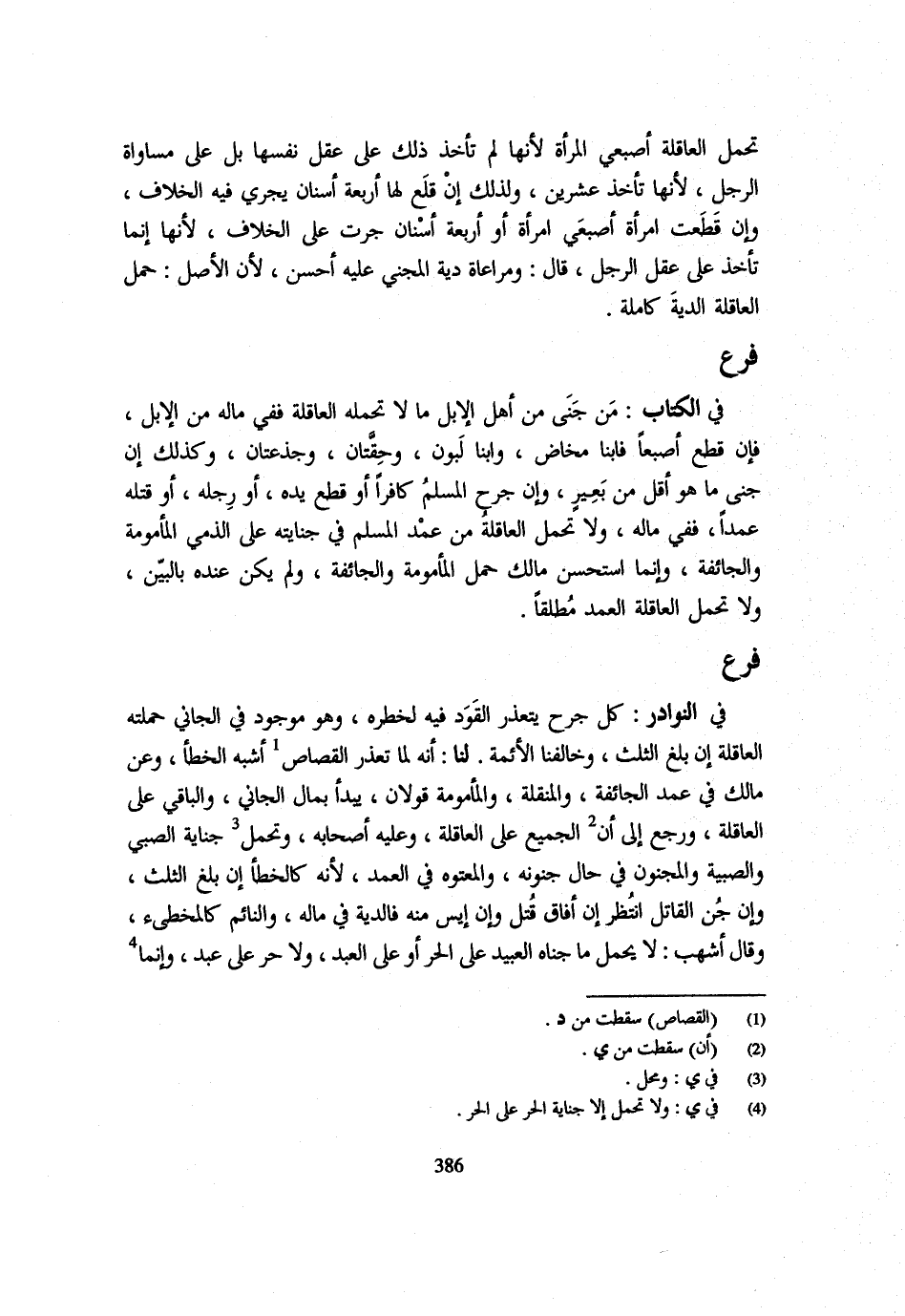 تحمل الْعَاقِلَة أُصْبُعِي الْمَرْأَة لِأَنَّهَا لمتأخذ ذَلِكَ عَلَى عَقْلِ نَفْسِهَا بَلْ عَلَى مُسَاوَاةِ الرَّجُلِ لِأَنَّهَا تَأْخُذُ عِشْرِينَ وَلِذَلِكَ إِنْ قُلِعَ لَهَا أَرْبَعَةُ أَسْنَانٍ يَجْرِي فِيهِ الْخِلَافُ وَإِنْ قَطَعَتِ امْرَأَةٌ أُصْبُعَيِ امْرَأَةٍ أَوْ أَرْبَعَةَ أَسْنَانٍ جَرَتْ عَلَى الْخِلَافِ لِأَنَّهَا إِنَّمَا تَأْخُذُ عَلَى عَقْلِ الرَّجُلِ قَالَ وَمُرَاعَاةُ دِيَةِ الْمَجْنِيِّ عَلَيْهِ أَحْسَنُ لِأَنَّ الْأَصْلَ حَمْلُ الْعَاقِلَةِ الدِّيَةَ كَامِلَةً