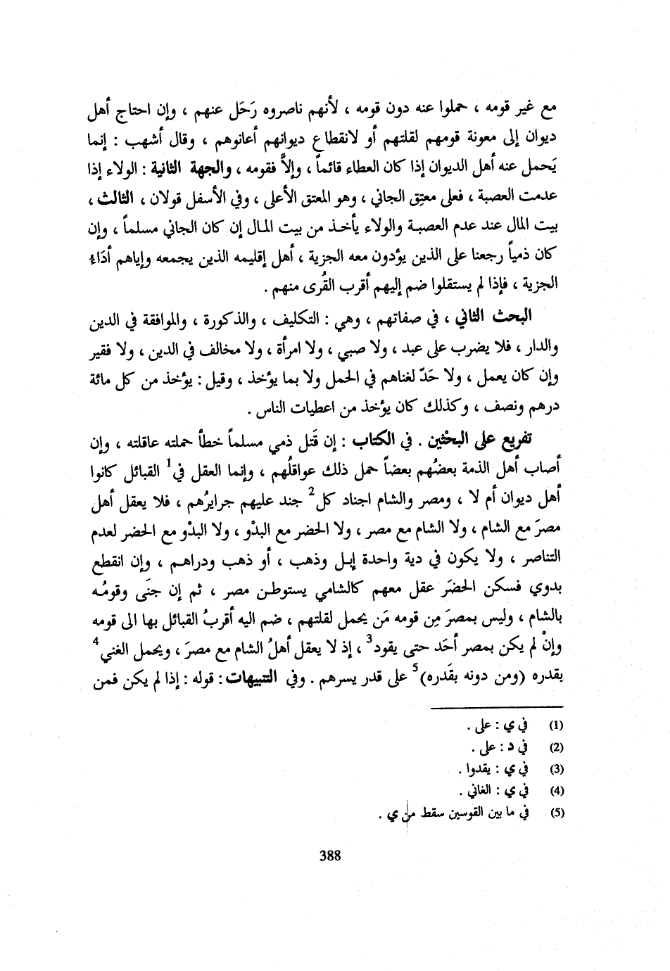 مَعَ غَيْرِ قَوْمِهِ حَمَلُوا عَنْهُ دُونَ قَوْمِهِ لأَنهم ناصروه رَحل عَنْهُمْ وَإِنِ احْتَاجَ أَهْلُ دِيوَانٍ إِلَى مَعُونَةِ قَوْمِهِمْ لِقِلَّتِهِمْ أَوْ لِانْقِطَاعِ دِيوَانِهِمْ أَعَانُوهُمْ وَقَالَ أَشْهَبُ إِنَّمَا يَحْمِلُ عَنْهُ أَهْلُ الدِّيوَانِ إِذَا كَانَ الْعَطَاءُ قَائِمًا وَإِلَّا فَقَوْمُهُ وَالْجِهَةُ الثَّانِيَةُ الْوَلَاءُ إِذَا عُدِمَتِ الْعَصَبَةُ فَعَلَى مُعْتِقِ الْجَانِي وَهُوَ الْمُعَتَقُ الْأَعْلَى وَفِي الْأَسْفَلِ قَوْلَانِ الثَّالِثُ بَيْتُ الْمَالِ عِنْدَ عَدَمِ الْعَصَبَةِ وَالْوَلَاءِ يُأْخَذُ مِنْ بَيْتِ الْمَالِ إِنْ كَانَ الْجَانِي مُسْلِمًا وَإِنْ كَانَ ذِمِّيًّا رَجَعْنَا عَلَى الَّذِينَ يُؤَدُّونَ مَعَهُ الْجِزْيَةَ أَهْلِ إِقْلِيمِهِ الَّذِينَ يَجْمَعُهُ وَإِيَّاهُمْ أَدَاءُ الْجِزْيَةِ فَإِذَا لَمْ يَسْتَقِلُّوا ضُمَّ إِلَيْهِمْ أَقْرَبُ الْقُرَى مِنْهُمْ الْبَحْثُ الثَّانِي فِي صِفَاتِهِمْ وَهِيَ التَّكْلِيفُ وَالذُّكُورَةُ وَالْمُوَافَقَةُ فِي الدَّيْنِ وَالدَّارِ فَلَا يُضْرَبُ عَلَى عَبْدٍ وَلَا صَبِيٍّ وَلَا امْرَأَةٍ وَلَا مُخَالِفٍ فِي الدَّيْنِ وَلَا فَقِيرٍ وَإِن كَانَ يعْمل وَلَا حد فغناهم فِي الْحمل وَلَا بِمَا يُؤْخَذُ وَقِيلَ يُؤْخَذُ مِنْ كُلِّ مائَة دِرْهَم وَنصف وَكَذَلِكَ كَانَ يُؤْخَذ من اعطيات النَّاس تَفْرِيغ عَلَى الْبَحْثَيْنِ فِي الْكِتَابِ إِنْ قَتَلَ ذِمِّيٌّ مُسْلِمًا خَطَأً حَمَلَتْهُ عَاقِلَتُهُ وَإِنْ أَصَابَ أَهْلَ الذِّمَّةِ بَعْضَهُمْ بَعْضًَا حَمَلَ ذَلِكَ عَوَاقِلُهُمْ وَإِنَّمَا الْعَقْلُ فِي الْقَبَائِلِ كَانُوا أَهْلَ دِيوَانٍ أَمْ لَا وَمِصْرُ وَالشَّامُ أَجْنَادُ كُلِّ جُنْدٍ عَلَيْهِمْ جَرَايِرُهُمْ فَلَا يَعْقِلُ أَهْلُ مِصْرَ مَعَ الشَّامِ وَلَا الشَّامُ مَعَ مِصْرَ وَلَا الْحَضَرُ مَعَ الْبَدْوِ وَلَا الْبَدْوُ مَعَ الْحَضَرِ لِعَدَمِ التَّنَاصُرِ وَلَا يَكُونُ فِي دِيَةٍ وَاحِدَةٍ إِبِلٌ وَذَهَبٌ أَوْ ذَهَبٌ وَدَرَاهِمُ وَإِنِ انْقَطَعَ بَدَوِيٌّ فَسَكَنَ الْحَضَرَ عَقَلَ مَعَهُمْ كَالشَّامِيِّ يَسْتَوْطِنُ مِصْرَ ثُمَّ إِنْ جَنَى وَقَوْمُهُ بِالشَّامِ وَلَيْسَ بِمِصْرَ مِنْ قَوْمِهِ مَنْ يَحْمِلُ لِقِلَّتِهِمْ ضُمَّ إِلَيْهِ أَقْرَبُ الْقَبَائِل لَهَا إِلَى قَوْمِهِ وَإِنْ لَمْ يَكُنْ بِمِصْرَ أَحَدٌ حَتَّى يَقُودَ إِذْ لَا يَعْقِلُ أَهْلُ الشَّامِ مَعَ مِصْرَ وَيَحْمِلُ الْغَنِيُّ بِقَدْرِهِ (وَمَنْ دُونَهُ بِقَدْرِهِ) عَلَى قَدْرِ يُسْرِهِمْ وَفِي التَّنْبِيهَاتِ قَوْلُهُ إِذا لم يكن فَمن