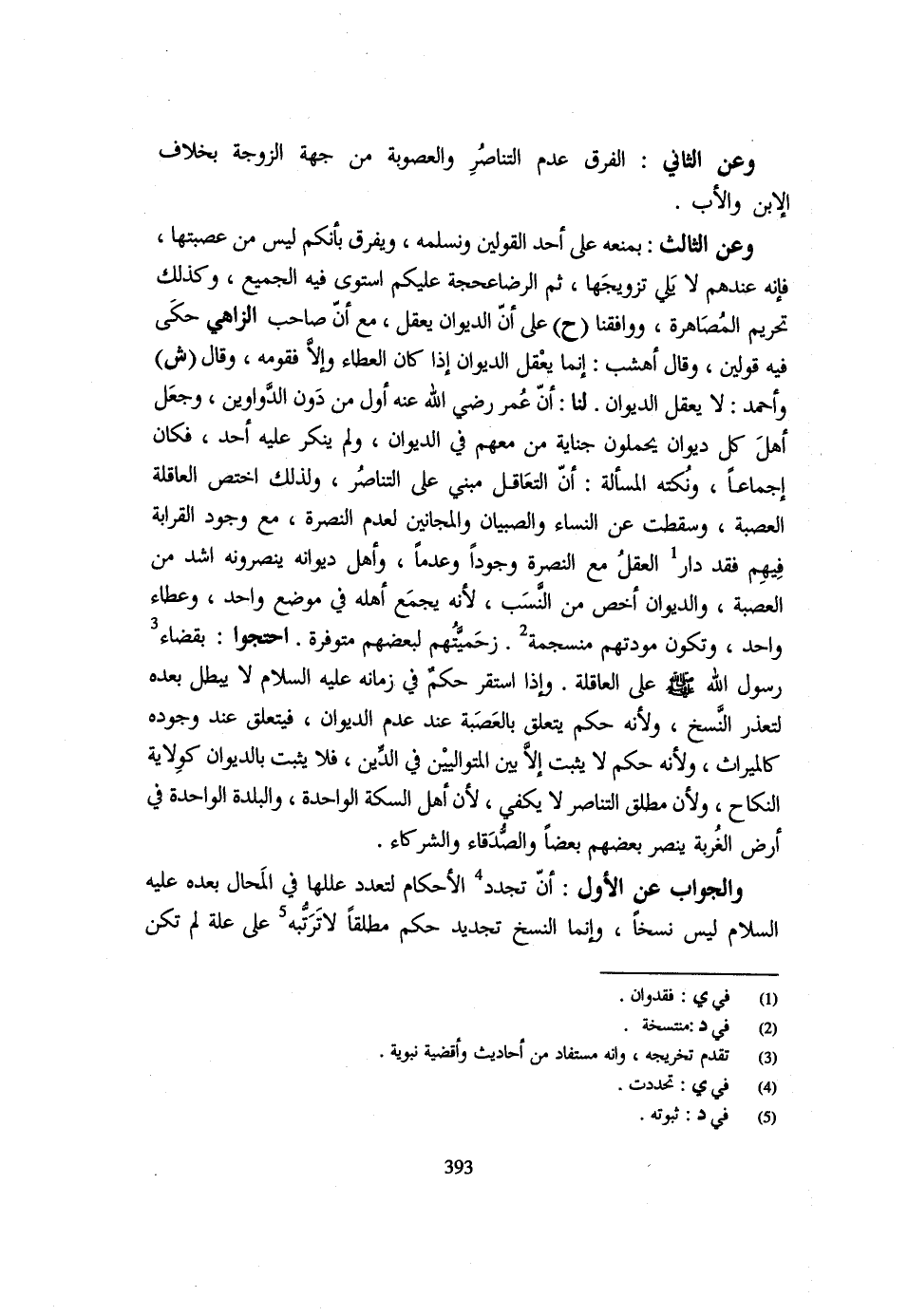 وَعَنِ الثَّانِي الْفَرْقُ عَدَمُ التَّنَاصُرِ وَالْعُصُوبَةُ مِنْ جِهَةِ الزَّوْجَةِ بِخِلَافِ الِابْنِ وَالْأَبِ وَعَنِ الثَّالِثِ بِمَنْعِهِ عَلَى أَحَدِ الْقَوْلَيْنِ وَنُسَلِّمُهُ وَيُفَرَّقُ بِأَنَّكُمْ لَيْسَ مَنْ عَصَبَتِهَا فَإِنَّهُ عِنْدَهُمْ لَا يَلِي تَزْوِيجَهَا ثُمَّ الرَّضَاعُ حُجَّةٌ عَلَيْكُمُ اسْتَوَى فِيهِ الْجَمِيعُ وَكَذَلِكَ تَحْرِيمُ الْمُصَاهَرَةِ وَوَافَقَنَا (ح) عَلَى أَنَّ الدِّيوَانَ يَعْقِلُ مَعَ أَنَّ صَاحِبَ الزَّاهِي حَكَى فِيهِ قَوْلَيْنِ وَقَالَ أَشْهَبُ إِنَّمَا يَعْقِلُ الدِّيوَانُ إِذَا كَانَ الْعَطَاءُ وَإِلَّا فَقَوْمُهُ وَقَالَ (ش) وَأَحْمَدُ لَا يَعْقِلُ الدِّيوَانُ لَنَا أَنَّ عُمَرَ رَضِيَ اللَّهُ عَنْهُ أَوَّلُ مَنْ دَوَّنَ الدَّوَاوِينَ وَجَعَلَ أَهْلَ كُلِّ دِيوَانٍ يَحْمِلُونَ جِنَايَةَ مَنْ مَعَهُمْ فِي الدِّيوَانِ وَلَمْ يُنْكِرْ عَلَيْهِ أَحَدٌ فَكَانَ إِجْمَاعًا وَنُكْتَةُ الْمَسْأَلَةِ أَنَّ التَّعَاقُلَ مَبْنِيٌّ عَلَى التَّنَاصُرِ وَلِذَلِكَ اخْتَصَّ الْعَاقِلَةَ الْعَصَبَةَ وَسَقَطت عَن النِّسَاء وَالصبيان والمجانين بِعَدَمِ النُّصْرَةِ مَعَ وُجُودِ الْقَرَابَةِ فِيهِمْ فَقَدْ دَارَ الْعَقْلُ مَعَ النُّصْرَةِ وُجُودًا وَعَدَمًا وَأَهْلُ دِيوَانِهِ يَنْصُرُونَهُ أَشَدَّ مِنَ الْعَصَبَةِ وَالدِّيوَانُ أَخَصُّ مِنَ النَّسَبِ لِأَنَّهُ يَجْمَعُ أَهْلَهُ فِي مَوْضِعٍ وَاحِدٍ وَعَطَاء وَاحِد وَتَكون مَوَدَّتهمْ منسجمة زحميتهم لِبَعْضِهِمْ مُتَوَفِّرَةً احْتَجُّوا بِقَضَاءِ رَسُولِ اللَّهِ - صَلَّى اللَّهُ عَلَيْهِ وَسَلَّم َ - عَلَى الْعَاقِلَةِ وَإِذَا اسْتَقَرَّ حُكْمٌ فِي زَمَانِهِ عَلَيْهِ السَّلَامُ لَا يَبْطُلُ بَعْدَهُ لِتَعَذُّرِ النَّسْخِ وَلِأَنَّهُ حُكْمٌ يَتَعَلَّقُ بِالْعَصَبَةِ عِنْدَ عَدَمِ الدِّيوَانِ فَيَتَعَلَّقُ عِنْدَ وُجُودِهِ كَالْمِيرَاثِ وَلِأَنَّهُ حُكْمٌ لَا يَثْبُتُ إِلَّا بَيْنَ الْمُتَوَالِيَيْنِ فِي الدِّينِ فَلَا يَثْبُتُ بِالدِّيوَانِ كَوِلَايَةِ النِّكَاحِ وَلِأَنَّ مُطْلَقَ التَّنَاصُرِ لَا يَكْفِي لِأَنَّ أَهْلَ السِّكَّةِ الْوَاحِدَةِ وَالْبَلْدَةِ الْوَاحِدَةِ فِي أَرْضِ الْغُرْبَةِ يَنْصُرُ بَعْضُهُمْ بَعْضًا وَالصُّدَقَاءُ وَالشُّرَكَاءُ وَالْجَوَابُ عَنِ الْأَوَّلِ أَنَّ تَجَدُّدَ الْأَحْكَامِ لِتَعَدُّدِ عِلَلِهَا فِي الْمَحَالِّ بَعْدَهُ عَلَيْهِ السَّلَامُ لَيْسَ نَسْخًا وَإِنَّمَا النَّسْخُ تَجْدِيدُ حُكْمٍ مُطلقًا لاترتبه عَلَى عِلَّةٍ لَمْ تَكُنْ