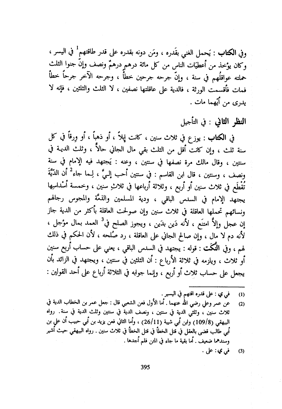 النَّظَرُ الثَّانِي فِي التَّأْجِيلِ فِي الْكِتَابِ يُوَزَّعُ فِي ثَلَاثِ سِنِينَ كَانَتْ إِبِلًا أَوْ ذَهَبًا أَوْ وَرِقًا فِي كُلِّ سَنَةٍ ثُلُثٌ وَإِنْ كَانَتْ أَقَلَّ مِنَ الثُّلُثِ بَقِيَ مَالُ الْجَانِي حَالًّا وَثُلُثُ الدِّيَةِ فِي سَنَتَيْنِ وَقَالَ مَالِكٌ مَرَّةً نِصْفُهَا فِي سَنَتَيْنِ وَعَنْهُ يَجْتَهِدُ فِيهِ الْإِمَامُ فِي سَنَةٍ وَنِصْفٍ وسنتين قَالَ ابْنُ الْقَاسِمِ فِي سَنَتَيْنِ أَحَبُّ إِلَيَّ لِمَا جَاءَ أَنَّ الدِّيَةَ تُقْطَعُ فِي ثَلَاثِ سِنِينَ أَوْ أَرْبَعٍ وَثَلَاثَةُ أَرْبَاعِهَا فِي ثَلَاثِ سِنِينَ وَخَمْسَةُ أَسْدَاسِهَا يَجْتَهِدُ الْإِمَامُ فِي السُّدُسِ الْبَاقِي وَدِيَةُ الْمُسْلِمِينَ وَالذِّمَّةِ وَالْمَجُوسِ رِجَالِهِمْ وَنِسَائِهِمْ تَحْمِلُهَا الْعَاقِلَةُ فِي ثَلَاثِ سِنِينَ وَإِنْ صُولِحَتِ الْعَاقِلَةُ بِأَكْثَرَ مِنَ الدِّيَةِ جَازَ إِنْ عُجِّلَ وَإِلَّا امْتُنِعَ لِأَنَّهُ دَيْنٌ بِدَيْنٍ وَيَجُوزُ الصُّلْحُ فِي الْعَمْدِ بِمَالٍ مُؤَجَّلٍ لِأَنَّهُ دَمٌ لَا مَال لَهُ وَإِنْ صَالَحَ الْجَانِي عَلَى الْعَاقِلَةِ رَدَّ صُلْحَهُ لِأَنَّ الْحُكْمَ فِي ذَلِكَ لَهُمْ وَفِي النُّكَتِ قَوْلُهُ يَجْتَهِدُ فِي السُّدُسِ الْبَاقِي يَعْنِي عَلَى حِسَاب أَربع سِنِين فو ثَلَاثٍ وَيَلْزَمُهُ فِي ثَلَاثَةِ الْأَرْبَاعِ أَنَّ الثُّلُثَيْنِ فِي سَنَتَيْنِ وَيَجْتَهِدُ فِي الزَّائِدِ بِأَنْ يَجْعَلَ عَلَى حِسَابِ ثَلَاثٍ أَوْ أَرْبَعٍ وَإِنَّمَا جَوَابُهُ فِي الثَّلَاثَةِ أَرْبَاعٍ عَلَى أَحَدِ الْقَوْلَيْنِ