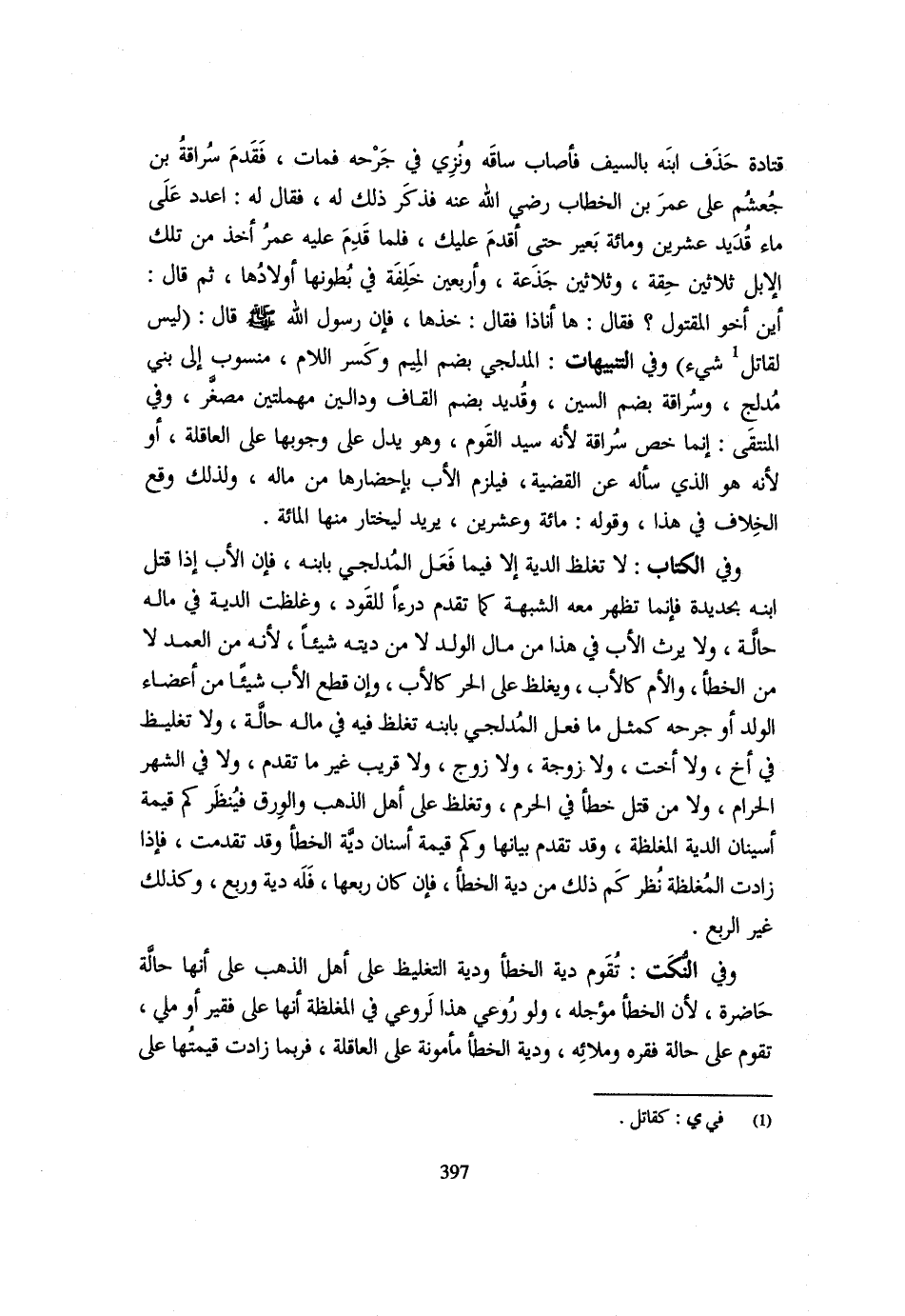 قَتَادَةُ حَذَفَ ابْنَهُ بِالسَّيْفِ فَأَصَابَ سَاقَهُ وَنُزِيَ فِي جُرْحِهِ فَمَاتَ فَقَدِمَ سُرَاقَةُ بْنُ جُعْشَمٍ عَلَى عُمَرَ بْنِ الْخَطَّابِ رَضِيَ اللَّهُ عَنْهُ فَذَكَرَ ذَلِكَ لَهُ فَقَالَ لَهُ اعْدُدْ عَلَى مَاءِ قُدَيْدٍ عِشْرِينَ وَمِائَةَ بَعِيرٍ حَتَّى أَقْدَمَ عَلَيْكَ فَلَمَّا قَدِمَ عَلَيْهِ عُمَرُ أَخَذَ مِنْ تِلْكَ الْإِبِل ثَلَاثِينَ حقة وثلثين جَذَعَةً وَأَرْبَعِينَ خَلِفَةً فِي بُطُونِهَا أَوْلَادُهَا ثُمَّ قَالَ أَيْن أَخُو الْمَقْتُول فَقَالَ هَا أناذا فَقَالَ خُذْهَا فَإِنَّ رَسُولَ اللَّهِ - صَلَّى اللَّهُ عَلَيْهِ وَسَلَّم َ - قَالَ (لَيْسَ لِقَاتِلٍ شَيْءٌ) وَفِي التَّنْبِيهَاتِ الْمُدْلِجِيُّ بِضَمِّ الْمِيمِ وَكَسْرِ اللَّامِ مَنْسُوبٌ إِلَى بَنِي مُدْلِجٍ وَسُرَاقَةُ بِضَمِّ السِّينِ وَقُدَيْدٍ بِضَمِّ الْقَافِ وَدَالَيْنِ مُهْمَلَتَيْنِ مُصَغَّرٌ وَفِي الْمُنْتَقَى إِنَّمَا خُصَّ سُرَاقَةُ لِأَنَّهُ سَيِّدُ الْقَوْمِ وَهُوَ يَدُلُّ عَلَى وُجُوبِهَا عَلَى الْعَاقِلَةِ أَوْ لِأَنَّهُ هُوَ الَّذِي سَأَلَهُ عَنِ الْقَضِيَّةِ فَيُلْزِمُ الْأَبَ بِإِحْضَارِهَا مِنْ مَالِهِ وَلِذَلِكَ وَقَعَ الْخِلَافُ فِي هَذَا وَقَوْلُهُ مِائَةً وَعِشْرِينَ يُرِيدُ لِيَخْتَارَ مِنْهَا الْمِائَةَ وَفِي الْكِتَابِ لَا تُغَلَّظُ الدِّيَةُ إِلَّا فِيمَا فَعَلَ الْمُدْلِجِيُّ بِابْنِهِ فَإِنَّ الْأَبَ إِذَا قَتَلَ ابْنَهُ بِحَدِيدَةٍ فَإِنَّمَا تَظْهَرُ مَعَهُ الشُّبْهَةُ كَمَا تَقَدَّمَ دَرْءًا لِلْقَوَدِ وَغُلِّظَتِ الدِّيَةُ فِي مَالِهِ حَالَّةً وَلَا يَرِثُ الْأَبُ فِي هَذَا مِنْ مَالِ الْوَلَد لَا مِنْ دِيَتِهِ شَيْئًا لِأَنَّهُ مِنَ الْعَمْدِ لَا مِنَ الْخَطَأِ وَالْأُمُّ كَالْأَبِ وَيُغَلَّظُ عَلَى الْحُرِّ كَالْأَبِ وَإِنْ قَطَعَ الْأَبُ شَيْئًا مِنْ أَعْضَاءِ الْوَلَدِ أَوْ جُرْحِهِ كَمِثْلِ مَا فَعَلَ الْمُدْلِجِيُّ بِابْنِهِ تُغَلَّظُ فِيهِ فِي مَالِهِ حَالَّةً وَلَا تَغْلِيظَ فِي أَخٍ وَلَا أُخْتٍ وَلَا زَوْجَةٍ وَلَا زَوْجٍ وَلَا قَرِيبٍ غَيْرِ مَا تَقَدَّمَ وَلَا فِي الشَّهْرِ الْحَرَامِ وَلَا مَنْ قُتِلَ خَطَأً فِي الْحَرَمِ وَتُغَلَّظُ عَلَى أَهْلِ الذَّهَبِ وَالْوَرِقِ فَيَنْظُرُ كَمْ قِيمَةُ أَسْنَانِ الدِّيَةِ الْمُغَلَّظَةِ وَقَدْ تَقَدَّمَ بَيَانُهَا وَكَمْ قِيمَةُ أَسْنَانِ دِيَةِ الْخَطَأِ وَقَدْ تَقَدَّمَتْ فَإِذَا زَادَتِ الْمُغَلَّظَةُ نُظِرَ كَمْ ذَلِكَ مِنْ دِيَةِ الْخَطَأِ فَإِنْ كَانَ رُبُعَهَا فَلَهُ دِيَةٌ وَرُبُعٌ وَكَذَلِكَ غَيْرُ الرُّبُعِ وَفِي النُّكَتِ تَقُومُ دِيَةُ الْخَطَأِ وَدِيَةُ التَّغْلِيظِ عَلَى أَهْلِ الذَّهَبِ عَلَى أَنَّهَا حَالَّةٌ حَاضِرَةٌ لِأَنَّ الْخَطَأَ مُؤَجَّلَةٌ وَلَوْ رُوعِيَ هَذَا لَرُوعِيَ فِي الْمُغَلَّظَةِ أَنَّهَا عَلَى فَقِيرٍ أَوْ مَلِيٍّ تَقُومُ عَلَى حَالَةِ فَقْرِهِ وَمِلَائِهِ وَدِيَةُ الْخَطَأِ مَأْمُونَةٌ عَلَى الْعَاقِلَةِ فَرُبَّمَا زَادَتْ قِيمَتُهَا عَلَى