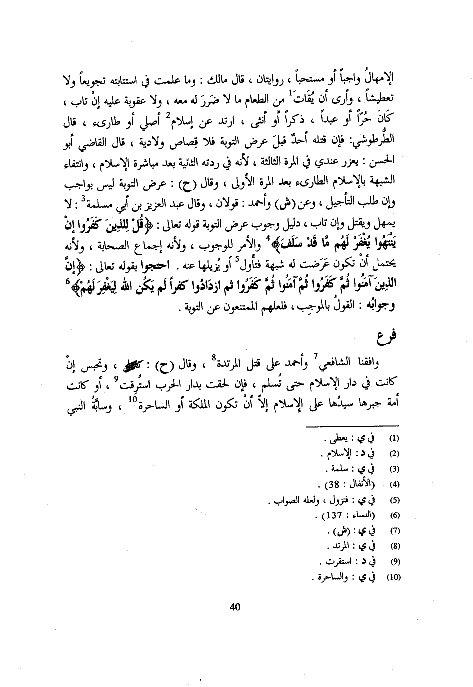 الْإِمْهَالُ وَاجِبًا أَوْ مُسْتَحَبًّا رِوَايَتَانِ قَالَ مَالِكٌ وَمَا عَلِمْتُ فِي اسْتِتَابَتِهِ تَجْوِيعًا وَلَا تَعْطِيشًا وَأَرَى أَنْ يُقَاتَ مِنَ الطَّعَامِ مَا لَا ضَرَرَ لَهُ مَعَهُ وَلَا عُقُوبَةَ عَلَيْهِ إِنْ تَابَ كَانَ حُرًّا أَوْ عَبْدًا ذَكَرًا أَوْ أنثر ارْتَدَّ عَنْ إِسْلَامٍ أَصْلِيٍّ أَوْ طَارِئٍ قَالَ الطَّرْطُوشِيُّ فَإِنْ قَتْلَهُ أَحَدٌ قَبْلَ عَرْضِ التَّوْبَةِ فَلَا قَصَاصَ وَلَا دِيَةَ قَالَ الْقَاضِي أَبُو الْحسن يُعَزّر عِنْدِي فِي الْمَرَّةِ الثَّالِثَةِ لِأَنَّهُ فِي رِدَّتِهِ الثَّانِيَةِ بَعْدَ مُبَاشَرَةِ الْإِسْلَامِ وَانْتِفَاءِ الشُّبْهَةِ بِالْإِسْلَامِ الطَّارِئِ بَعْدَ الْمَرَّةِ الْأُولَى وَقَالَ (ح) عَرْضُ التَّوْبَةِ لَيْسَ بِوَاجِبٍ وَإِنْ طَلَبَ التَّأْجِيلَ وَعَنْ ش وَأَحْمَدَ قَوْلَانِ وَقَالَ عَبْدُ الْعَزِيزِ بْنُ أَبِي مَسْلَمَةَ لَا يُمْهَلُ وَيُقْتَلُ وَإِنْ تَابَ دَلِيلُ وُجُوبِ عَرْضِ التَّوْبَةِ قَوْله تَعَالَى {قُلْ لِلَّذِينَ كَفَرُوا إِنْ يَنْتَهُوا يُغْفَرْ لَهُمْ مَا قد سلف} وَالْأَمْرُ لِلْوُجُوبِ وَلِأَنَّهُ إِجْمَاعُ الصَّحَابَةِ وَلِأَنَّهُ يُحْتَمَلُ أَنْ تَكُونَ عَرَضَتْ لَهُ شُبْهَةٌ فَتَأَوَّلَ أَوْ يُزِيلُهَا عَنْهُ احْتَجُّوا بِقَوْلِهِ تَعَالَى {إِنَّ الَّذِينَ آمَنُوا ثُمَّ كَفَرُوا ثُمَّ آمَنُوا ثُمَّ كَفَرُوا ثُمَّ ازْدَادُوا كُفْرًا لَمْ يَكُنِ اللَّهُ لِيَغْفِرَ لَهُم} وَجَوَابُهُ الْقَوْلُ بِالْمُوجِبِ فَلَعَلَّهُمُ الْمُمْتَنِعُونَ عَنِ التَّوْبَةِ