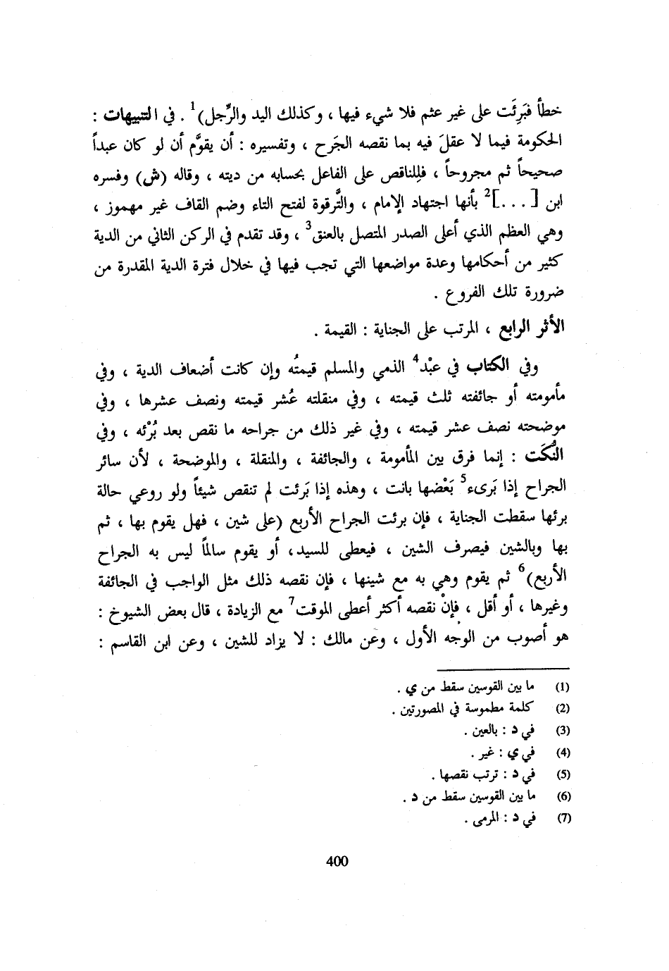 الْأَثَرُ الرَّابِعُ الْمُرَتّب على الْجِنَايَة الْقيمَة وَفِي الْكِتَابِ فِي عَبْدِ الذِّمِّيِّ وَالْمُسْلِمِ قِيمَتُهُ وَإِنْ كَانَتْ أَضْعَافَ الدِّيَةِ وَفِي مَأْمُومَتِهِ أَوْ جَائِفَتِهِ ثُلُثُ قِيمَتِهِ وَفِي مُنَقِّلَتِهِ عُشْرُ قِيمَتِهِ وَنِصْفُ عُشْرِهَا وَفِي مُوَضِّحَتِهِ نِصْفُ عُشْرِ قِيمَتِهِ وَفِي غَيْرِ ذَلِكَ مِنْ جِرَاحِهِ مَا نَقَصَ بَعْدَ بُرْئِهِ وَفِي النُّكَتِ إِنَّمَا فُرِّقَ بَيْنَ الْمَأْمُومَةِ وَالْجَائِفَةِ وَالْمُنَقِّلَةِ وَالْمُوَضِّحَةِ لِأَنَّ سَائِرَ الْجِرَاحِ إِذا برىء بَعْضُهَا بَانَتْ وَهَذِهِ إِذَا بَرِئَتْ لَمْ تَنْقُصْ شَيْئًا وَلَوْ رُوعِيَ حَالَةَ بُرْئِهَا سَقَطَتِ الْجِنَايَةُ فَإِنْ بَرِئَتِ الْجِرَاحُ الْأَرْبَعُ (عَلَى شَيْنٍ فَهَلْ يُقَوَّمُ بِهَا ثُمَّ بِهَا وَبِالشَّيْنِ فَيُصْرَفُ الشَّيْنُ فَيُعْطَى لِلسَّيِّدِ أَوْ يُقَوَّمُ سَالِمًا لَيْسَ بِهِ الْجِرَاحُ الْأَرْبَعُ) ثُمَّ يُقَوَّمُ وَهِيَ بِهِ مَعَ شَيْنِهَا فَإِنْ نَقَصَهُ ذَلِكَ مِثْلَ الْوَاجِبِ فِي الْجَائِفَةِ وَغَيْرِهَا أَوْ أَقَلَّ فَإِنْ نَقَصَهُ أَكْثَرَ أُعْطِيَ الْمُوَقَّتَ مَعَ الزِّيَادَةِ قَالَ بَعْضُ الشُّيُوخِ هُوَ أَصْوَبُ مِنَ الْوَجْهِ الْأَوَّلِ وَعَنْ مَالِكٍ لَا يُزَادُ لِلشَيْنِ وَعَنِ ابْنِ الْقَاسِمِ