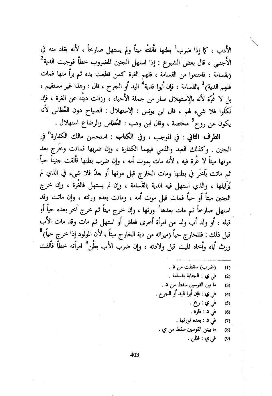 الْأَدَبُ كَمَا إِذَا ضَرَبَ بَطْنَهَا فَأَلْقَتْهُ مَيْتًا وَلَمْ يَسْتَهِلَّ صَارِخًا لِأَنَّهُ يُقَادُ مِنْهُ فِي الْأَجْنَبِيِّ قَالَ بَعْضُ الشُّيُوخِ إِذَا اسْتَهَلَّ الْجَنِينُ الْمَضْرُوبُ خَطَأً فَوَجَبَتِ الدِّيَةُ (بِقَسَامَةٍ فَامْتَنَعُوا مِنَ الْقَسَامَةِ فَلَهُمُ الْغُرَّةُ كَمَنْ قُطِعَتْ يَدُهُ ثُمَّ بَرَأَ مِنْهَا فَمَاتَ فَلَهُمُ الدِّيَةُ) بِالْقَسَامَةِ فَإِنْ أَبَوْا فَدِيَةُ الْيَدِ أَوِ الْجُرْحِ قَالَ وَهَذَا غَيْرُ مُسْتَقِيمٍ بَلْ لَا غُرَّةَ لِأَنَّهُ بِالِاسْتِهْلَالِ صَار من جملَة الْحيَاء وَزَالَتْ دِيَتُهُ عَنِ الْغُرَّةِ فَإِنْ نَكَلُوا فَلَا شَيْءَ لَهُمْ قَالَ ابْنُ يُونُسَ الِاسْتِهْلَالُ الصِّيَاحُ دُونَ الْعُطَاسِ لِأَنَّهُ يَكُونُ عَنْ رُوحٍ مُخْتَصَّةٍ وَقَالَ ابْنُ وَهْبٍ الْعُطَاسُ وَالرَّضَاعُ اسْتِهْلَالٌ الطَّرَفُ الثَّانِي فِي الْمُوجَبِ وَفِي الْكِتَابِ اسْتَحْسَنَ مَالِكٌ الْكَفَّارَةَ فِي الْجَنِينِ وَكَذَلِكَ الْعَبْدُ وَالذِّمِّيُّ فِيهِمَا الْكَفَّارَةُ وَإِنْ ضَرَبَهَا فَمَاتَتْ وَخَرَجَ بَعْدَ مَوْتِهَا مَيْتًا لَا غُرَّةَ فِيهِ لِأَنَّهُ مَاتَ بِمَوْتِ أُمِّهِ وَإِنْ ضَرَبَ بَطْنَهَا فَأَلْقَتْ جَنِينًا حَيًّا ثُمَّ مَاتَتْ بِآخَرَ فِي بَطْنِهَا وَمَاتَ الْخَارِجُ قَبْلَ مَوْتِهَا أَوْ بَعْدَ فَلَا شَيْءَ فِي الَّذِي لَمْ يُزَايِلْهَا وَالَّذِي اسْتَهَلَّ فِيهِ الدِّيَةُ بِالْقَسَامَةِ وَإِنْ لَمْ يَسْتَهِلَّ فَالْغُرَّةُ وَإِنْ خَرَجَ الْجَنِينُ مَيْتًا أَوْ حَيًّا فَمَاتَ قَبْلَ مَوْتِ أُمِّهِ وَمَاتَتْ بَعْدَهُ وَرِثَتْهُ وَإِنْ مَاتَتْ وَقَدِ اسْتَهَلَّ صَارِخًا ثُمَّ مَاتَ بَعْدَهَا وَرِثَهَا وَإِنْ خَرَجَ مَيْتًا ثُمَّ خَرَجَ آخَرُ بَعْدَهِ حَيًّا أَوْ قَبْلَهُ أَوْ وَلَدُ أَبٍ وُلِدَ مِنَ امْرَأَةٍ أُخْرَى فَعَاشَ أَوِ اسْتَهَلَّ ثُمَّ مَاتَ وَقَدْ مَاتَ الْأَبُ قَبْلَ ذَلِكَ فَلِلْخَارِجِ حَيًّا (مِيرَاثُهُ مِنْ دِيَةِ الْخَارِجِ مَيْتًا لِأَنَّ الْمَوْلُودَ إِذَا خَرَجَ حَيًّا) وَرِثَ أَبَاهُ وَأَخَاهُ الْمَيِّتَ قَبْلَ وِلَادَتِهِ وَإِنْ ضَرَبَ الْأَبُ بَطْنَ امْرَأَتِهِ خطأ فَأَلْقَت