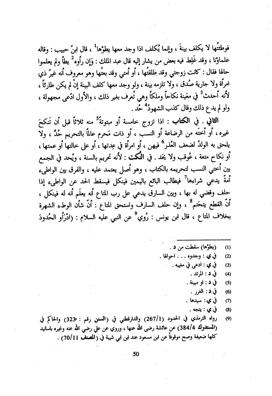 فَوَطِئْتُهَا لَا يُكَلَّفُ بَيِّنَةً وَإِنَّمَا يُكَلَّفُ إِذَا وُجِدَ مَعَهَا يَطَؤُهَا قَالَ ابْنُ حَبِيبٍ وَقَالَهُ عُلَمَاؤُنَا وَقَدْ غَلِطَ فِيهِ بَعْضُ مَنْ يُشَارُ إِلَيْهِ قَالَ عَبْدُ الْمَلِكِ وَإِنْ رَأَوْهُ يَطَأُ وَلَمْ يَعْلَمُوا حَالَهَا فَقَالَ كَانَتْ زَوْجَتِي وَقَدْ طَلَّقْتُهَا أَوْ أَمَتِي وَقَدْ بِعْتُهَا وَهُوَ مَعْرُوفٌ أَنَّهُ غَيْرُ ذِي امْرَأَةٍ وَلَا جَارِيَةٍ صُدِّقَ وَلَا تَلْزَمُهُ بَيِّنَةٌ وَلَوْ وُجِدَ مَعَهَا كُلِّفَ الْبَيِّنَةَ إِنْ لَمْ يَكُنْ طَارِئًا لِأَنَّهُ أَحْدَثَ فِي معنية نِكَاحا وملكا وَهِيَ تُعْرَفُ بِغَيْرِ ذَلِكَ وَالْأَوَّلُ ادَّعَى مَجْهُولَةً وَلَوْ لَمْ يَدَّعِ ذَلِكَ وَقَالَ كَذِبَ الشُّهُودُ حُدَّ الثَّانِي فِي الْكِتَابِ إِذَا تَزَوَّجَ خَامِسَةً أَوْ مَبْتُوتَةً مِنْهُ ثَلَاثًا قَبْلَ أَنْ تَنْكِحَ غَيْرَهُ أَوْ أُخْتَهُ مِنَ الرَّضَاعَةِ أَوِ النَّسَبِ أَوْ ذَاتَ مَحْرَمٍ عَالِمًا بِالتَّحْرِيمِ حُدَّ وَلَا يلْحق بِهِ الْوَلَد لضعف الْعذر فِيهِنَّ أَوِ امْرَأَةً فِي عِدَّتِهَا أَوْ عَلَى خَالَتِهَا أَوْ عَمَّتِهَا أَوْ نِكَاحَ مُتْعَةٍ عُوقِبَ وَلَا حد فِي النُّكَتِ لِأَنَّهُ تَحْرِيمٌ بِالسُّنَّةِ وَيُحَدُّ فِي الْجَمْعِ بَيْنَ أُخْتَيِ النَّسَبِ لِتَحْرِيمِهِ بِالْكِتَابِ وَهُوَ أَصْلٌ يُعْتَمَدُ عَلَيْهِ وَالْفَرْقُ بَيْنَ الْوَاطِئِ أَمَةً يَدعِي شراءها فَيُطَالب البَائِع بِالْيَمِينِ فينكل فيقسط الْحَدُّ عَنِ الْوَاطِئِ إِذَا حَلَفَ وَقُضِيَ لَهُ بِهَا وَبَيْنَ السَّارِقِ يَدَّعِي عَلَى رَبِّ الْمَتَاعِ أَنَّهُ يَعْلَمُ أَنَّهُ لَهُ فَيَنْكَلُ أَنَّ الْقَطْعَ يتحتم وَإِن حلف السارف وَاسْتَحَقَّ الْمَتَاعَ أَنَّ شَأْنَ الْوَطْءِ الشُّهْرَةُ بِخِلَافِ الْمَتَاعِ قَالَ ابْنُ يُونُسَ رُوِيَ عَنِ النَّبِيِّ عَلَيْهِ السَّلَام (ادرأو الْحُدُود