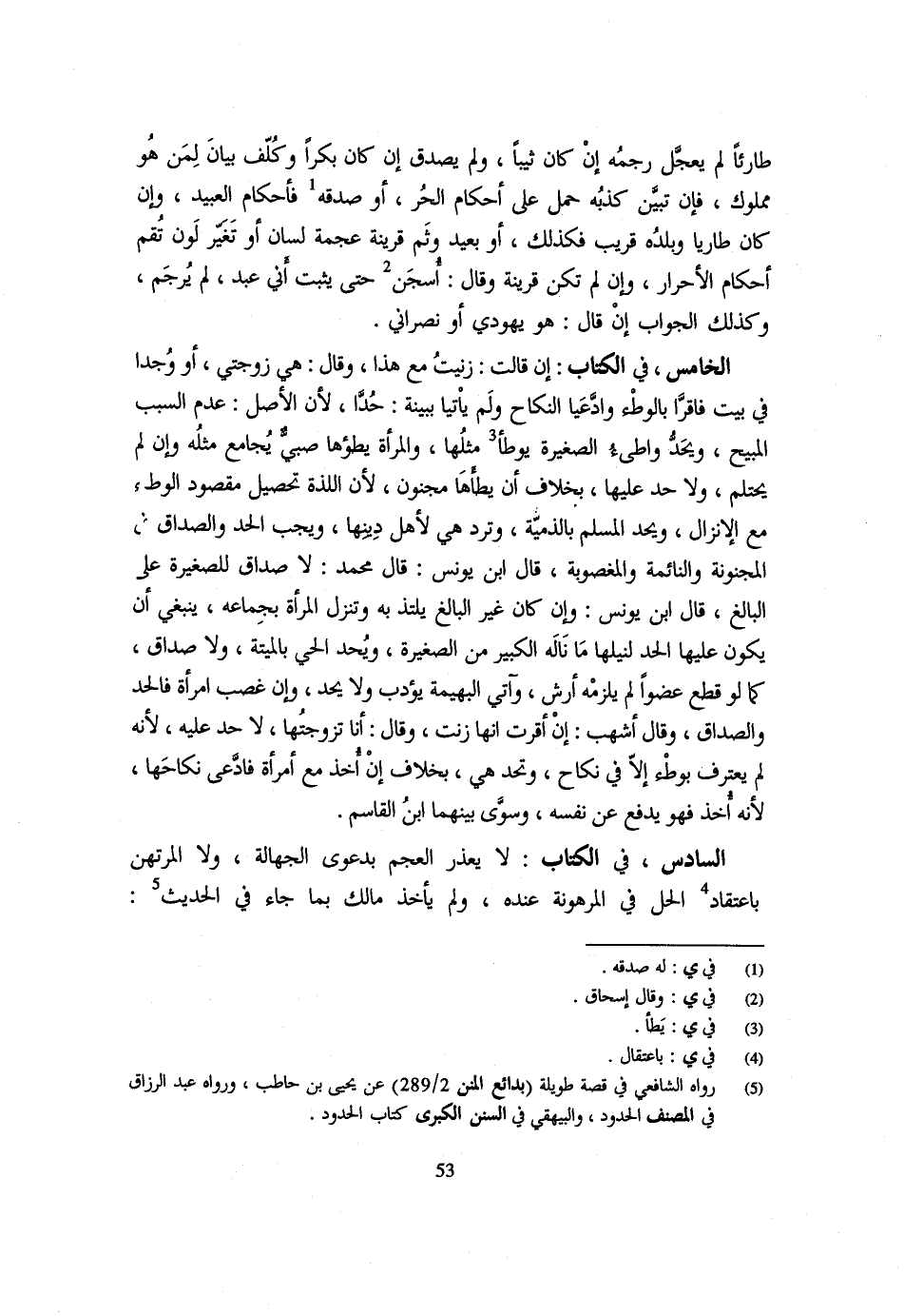 طَارِئًا لَمْ يُعَجَّلْ رَجْمُهُ إِنْ كَانَ ثَيِّبًا وَلَمْ يُصَدَّقْ إِنْ كَانَ بِكْرًا وَكُلِّفَ بَيَانَ لِمَنْ هُوَ مَمْلُوكٌ فَإِنْ تَبَيَّنَ كَذِبُهُ حُمِلَ عَلَى أَحْكَامِ الْحُرِّ أَوْ صِدْقُهُ فَأَحْكَامُ الْعَبِيدِ وَإِن كَانَ طاريا وَبَلَدُهُ قَرِيبٌ فَكَذَلِكَ أَوْ بَعِيدٌ وَثَمَّ قَرِينَةُ عجمة لِسَان أَو تغير لون تُقَمْ أَحْكَامُ الْأَحْرَارِ وَإِنْ لَمْ تَكُنْ قَرِينَةً وَقَالَ أسجن حَتَّى يثبت أَنِّي عَبْدٌ لَمْ يُرْجَمْ وَكَذَلِكَ الْجَوَابُ إِنْ قَالَ هُوَ يَهُودِيٌّ أَوْ نَصْرَانِيٌّ الْخَامِسُ فِي الْكِتَابِ إِنْ قَالَتْ زَنَيْتُ مَعَ هَذَا وَقَالَ هِيَ زَوْجَتِي أَوْ وُجِدَا فِي بَيْتٍ فَأَقَرَّا بِالْوَطْءِ وَادَّعَيَا النِّكَاحَ وَلِمَ يَأْتِيَا بِبَيِّنَةٍ حُدَّا لِأَنَّ الْأَصْلَ عَدَمُ السَّبَبِ الْمُبِيحِ وَيُحَدُّ وَاطِئُ الصَّغِيرَةِ يُوطَأُ مِثْلُهَا وَالْمَرْأَةُ يَطَؤُهَا صَبِيٌّ يُجَامِعُ مِثْلُهُ وَإِنْ لَمْ يَحْتَلِمْ وَلَا حَدَّ عَلَيْهَا بِخِلَافِ أَنْ يَطَأَهَا مَجْنُونٌ لِأَنَّ اللَّذَّةَ تَحْصِيلُ مَقْصُودِ الْوَطْءِ مَعَ الْإِنْزَالِ وَيُحَدُّ الْمُسْلِمُ بِالذِّمِّيَّةِ وَتُرَدُّ هِيَ لِأَهْلِ دِينِهَا وَيَجِبُ الْحَدُّ وَالصَّدَاقُ فِي الْمَجْنُونَةِ وَالنَّائِمَةِ وَالْمَغْصُوبَةِ قَالَ ابْنُ يُونُسَ قَالَ مُحَمَّدٌ لَا صَدَاقَ لِلصَّغِيرَةِ عَلَى الْبَالِغِ قَالَ ابْنُ يُونُسَ وَإِنْ كَانَ غَيْرُ الْبَالِغِ يُلْتَذُّ بِهِ وَتُنْزِلُ الْمَرْأَةُ بِجِمَاعِهِ يَنْبَغِي أَنْ يَكُونَ عَلَيْهَا الْحَد لنيلها مَا نَالَهُ الْكَبِيرُ مِنَ الصَّغِيرَةِ وَيُحَدُّ الْحَيُّ بِالْمَيِّتَةِ وَلَا صَدَاقَ كَمَا لَوْ قَطَعَ عُضْوًا لَمْ يَلْزَمْهُ أَرْشٌ وَآتِي الْبَهِيمَةَ يُؤَدَّبُ وَلَا يُحَدُّ وَإِنْ غَصَبَ امْرَأَةً فَالْحَدُّ وَالصَّدَاقُ وَقَالَ أَشْهَبُ إِنْ أَقَرَّتْ أَنَّهَا زَنَتْ وَقَالَ أَنَا تَزَوَّجْتُهَا لَا حَدَّ عَلَيْهِ لِأَنَّهُ لَمْ يَعْتَرِفْ بِوَطْءٍ إِلَّا فِي نِكَاحٍ وَتُحَدُّ هِيَ بِخِلَافِ إِنْ أُخِذَ مَعَ امْرَأَةٍ فَادَّعَى نِكَاحَهَا لِأَنَّهُ أُخِذَ فَهُوَ يَدْفَعُ عَنْ نَفْسِهِ وَسَوَّى بَيْنَهُمَا ابْنُ الْقَاسِمِ السَّادِسُ فِي الْكِتَابِ لَا يُعْذَرُ الْعَجَمُ بِدَعْوَى الْجَهَالَةِ وَلَا الْمُرْتَهِنُ بِاعْتِقَادِ الْحِلِّ فِي الْمَرْهُونَةِ عِنْدَهُ وَلَمْ يَأْخُذْ مَالِكٌ بِمَا جَاءَ فِي الْحَدِيثِ