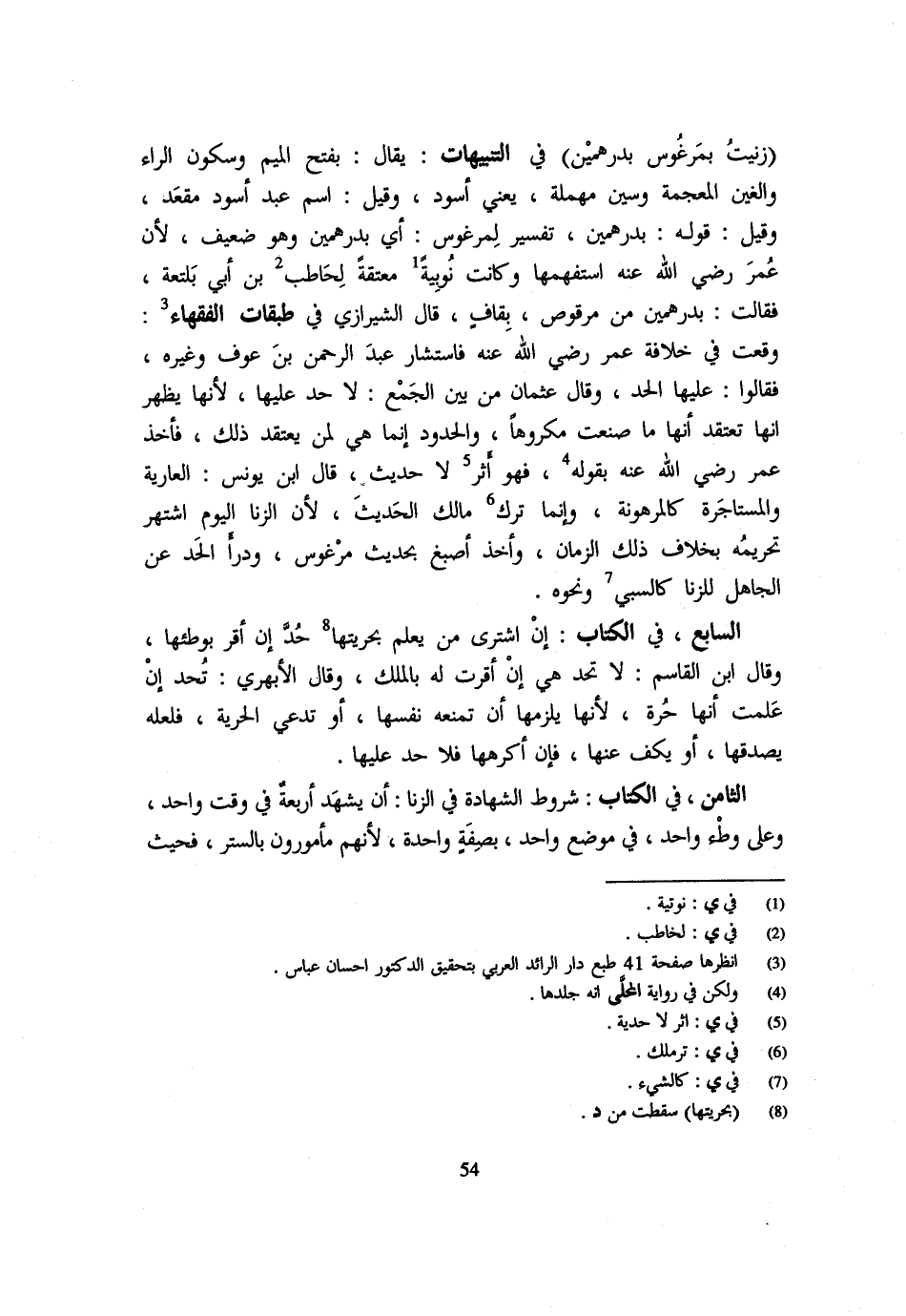 (زَنَيْتُ بِمَرْغُوسٍ بِدِرْهَمَيْنِ) فِي التَّنْبِيهَاتِ يُقَالُ بِفَتْحِ الْمِيمِ وَسُكُونِ الرَّاءِ وَالْغَيْنِ الْمُعْجَمَةِ وَسِينٍ مُهْمَلَةٍ يَعْنِي أَسْوَدَ وَقِيلَ اسْمُ عَبْدٍ أَسْوَدَ مُقْعَدٍ وَقيل قَوْله بِدِرْهَمَيْنِ تَفْسِيرٌ لِمَرْغُوسٍ أَيْ بِدِرْهَمَيْنِ وَهُوَ ضَعِيفٌ لِأَنَّ عُمَرَ رَضِيَ اللَّهُ عَنْهُ اسْتَفْهَمَهَا وَكَانَتْ نُوبِيَّةً مُعْتَقَةً لِحَاطِبِ بْنِ أَبِي بَلْتَعَةَ فَقَالَتْ بِدِرْهَمَيْنِ مِنْ مَرْقُوصٍ بِقَافٍ قَالَ الشِّيرَازِيُّ فِي طَبَقَاتِ الْفُقَهَاءِ وَقَعَتْ فِي خِلَافَةِ عُمَرَ رَضِيَ اللَّهُ عَنْهُ فَاسْتَشَارَ عَبْدَ الرَّحْمَنِ بْنَ عَوْفٍ وَغَيْرَهُ فَقَالُوا عَلَيْهَا الْحَدُّ وَقَالَ عُثْمَانُ مِنْ بَيْنِ الْجَمْعِ لَا حُدَّ عَلَيْهَا لِأَنَّهَا يَظْهَرُ أَنَّهَا تَعْتَقِدُ أَنَّهَا مَا صَنَعَتْ مَكْرُوهًا وَالْحُدُودُ إِنَّمَا هِيَ لِمَنْ يَعْتَقِدُ ذَلِكَ فَأَخَذَ عُمَرُ رَضِيَ اللَّهُ عَنْهُ بِقَوْلِهِ فَهُوَ أَثَرٌ لَا حَدِيثٌ قَالَ ابْنُ يُونُسَ الْعَارِيَةُ وَالْمُسْتَأْجَرَةُ كَالْمَرْهُونَةِ وَإِنَّمَا ترك مَالك الحَدِيث لِأَن الزِّنَا الْيَوْمَ اشْتُهِرَ تَحْرِيمُهُ بِخِلَافِ ذَلِكَ الزَّمَانِ وَأَخَذَ أَصْبَغُ بِحَدِيثِ مَرْغُوسٍ وَدَرَأَ الْحَدَّ عَنِ الْجَاهِلِ للزِّنَا كَالسَّبِيِّ وَنَحْوِهِ السَّابِعُ فِي الْكِتَابِ إِنِ اشْتَرَى مَنْ يَعْلَمُ بِحُرِّيَّتِهَا حُدَّ إِنْ أَقَرَّ بِوَطْئِهَا وَقَالَ ابْنُ الْقَاسِمِ لَا تُحَدُّ هِيَ إِنْ أَقَرَّتْ لَهُ بِالْمِلْكِ وَقَالَ الْأَبْهَرِيُّ تُحَدُّ إِنْ عَلِمَتْ أَنَّهَا حُرَّةٌ لِأَنَّهَا يَلْزَمُهَا أَنْ تَمْنَعَهُ نَفْسَهَا أَوْ تَدَّعِيَ الْحُرِّيَّةَ فَلَعَلَّهُ يُصَدِّقُهَا أَوْ يَكُفُّ عَنْهَا فَإِنْ أَكْرَهَهَا فَلَا حَدَّ عَلَيْهَا الثَّامِن فِي الْكتاب شُرُوط الشَّهَادَة فِي الزِّنَا أَن يشْهد أَرْبَعَة فِي وَقت وَاحِد وعَلى وَطْءٍ وَاحِدٍ فِي مَوْضِعٍ وَاحِدٍ بِصِفَةٍ وَاحِدَةٍ لِأَنَّهُمْ مَأْمُورُونَ بِالسَّتْرِ فَحَيْثُ