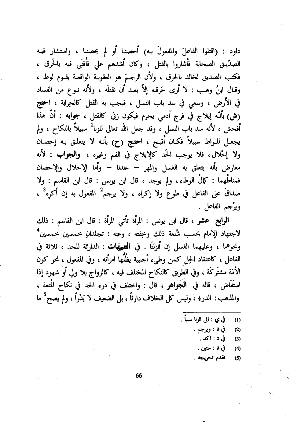 دَاوُدَ (اقْتُلُوا الْفَاعِلَ وَالْمَفْعُولَ بِهِ) أَحْصَنَا أَوْ لَمْ يُحْصِنَا وَاسْتَشَارَ فِيهِ الصِّدِّيقُ الصَّحَابَةَ فَأَشَارُوا بِالْقَتْلِ وَكَانَ أَشَدَّهُمْ عَلِيٌّ فَأَفْتَى فِيهِ بِالْحَرْقِ فَكَتَبَ الصِّدِّيقُ لِخَالِدٍ بِالْحَرْقِ وَلِأَنَّ الرَّجْمَ هُوَ الْعُقُوبَةُ الْوَاقِعَةُ بِقَوْمِ لُوطٍ وَقَالَ ابْنُ وَهْبٍ لَا أرى حرقه إِلَّا بعد أَن نَقْتُلهُ وَلِأَنَّهُ نَوْعٌ مِنَ الْفَسَادِ فِي الْأَرْضِ وَسَعْيٌ فِي سَدِّ بَابِ النَّسْلِ فَيَجِبُ بِهِ الْقَتْلُ كَالْحِرَابَةِ احْتَجَّ (ش) بِأَنَّهُ إِيلَاجٌ فِي فَرَجٍ آدَمِيّ يحرم فَيكون زني كَالْقَتْلِ جَوَابُهُ أَنَّ هَذَا أَفْحَشُ لِأَنَّهُ سَدُّ بَابِ النَّسْل وَقد جعل الله تَعَالَى للزِّنَا سَبِيلًا بِالنِّكَاحِ وَلَمْ يَجْعَلْ لِلِّوَاطِ سَبِيلًا فَكَانَ أَقْبَحَ احْتَجَّ (ح) بِأَنَّهُ لَا يَتَعَلَّقُ بِهِ إِحْصَانٌ وَلَا إِحْلَالٌ فَلَا يُوجِبُ الْحَدَّ كَالْإِيلَاجِ فِي الْفَمِ وَغَيْرِهِ وَالْجَوَابُ لِأَنَّهُ مُعَارَضٌ بِأَنَّهُ يَتَعَلَّقُ بِهِ الْغُسْلُ وَالْمَهْرُ عِنْدَنَا وَأَمَّا الْإِحْلَالُ وَالْإِحْصَانُ فَمَنَاطُهُمَا كَمَالُ الْوَطْءِ وَلَمْ يُوجَدْ قَالَ ابْنُ يُونُسَ قَالَ ابْنُ الْقَاسِمِ وَلَا صَدَاقَ على الْفَاعِل فِي طوع وَلَا إِكْرَاه وَلَا يرْجم الْمَفْعُول بِهِ إِن أكره وَيُرْجَمُ الْفَاعِلُ الرَّابِعَ عَشَرَ قَالَ ابْنُ يُونُسَ الْمَرْأَةُ تَأْتِي الْمَرْأَةَ قَالَ ابْنُ الْقَاسِمِ ذَلِكَ لِاجْتِهَادِ الْإِمَامِ بِحَسَبِ شُنْعَةِ ذَلِكَ وَخِفَّتِهِ وَعَنْهُ تُجْلَدَانِ خَمْسِينَ خَمْسِينَ وَنَحْوَهُمَا وَعَلَيْهِمَا الْغُسْلُ إِنْ أَنْزَلَتَا فِي التَّنْبِيهَاتِ الدَّارِئَةُ لِلْحَدِّ ثَلَاثَةٌ فِي الْفَاعِلِ كَاعْتِقَادِ الْحِلِّ كَمَنْ وَطِئَ أَجْنَبِيَّةً يَظُنُّهَا امْرَأَتَهُ وَفِي الْمَفْعُولِ نَحْوَ كَوْنِ الْأَمَةِ مُشْتَرَكَةً وَفِي الطَّرِيقِ كَالنِّكَاحِ الْمُخْتَلَفِ فِيهِ كَالزَّوَاجِ بِلَا وَلِيٍّ أَوْ شُهُودٍ إِذَا اسْتَفَاضَ قَالَهُ فِي الْجَوَاهِرِ قَالَ وَاخْتُلِفَ فِي دَرْءِ الْحَدِّ فِي نِكَاحِ الْمُتْعَةِ وَالْمَذْهَبُ الدَّرْءُ وَلَيْسَ كُلُّ الْخِلَافِ دَارِئًا بَلِ الضَّعِيفُ لَا يَدْرَأُ وَلَمْ يَصِحَّ مَا