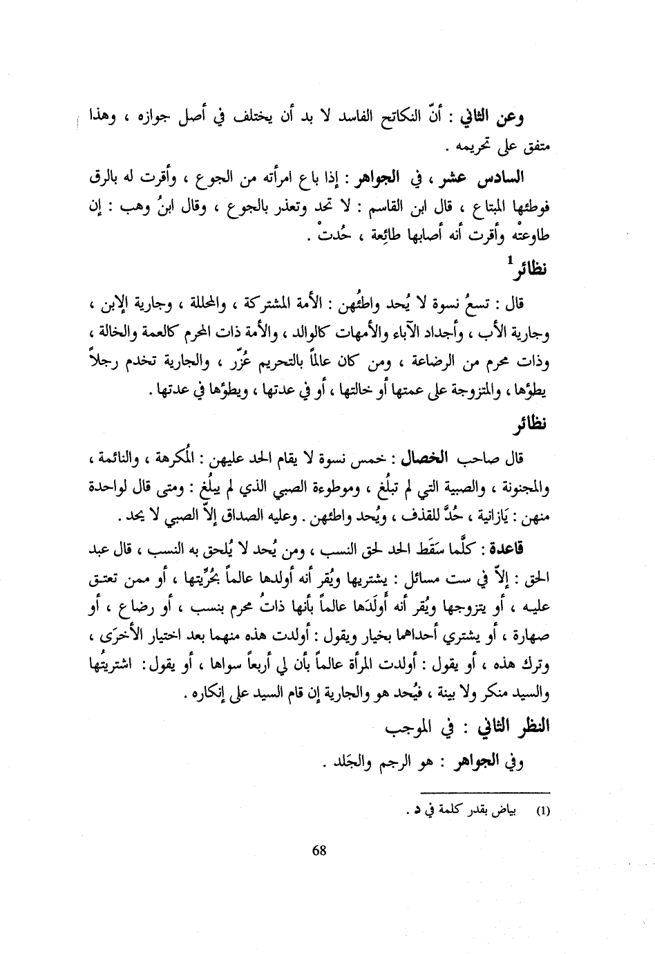نَظَائِرُ قَالَ صَاحِبُ الْخِصَالِ خَمْسُ نِسْوَةٍ لَا يُقَامُ الْحَدُّ عَلَيْهِنَّ الْمُكْرَهَةُ وَالنَّائِمَةُ وَالْمَجْنُونَةُ وَالصَّبِيَّةُ الَّتِي لَمْ تَبْلُغُ وَمَوْطُوءَةُ الصَّبِيِّ الَّذِي لَمْ يَبْلُغْ وَمَتَى قَالَ لِوَاحِدَةٍ مِنْهُنَّ يَا زَانِيَةُ حُدَّ لِلْقَذْفِ وَيُحَدُّ وَاطِئُهُنَّ وَعَلَيْهِ الصَّدَاقُ إِلَّا الصَّبِيَّ لَا يُحَدُّ قَاعِدَةٌ كُلَّمَا سَقَطَ الْحَدُّ لَحِقَ النَّسَبُ وَمَنْ يُحَدُّ لَا يُلْحَقُ بِهِ النَّسَبُ قَالَ عَبْدُ الْحَقِّ إِلَّا فِي سِتِّ مَسَائِلَ يَشْتَرِيهَا وَيُقِرُّ أْنَهُ أُوَلَدَهَا عَالِمًا بَحُرِيَّتِهَا أَوْ مِمَّنْ تُعْتَقُ عَلَيْهِ أَو يَتَزَوَّجهَا ويقر أَنه أولدها عَالما بِأَنَّهُ ذَاتُ مَحْرَمٍ بِنَسَبٍ أَوْ رَضَاعٍ أَوْ صِهَارَةٍ أَو يَشْتَرِي إِحْدَاهمَا بِخِيَارٍ وَيَقُولُ أَوْلَدْتُ هَذِهِ مِنْهُمَا بَعْدَ اخْتِيَارِ الْأُخْرَى وَتَرْكِ هَذِهِ أَوْ يَقُولُ أَوَلَدْتُ الْمَرْأَةَ عَالِمًا بِأَنَّ لِي أَرْبَعًا سِوَاهَا أَوْ يَقُولُ اشْتَرَيْتُهَا وَالسَّيِّدُ مُنْكِرٌ وَلَا بَيِّنَةَ فَيُحَدُّ هُوَ وَالْجَارِيَة إِن قَامَ السَّيِّدُ عَلَى إِنْكَارِهِ النَّظَرُ الثَّانِي فِي الْمُوجِبِ وَفِي الْجَوَاهِرِ هُوَ الرَّجْمُ وَالْجَلْدُ