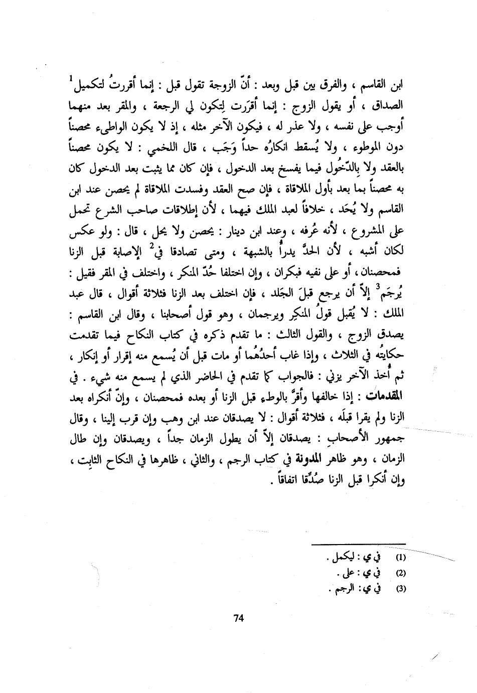 ابْنُ الْقَاسِمِ وَالْفَرْقُ بَيْنَ قَبْلُ وَبَعْدُ أَنَّ الزَّوْجَةَ تَقُولُ قَبْلُ إِنَّمَا أَقْرَرْتُ لِتَكْمِيلِ الصَّدَاقِ أَو يَقُول الزَّوْجُ إِنَّمَا أَقْرَرْتُ لِتَكُونَ لِيَ الرَّجْعَةُ وَالْمُقِرُّ بَعْدُ مِنْهُمَا أَوْجَبَ عَلَى نَفْسِهِ وَلَا عُذْرَ لَهُ فَيَكُونُ الْآخَرُ مِثْلَهُ إِذْ لَا يَكُونُ الْوَاطِئُ مُحْصَنًا دُونَ الْمَوْطُوءِ وَلَا يُسْقِطُ إِنْكَارُهُ حداُ وَجب قَالَ اللخعي لَا يَكُونُ مُحْصَنًا بِالْعَقْدِ وَلَا بِالدُّخُولِ فِيمَا يُفْسَخُ بَعْدَ الدُّخُولِ فَإِنْ كَانَ مِمَّا يَثْبُتُ بَعْدَ الدُّخُولِ كَانَ بِهِ مُحْصَنًا بِمَا بَعْدُ بِأَوَّلِ الْمُلَاقَاةِ فَإِنْ صَحَّ الْعَقْدُ وَفَسَدَتِ الْمُلَاقَاةُ لَمْ يُحْصَنْ عِنْدَ ابْنِ الْقَاسِمِ وَلَا يُحَدُّ خِلَافًا لِعَبْدِ الْمَلِكِ فِيهِمَا لِأَنَّ إِطْلَاقَاتِ صَاحِبِ الشَّرْعِ تُحْمَلُ عَلَى الْمَشْرُوعِ لِأَنَّهُ عَرَفَهُ وَعِنْدَ ابْنِ دِينَارٍ يُحَصَنُ وَلَا يُحَلُّ قَالَ وَلَوْ عَكَسَ لَكَانَ أَشْبَهَ لِأَنَّ الْحَدَّ يُدْرَأُ بِالشُّبْهَةِ وَمَتى تَصَادقا فِي الْإِصَابَة قبل الزِّنَا فَمُحْصَنَانِ أَوْ عَلَى نَفْيِهِ فَبِكْرَانِ وَإِنِ اخْتَلَفَا حُدَّ الْمُنْكِرُ وَاخْتُلِفَ فِي الْمُقِرِّ فَقِيلَ يُرْجَمُ إِلَّا أَنْ يَرْجِعَ قَبْلَ الْجَلْدِ فَإِنِ اخْتُلِفَ بعد الزِّنَا فَثَلَاثَةُ أَقْوَالٍ قَالَ عَبْدُ الْمَلِكِ لَا يُقْبَلُ قَوْلُ الْمُنْكِرِ وَيُرْجَمَانِ وَهُوَ قَوْلُ أَصْحَابِنَا وَقَالَ ابْنُ الْقَاسِمِ يُصَدَّقُ الزَّوْجُ وَالْقَوْلُ الثَّالِثُ مَا تَقَدَّمَ ذِكْرُهُ فِي كِتَابِ النِّكَاحِ فِيمَا تَقَدَّمَتْ حِكَايَتُهُ فِي الثَّلَاثِ وَإِذَا غَابَ أَحَدُهُمَا أَوْ مَاتَ قَبْلَ أَنْ يُسْمَعَ مِنْهُ إِقْرَارٌ أَوْ انكار ثمَّ أَخذ الْأَخْذ لِأَنِّي فَالْجَوَابُ كَمَا تَقَدَّمَ فِي الْحَاضِرِ الَّذِي لَمْ يُسْمَعْ مِنْهُ شَيْءٌ فِي الْمُقَدِّمَاتِ إِذَا خَالَفَهَا وَأقر بِالْوَطْءِ قبل الزِّنَا أَو بعده فمحصنان وَإِن أنكراه بعد الزِّنَا وَلَمْ يُقِرَّا قَبْلَهُ فَثَلَاثَةُ أَقْوَالٍ لَا يُصَدَّقَانِ عِنْدَ ابْنِ وَهْبٍ وَإِنْ قَرُبَ إِلَيْنَا وَقَالَ جُمْهُورُ الْأَصْحَابِ يُصَدَّقَانِ إِلَّا أَنْ يَطُولَ الزَّمَانُ جِدًّا وَيُصَدَّقَانِ وَإِنْ طَالَ الزَّمَانُ وَهُوَ ظَاهِرُ الْمُدَوَّنَةِ فِي كِتَابِ الرَّجْمِ وَالثَّانِي ظَاهِرُهَا فِي النِّكَاح الثَّابِت وَإِن أنكرا قبل الزِّنَا صدقا اتِّفَاقًا