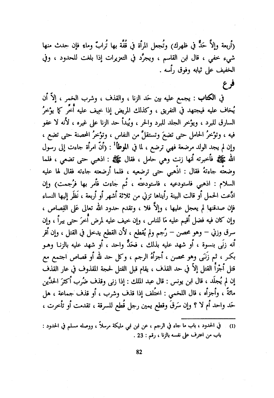 فَرْعٌ فِي الْكِتَابِ يجمع عَلَيْهِ بَين حد الزِّنَا وَالْقَذْفِ وَشُرْبِ الْخَمْرِ إِلَّا أَنْ يُخَافَ عَلَيْهِ فيجتهد فِي التَّفْرِيقِ وَكَذَلِكَ الْمَرِيضُ إِذَا خِيفَ عَلَيْهِ أُخِّرَ كَمَا يُؤَخَّرُ السَّارِقُ لِلْبَرْدِ وَيُؤَخَّرُ الْجَلْدُ للبرد وَالْحر وَيبدأ حد الزِّنَا عَلَى غَيْرِهِ لِأَنَّهُ لَا عَفْوَ فِيهِ وَتُؤَخَّرُ الْحَامِلُ حَتَّى تَضَعَ وَتَسْتَقِلَّ مِنَ النِّفَاسِ وَتُؤَخَّرُ الْمُحْصَنَةُ حَتَّى تَضَعَ وَإِنْ لَمْ يَجِدِ الْوَلَدُ مُرْضِعَةً فَهِيَ تُرْضِعُ لِمَا فِي الْمُوَطَّأِ (أَنَّ امْرَأَةً جَاءَتْ إِلَى رَسُولِ اللَّهِ - صَلَّى اللَّهُ عَلَيْهِ وَسَلَّم َ - فَأَخْبَرَتْهُ أَنَّهَا زَنَتْ وَهِيَ حَامِلٌ فَقَالَ - صَلَّى اللَّهُ عَلَيْهِ وَسَلَّم َ - اذْهَبِي حَتَّى تَضَعِي فَلَمَّا وَضَعَتْهُ جَاءَتْهُ فَقَالَ اذْهَبْ حَتَّى ترضعيه لفما أَرْضَعَتْه جَاءَتْهُ فَقَالَ لَهَا عَلَيْهِ السَّلَام اذْهَبْ فَاسْتَوْدِعِيهِ فَاسْتَوْدَعَتْهُ ثُمَّ جَاءَتْ فَأَمَرَ بِهَا فَرُجِمَتْ) وَإِنِ ادَّعَتِ الْحَمْلَ أَوْ قَالَتِ الْبَيِّنَةُ رَأَيْنَاهَا تَزْنِي مِنْ ثَلَاثَةِ أَشْهُرٍ أَوْ أَرْبَعَةٍ نَظَرَ إِلَيْهَا النِّسَاءُ فَإِنْ صَدَّقْنَهَا لَمْ يُعَجَّلْ عَلَيْهَا وَإِلَّا فَلَا وَتُقَدَّمُ حُدُودُ اللَّهِ تَعَالَى عَلَى الْقِصَاصِ وَإِنْ كَانَ فِيهِ فَضْلٌ أُقِيمَ عَلَيْهِ مَا لِلنَّاسِ وَإِنْ خِيفَ عَلَيْهِ لِمَرَضٍ أُخِّرَ حَتَّى يَبْرَأَ وَإِنْ سَرَقَ وَزَنَى وَهُوَ مُحْصَنٌ رُجِمَ وَلَمْ يُقْطَعْ لِأَنَّ الْقَطْعَ يَدْخُلُ فِي الْقَتْلِ وَإِنْ أَقَرَّ أَنَّهُ زَنَى بِنِسْوَةٍ أَوْ شُهِدَ عَلَيْهِ بِذَلِكَ فَحَدٌّ وَاحِدٌ أَوْ شُهِدَ عَلَيْهِ بِالزِّنَا وَهُوَ بِكْرٌ ثُمَّ زَنَى وَهُوَ مُحْصَنٌ أَجَزَأَهُ الرَّجْمُ وَكُلُّ حَدٍّ لِلَّهِ أَوْ قِصَاصٍ اجْتَمَعَ مَعَ قَتْلٍ أَجَزَأَ الْقَتْلُ إِلَّا فِي حَدِّ الْقَذْفِ يُقَامُ قَبْلَ الْقَتْلِ لِحُجَّةِ الْمَقْذُوفِ فِي عَارِ الْقَذْفِ إِنْ لَمْ يُجْلَدْ قَالَ ابْنُ يُونُسَ قَالَ عَبْدُ الْمَلِكِ إِذَا زَنَى وَقَذَفَ ضُرِبَ أَكْثَرَ الْحَدَّيْنِ مِائَةً وَأَجْزَأَهُ قَالَ اللَّخْمِيُّ اخْتُلِفَ إِذَا قَذَفَ وَشَرِبَ أَوْ قَذَفَ جَمَاعَةً هَلْ حَدٌّ وَاحِدٌ أَمْ لَا وَإِنْ سَرَقَ وَقَطَعَ يَمِينَ رَجُلٍ قُطِعَ لِلسَّرِقَةِ تَقَدَّمَتْ أَوْ تَأَخَّرت