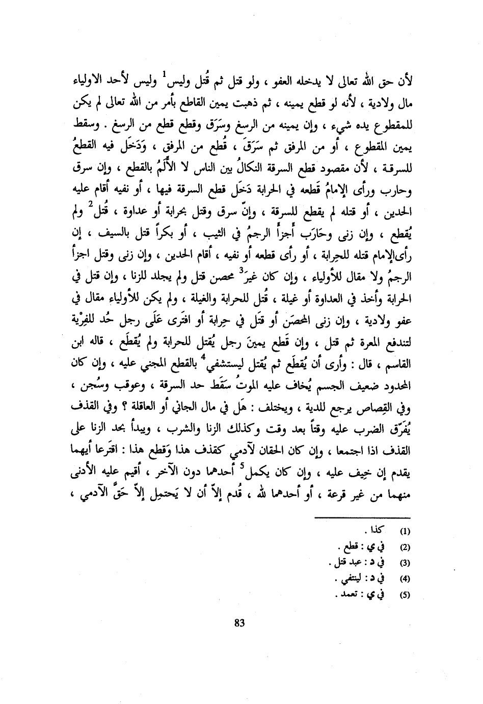 لِأَنَّ حَقَّ اللَّهِ تَعَالَى لَا يَدْخُلُهُ الْعَفْوُ وَلَو قتل ثمَّ قتل وَلَيْسَ وَلَيْسَ لأحد الْأَوْلِيَاء مَا وَلَا دِيَةٌ لِأَنَّهُ لَوْ قَطَعَ يَمِينَهُ ثُمَّ ذَهَبَتْ يَمِينُ الْقَاطِعِ بِأَمْرٍ مِنَ اللَّهِ تَعَالَى لَمْ يَكُنْ لِلْمَقْطُوعِ يَدُهُ شَيْءٌ وَإِنَّ يَمِينَهُ من الرسغ وسرق وَقَطَعَ قُطِعَ مِنَ الرُّسْغِ وَسَقَطَ يَمِينُ الْمَقْطُوعِ أَوْ مِنَ الْمِرْفَقِ ثُمَّ سَرَقَ قُطِعَ مِنَ الْمِرْفَقِ وَدَخَلَ فِيهِ الْقَطْعُ لِلسَّرِقَةِ لِأَنَّ مَقْصُودَ قَطْعِ السَّرِقَةِ النَّكَالُ بَيْنَ النَّاسِ لَا الْأَلَمُ بِالْقَطْعِ وَإِنْ سَرَقَ وَحَارَبَ وَرَأَى الْإِمَامُ قَطْعَهُ فِي الْحِرَابَةِ دَخْلَ قَطْعُ السَّرِقَةِ فِيهَا أَوْ نَفْيَهُ أَقَامَ عَلَيْهِ الْحَدَّيْنِ أَوْ قَتْلَهُ لَمْ يُقْطَعْ لِلسَّرِقَةِ وَإِنْ سَرَقَ وَقَتَلَ بِحِرَابَةٍ أَوْ عَدَاوَةٍ قُتِلَ وَلَمْ يُقْطَعْ وَإِنْ زَنَى وَحَارَبَ أَجَزَأَ الرَّجْمُ فِي الثَّيِّبِ أَوْ بِكْرًا قُتِلَ بِالسَّيْفِ إِنْ رَأَى الْإِمَامُ قَتْلَهُ لِلْحِرَابَةِ أَوْ رَأَى قَطْعَهُ أَوْ نَفْيَهُ أَقَامَ الْحَدَّيْنِ وَإِنَّ زَنَى وَقَتَلَ أَجَزَأَ الرَّجْمُ وَلَا مَقَالَ لِلْأَوْلِيَاءِ وَإِنْ كَانَ غَيْرُ مُحْصَنٍ قُتِلَ وَلَمْ يُجْلَدْ للزِّنَا وَإِنْ قُتِلَ فِي الْحِرَابَةِ وَأُخِذَ فِي الْعَدَاوَةِ أَوْ غِيلَةً قُتِلَ لِلْحِرَابَةِ وَالْغِيلَةِ وَلَمْ يَكُنْ لِلْأَوْلِيَاءِ مَقَالٌ فِي عَفْوٍ وَلَا دِيَةٍ وَإِنْ زَنَى الْمُحْصَنُ أَوْ قَتَلَ فِي حِرَابَةٍ أَوِ افترى على رجل حد للفرية لِتَنْدَفِعَ الْمَعَرَّةُ ثُمَّ قُتِلَ وَإِنْ قَطْعَ يَمِينَ رجل يقتل لِلْحِرَابَةِ وَلَمْ يُقْطَعْ قَالَهُ ابْنُ الْقَاسِمِ قَالَ وَأَرَى أَنْ يُقْطَعَ ثُمَّ يُقْتَلَ لِيَسْتَشْفِيَ بِالْقَطْعِ الْمَجْنِيُّ عَلَيْهِ وَإِنْ كَانَ الْمَحْدُودُ ضَعِيفَ الْجِسْمِ يُخَافُ عَلَيْهِ الْمَوْتُ سَقَطَ حَدُّ السَّرِقَةِ وَعُوقِبَ وسحن وَفِي الْقِصَاصِ يُرْجَعُ لِلدِّيَةِ وَيُخْتَلَفُ هَلْ فِي مَالِ الْجَانِي أَوِ الْعَاقِلَةِ وَفِي الْقَذْفِ يُفَرَّقُ الضَّرْب عَلَيْهِ وقتا بعد وَقت وَكَذَلِكَ الزِّنَا وَالشرب وَيبدأ بِحَدّ الزِّنَا عَلَى الْقَذْفِ إِذَا اجْتَمَعَا وَإِنَّ كَانَ الْحَقَّانِ لِآدَمِيٍّ كَقَذْفِ هَذَا وَقَطْعِ هَذَا اقْتَرَعَا أَيُّهُمَا يُقَدَّمُ إِنْ خِيفَ عَلَيْهِ وَإِنْ كَانَ يُكْمِلُ أَحَدُهُمَا دُونَ الْآخَرِ أُقِيمُ عَلَيْهِ الْأَدْنَى مِنْهُمَا مِنْ غَيْرِ قُرْعَةٍ أَوْ أَحَدُهُمَا لِلَّهِ قُدِّمَ غلا أَن لَا يَحْتَمِلَ إِلَّا حَقَّ الْآدَمِيِّ