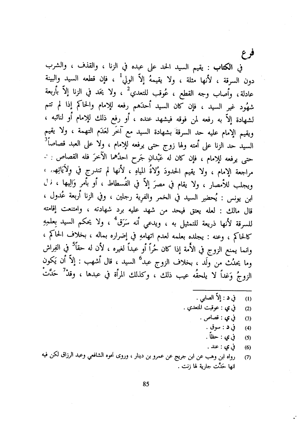فَرْعٌ فِي الْكِتَابِ يُقِيمُ السَّيِّدُ الْحَدَّ عَلَى عَبده فِي الزِّنَا وَالْقَذْفِ وَالشُّرْبِ دُونَ السَّرِقَةِ لِأَنَّهَا مُثْلَةٌ وَلَا يقيمه إِلَّا الْوَلِيُّ فَإِنْ قَطْعَهُ السَّيِّدُ وَالْبَيِّنَةُ عَادِلَةٌ وَأَصَابَ وَجْهَ الْقَطْعِ عُوقِبَ لِلتَّعَدِّي وَلَا يُحَدُّ فِي الزِّنَا إِلَّا بِأَرْبَعَةِ شُهُودٍ غَيْرَ السَّيِّدِ فَإِنْ كَانَ السَّيِّدُ أَحَدَهُمْ رَفَعَهُ لِلْإِمَامِ وَالْحَاكِمِ إِذَا لَمْ تتمّ لشهادة إِلَّا بِهِ رَفْعَهُ لِمَنْ فَوْقَهُ فَيَشْهَدُ عِنْدَهُ أَوْ رَفَعَ ذَلِكَ لِلْإِمَامِ أَوْ لِنَائِبِهِ وَيُقِيمُ الْإِمَامُ عَلَيْهِ حَدَّ السَّرِقَةِ بِشَهَادَةِ السَّيِّدِ مَعَ آخَرَ لِعَدَمِ التُّهْمَةِ وَلَا يُقِيمُ السَّيِّدُ حَدَّ الزِّنَا عَلَى أَمَتِهِ وَلَهَا زَوْجٌ حَتَّى يَرْفَعَهُ لِلْإِمَامِ وَلَا عَلَى الْعَبْدِ قَصَاصًا حَتَّى يَرْفَعَهُ لِلْإِمَامِ فَإِنْ كَانَ لَهُ عَبْدَانِ جَرَحَ أَحَدُهُمَا الْآخَرَ فَلهُ الْقصاص مُرَاجَعَةِ الْإِمَامِ وَلَا يُقِيمُ الْحُدُودَ وُلَاةُ الْمِيَاهِ لِأَنَّهَا لَمْ تَنْدَرِجْ فِي وِلَايَاتِهِمْ وَيُجْلَبُ لِلْأَمْصَارِ وَلَا يُقَامُ فِي مِصْرَ إِلَّا فِي الْفُسْطَاطِ أَو بِأَمْر واليها قَالَ أَبُو يُونُسَ يُحْضِرُ السَّيِّدُ فِي الْخَمْرِ وَالْفِرْيَةِ رَجُلَيْنِ وَفِي الزِّنَا أَرْبَعَة عدُول قَالَ مَالِكٌ لَعَلَّهُ يُعْتَقُ فَيُحَدُّ مَنْ شَهِدَ عَلَيْهِ برد شَهَادَته وامتنعت إِقَامَته فللسرقة لِأَنَّهَا ذَرِيعَةٌ لِلتَّمْثِيلِ بِهِ وَيَدَّعِي أَنَّهُ سَرَقَ وَلَا يحكم السَّيِّد بِعِلْمِهِ كَالْحكمِ وَعَنْهُ يَجْلِدُهُ بِعِلْمِهِ لِعَدَمِ اتِّهَامِهِ فِي إِضْرَارِهِ بِمَالِهِ بِخِلَافِ الْحَاكِمِ وَإِنَّمَا يُمْنَعُ الزَّوْجُ فِي الْأَمَةِ إِذَا كَانَ حُرًّا أَوْ عَبْدًا لِغَيْرِهِ لِأَنَّ لَهُ حَقًّا فِي الْفِرَاشِ وَمَا يَحَدُثُ مِنْ وَلَدٍ بِخِلَافِ الزَّوْجِ عَبْدِ السَّيِّدِ قَالَ أَشْهَبُ إِلَّا أَنْ يَكُونَ الزَّوْجُ وَغْدًا لَا يَلْحَقُهُ عَيْبُ ذَلِكَ وَكَذَلِكَ الْمَرْأَةُ فِي عَبْدِهَا وَقد حدت