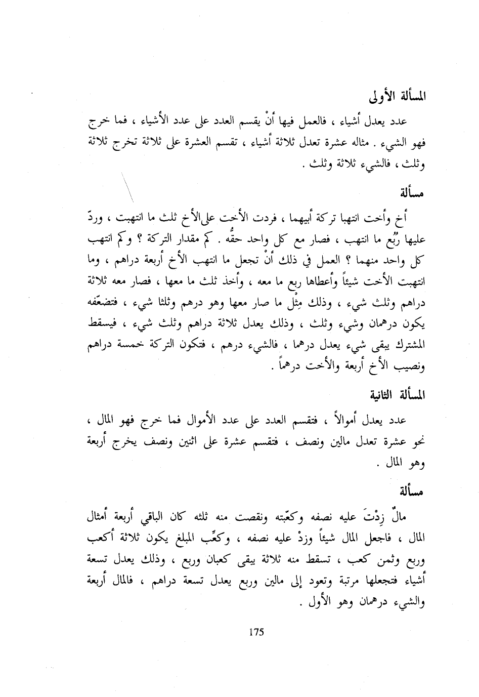 عَدَدٌ يَعْدِلُ أَشْيَاءَ فَالْعَمَلُ فِيهَا أَن يقسم الْعدَد على عدد الْأَشْيَاءِ فَمَا خَرَجَ فَهُوَ الشَّيْءُ مِثَالُهُ عَشَرَةٌ تَعْدِلُ ثَلَاثَةَ أَشْيَاءَ تَقْسِمُ الْعَشَرَةَ عَلَى ثَلَاثَةٍ تَخْرُجُ ثَلَاثَةٌ وَثُلُثٌ فَالشَّيْءُ ثَلَاثَةٌ وَثُلُثٌ